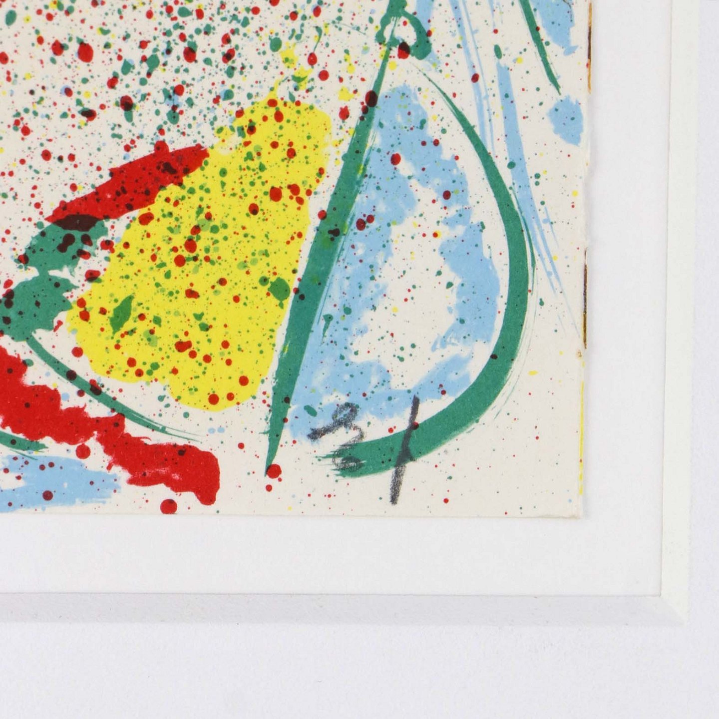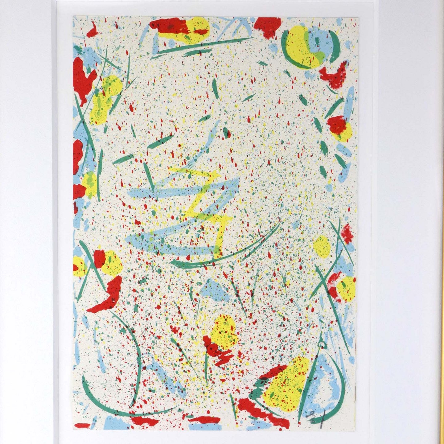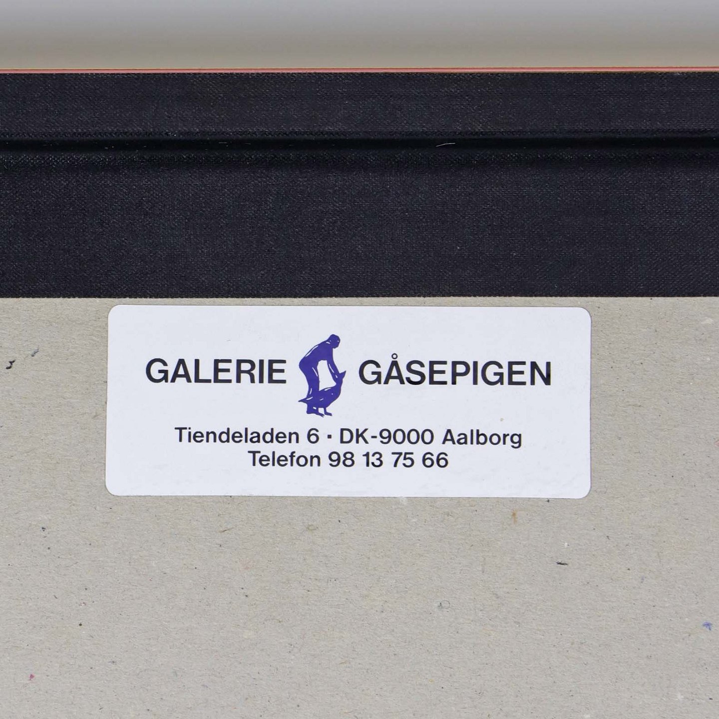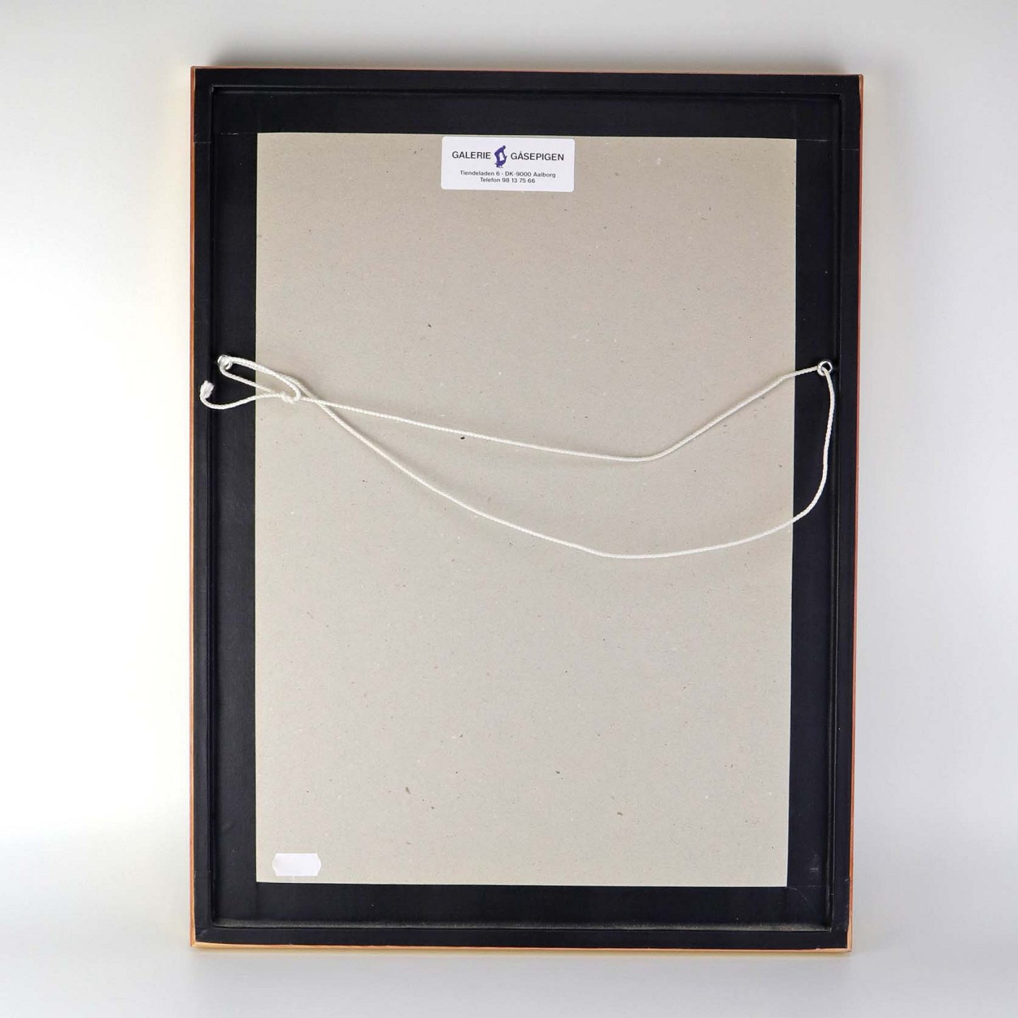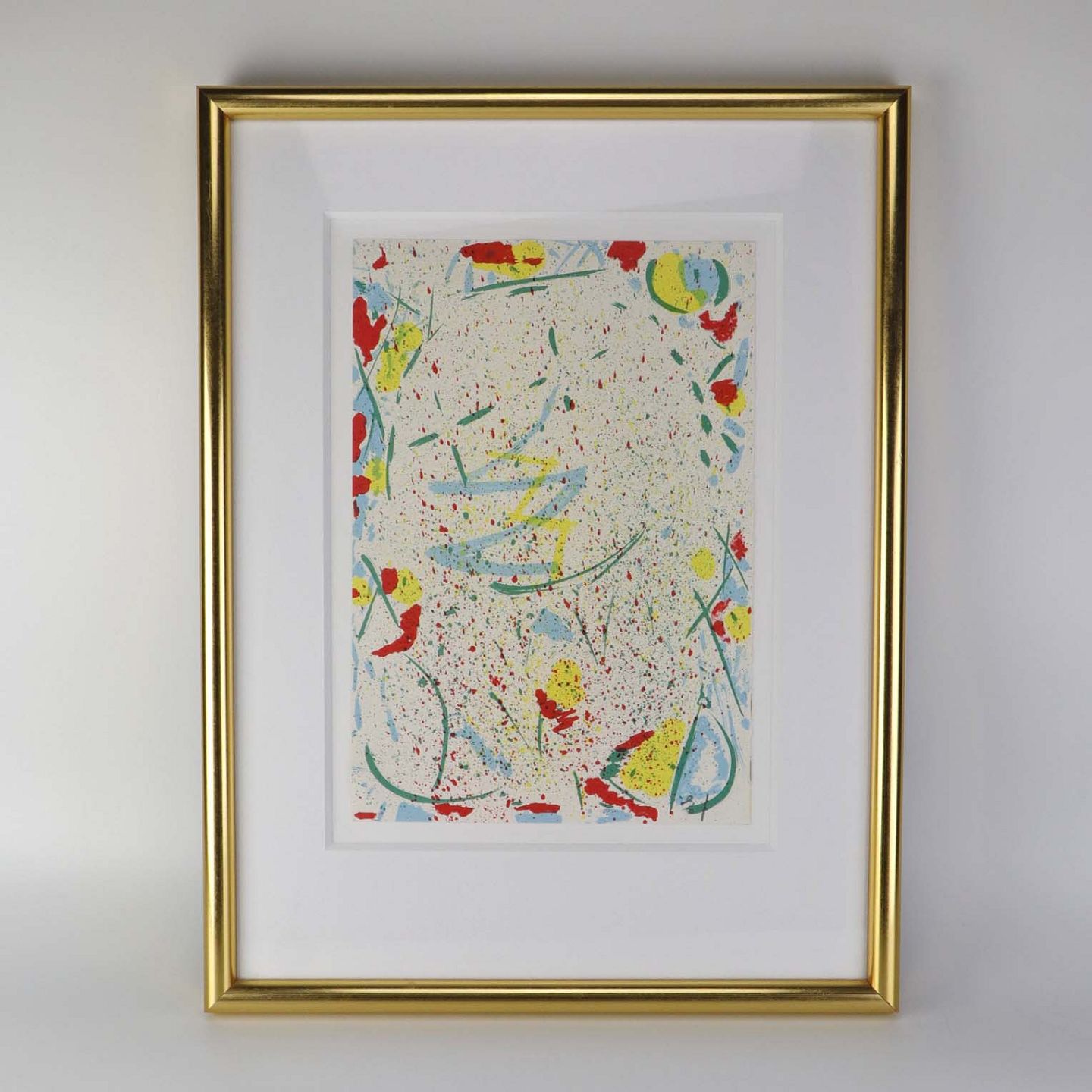 Indrammet litografi med passepartout i guldmalet træramme med abstrakt prikket motiv i røde, gule og blå farver. Litografiet er ikke nummereret.Kunstner Egill Jacobsen (1910-1998)