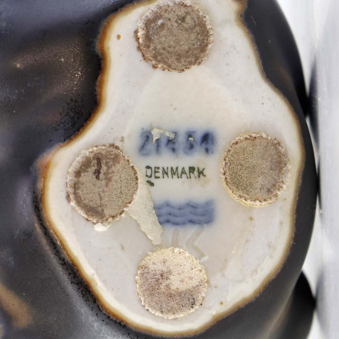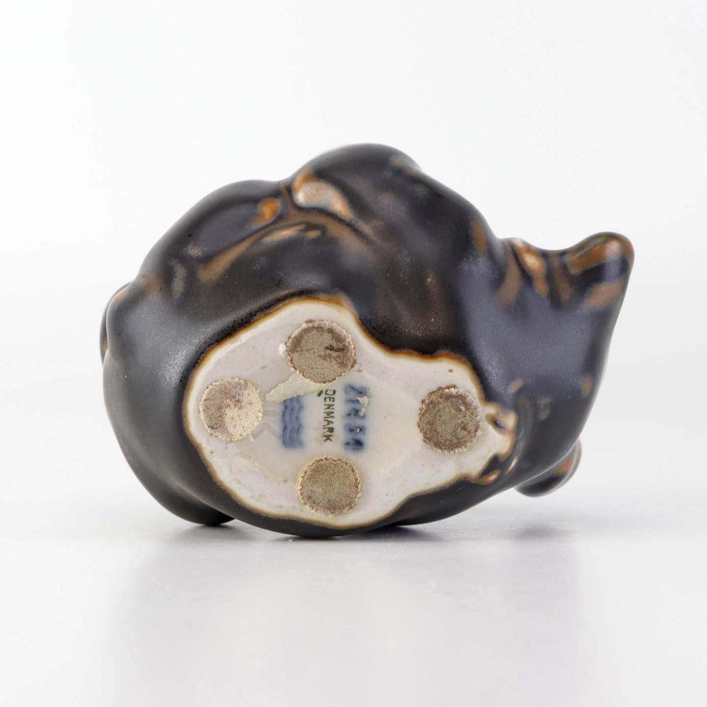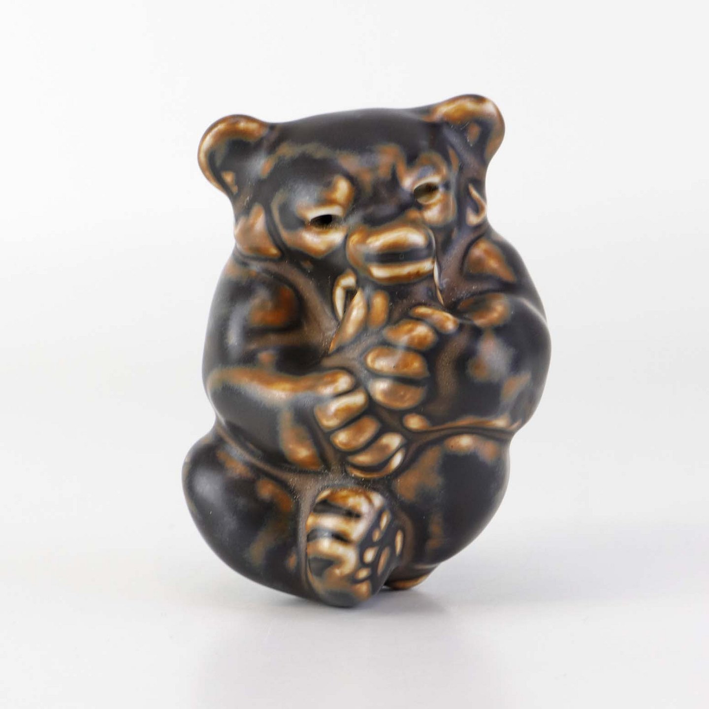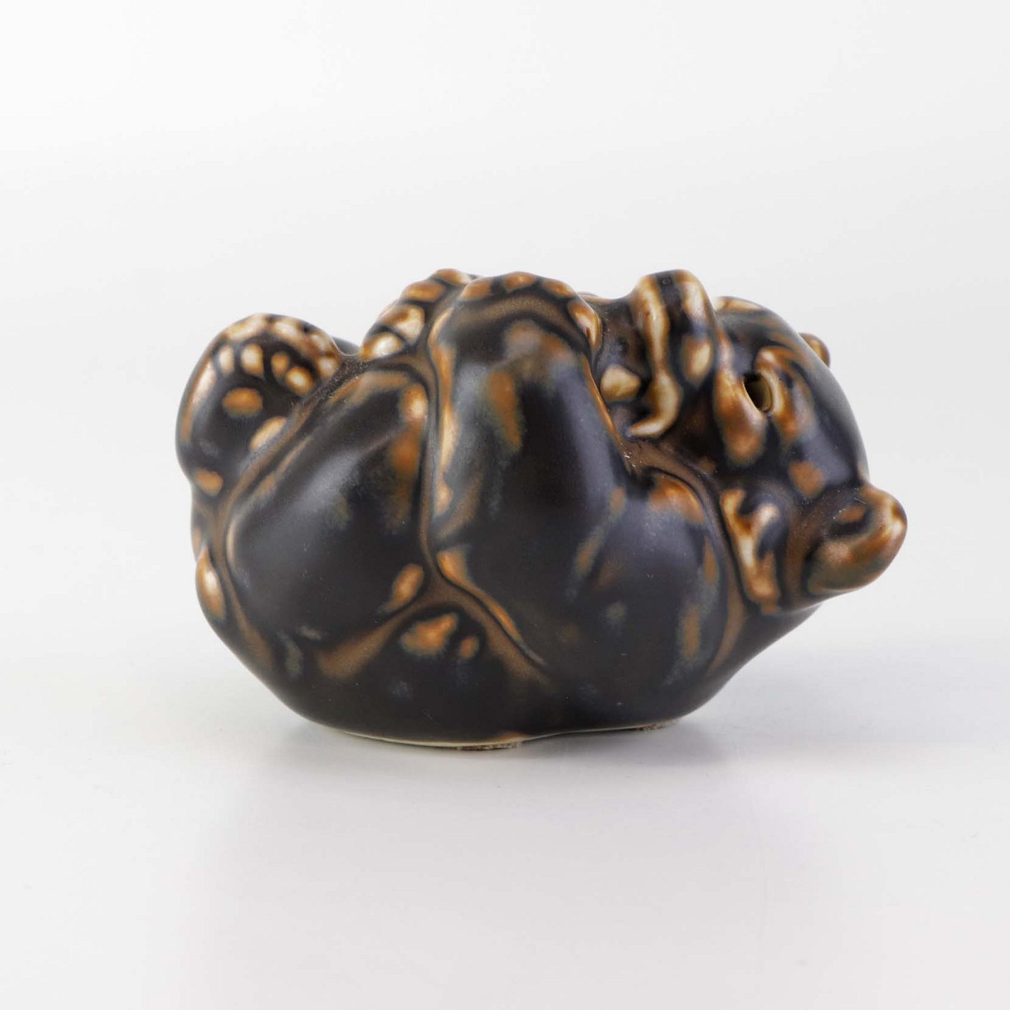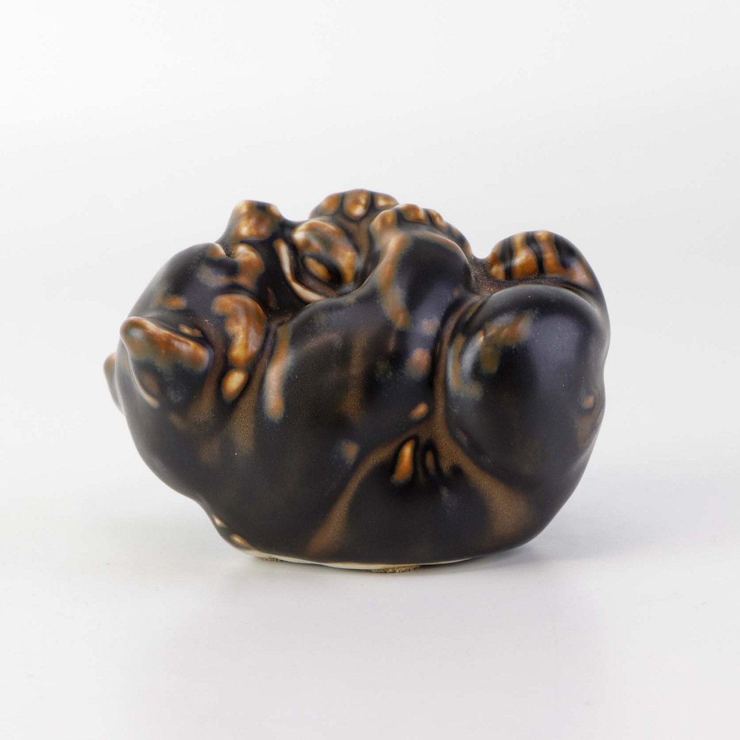 Figur i brunglaseret stentøj med motiv af liggende bjørneunge med pote i munden. Nr. 21434Formgiver Knud Kyhn (1880-1969)