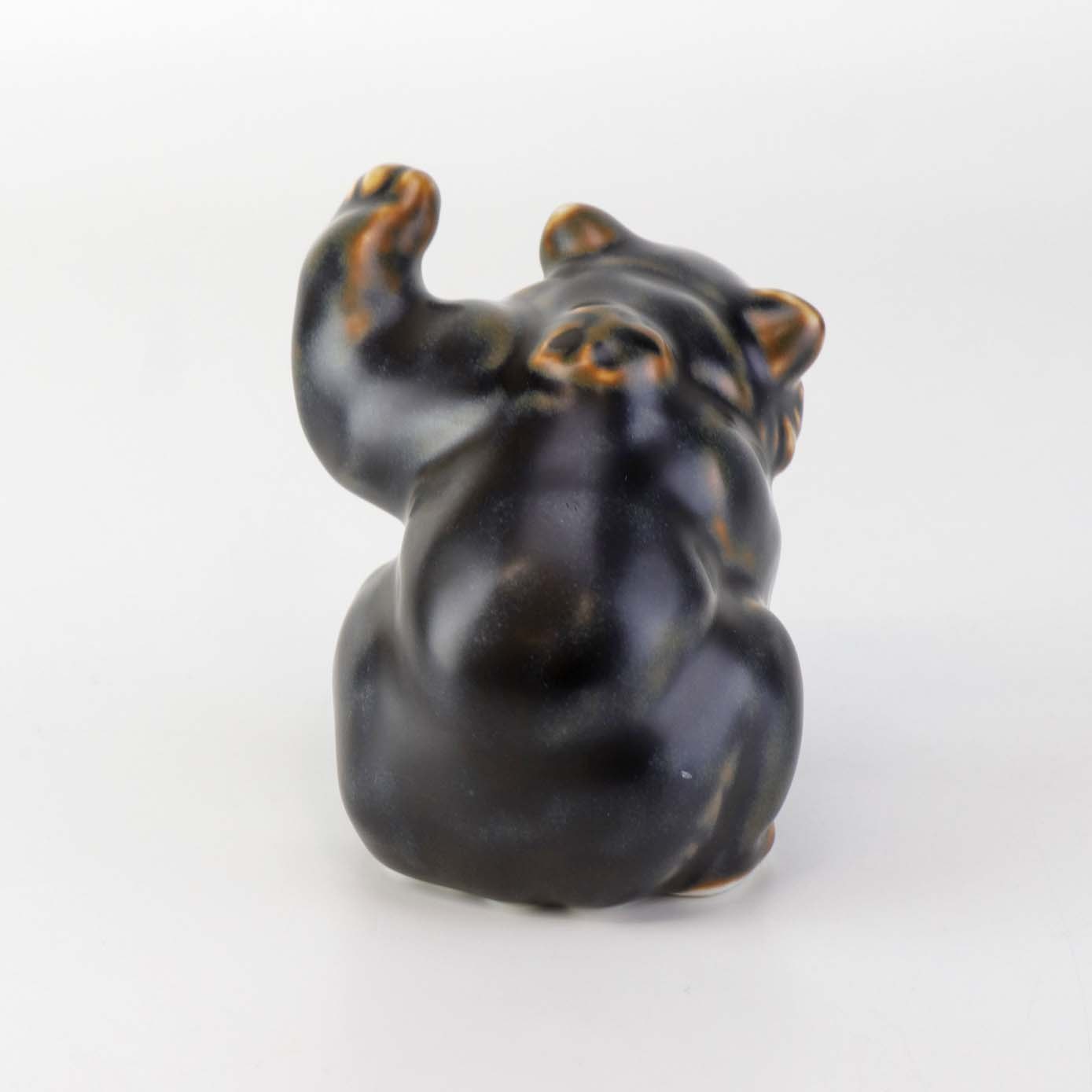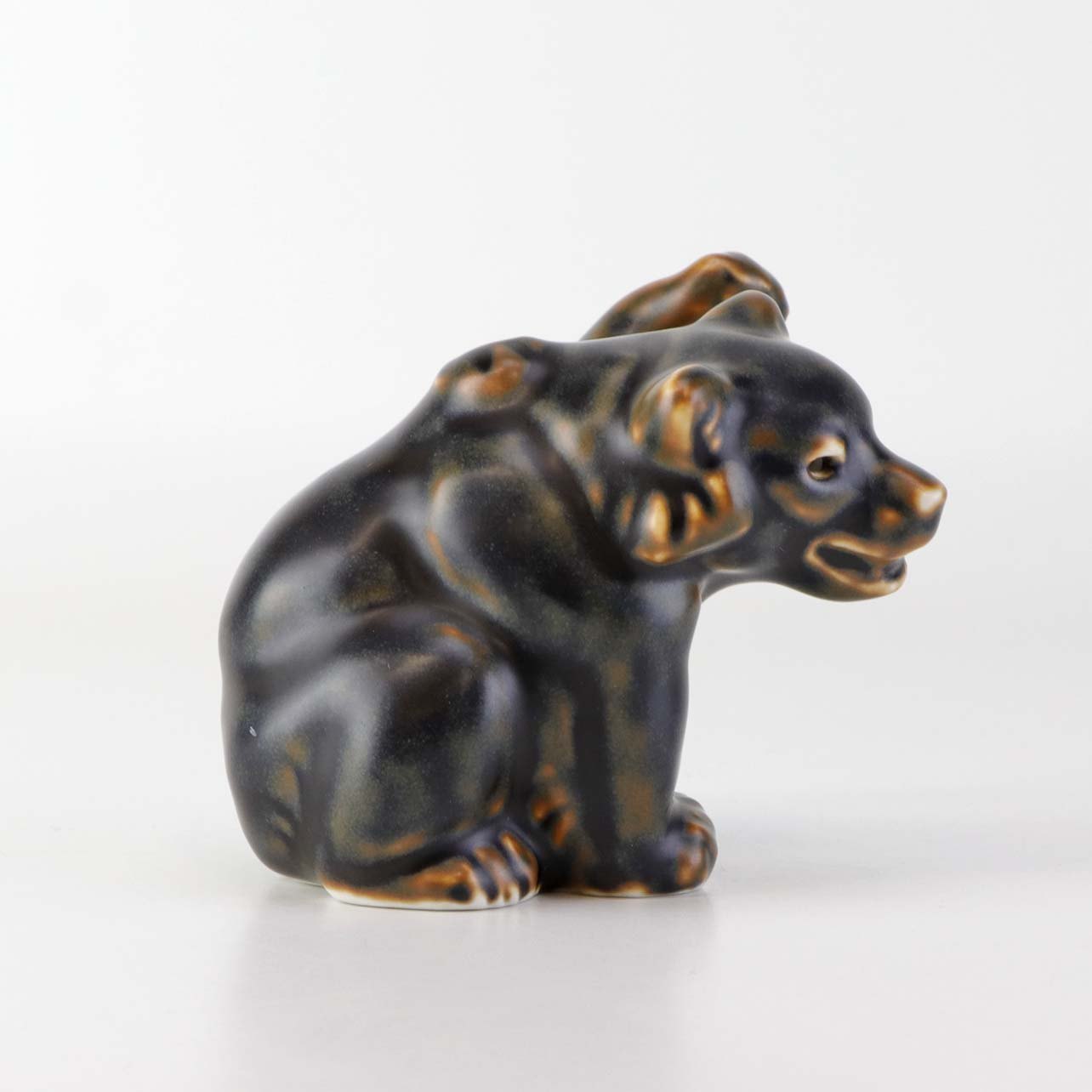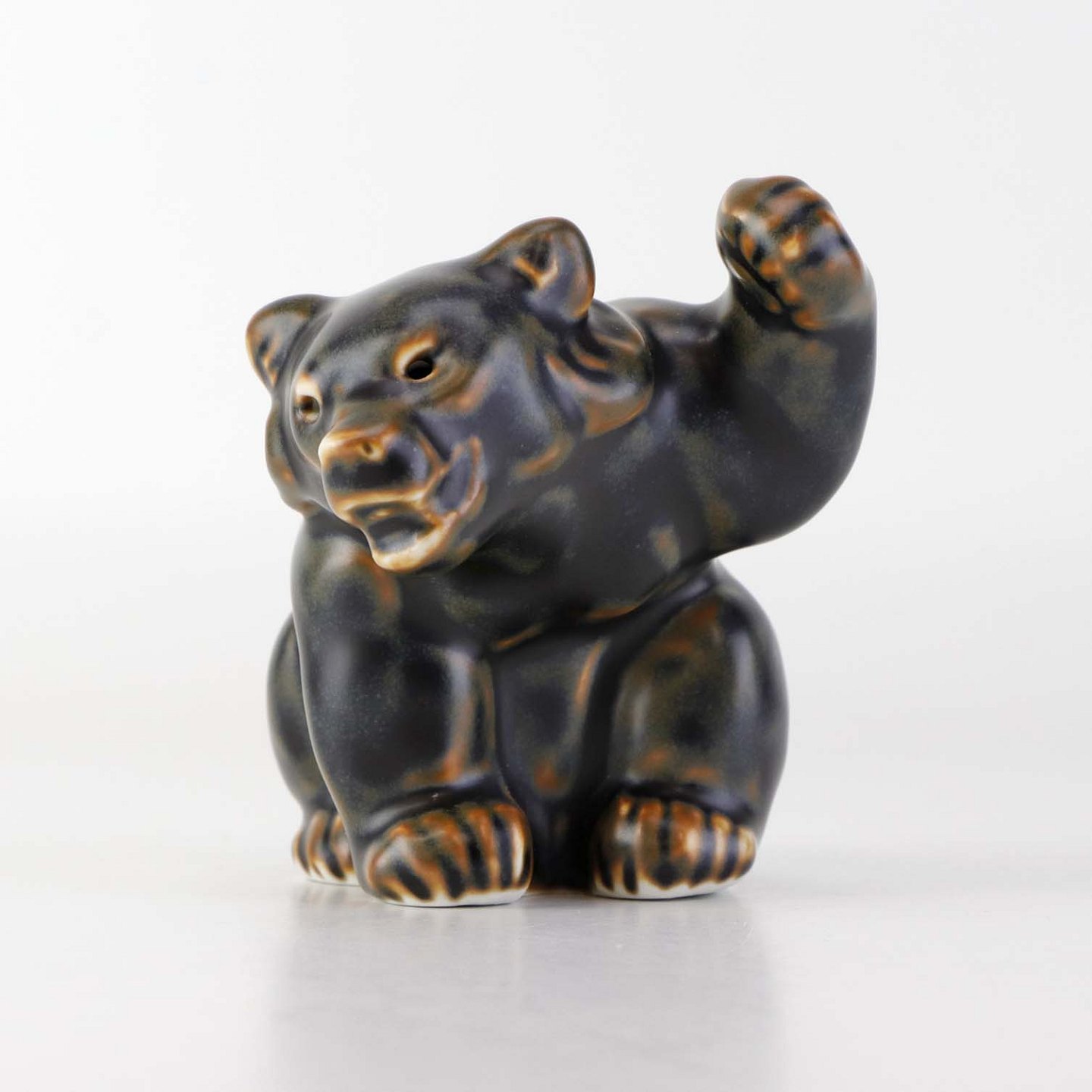 Figur i brunglaseret stentøj med motiv af siddende bjørneunge med løftet pote. Nr. 21433Formgiver Knud Kyhn (1880-1969)