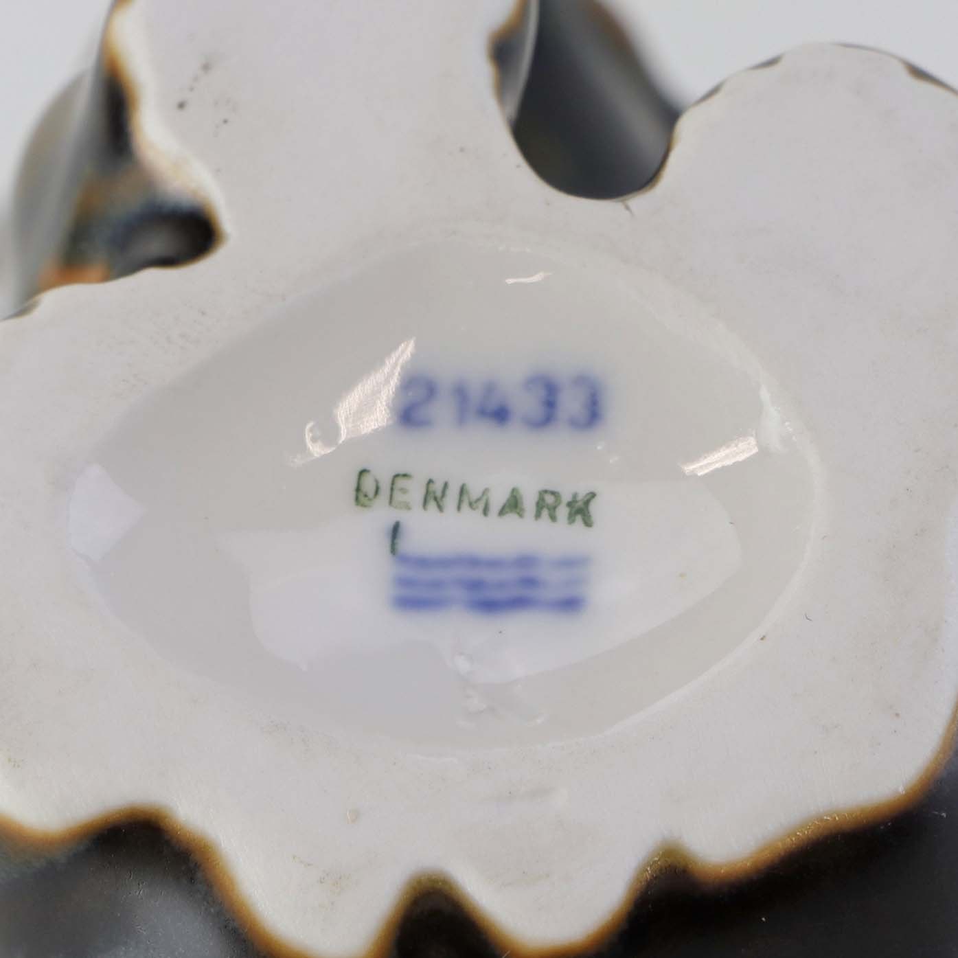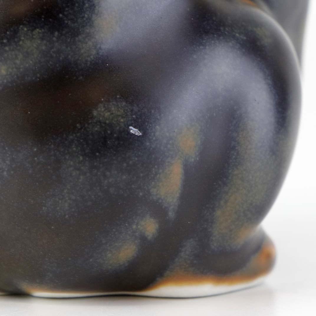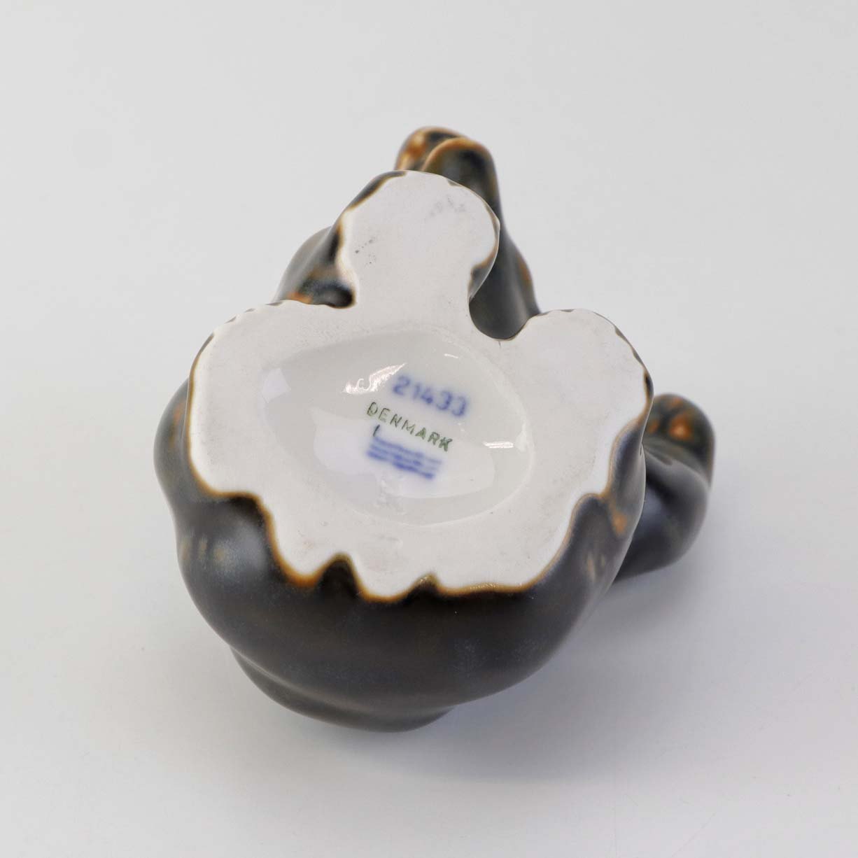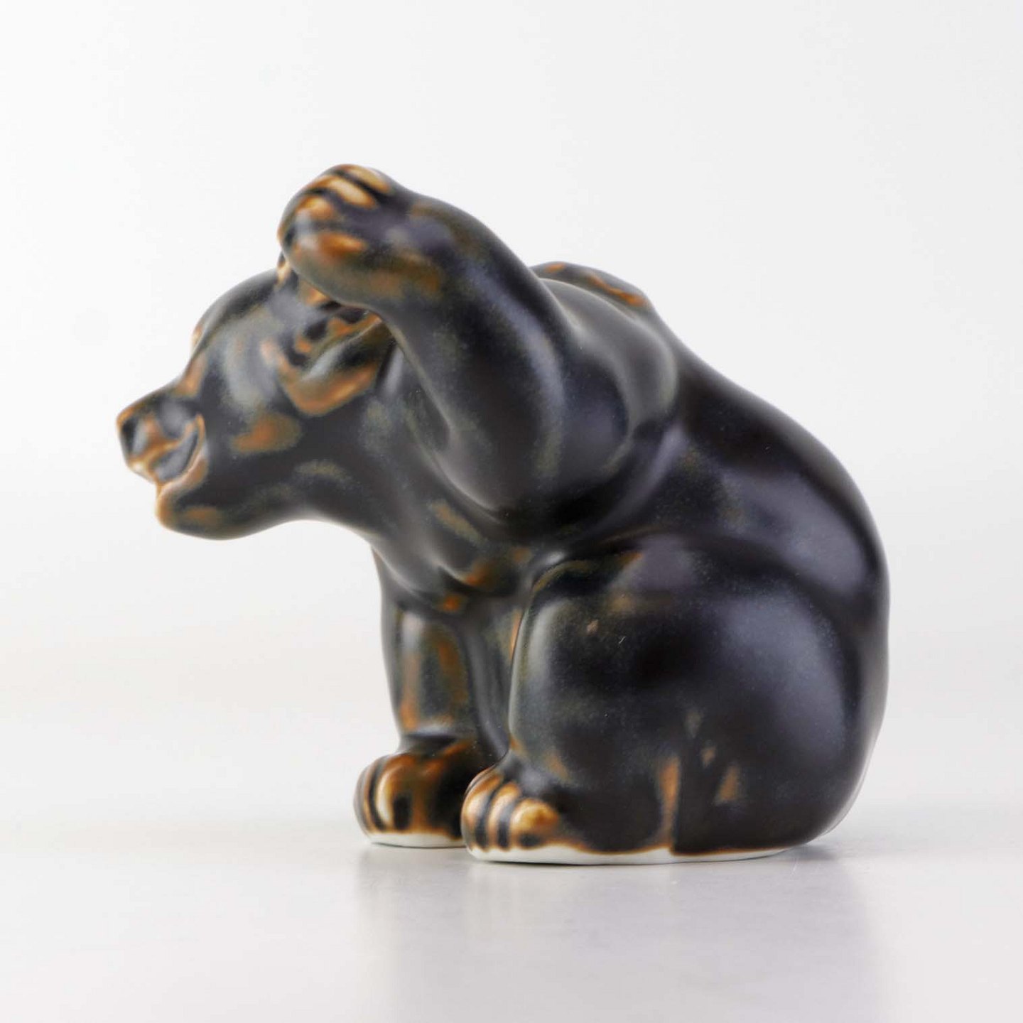 Figur i brunglaseret stentøj med motiv af siddende bjørneunge med løftet pote. Nr. 21433Formgiver Knud Kyhn (1880-1969)