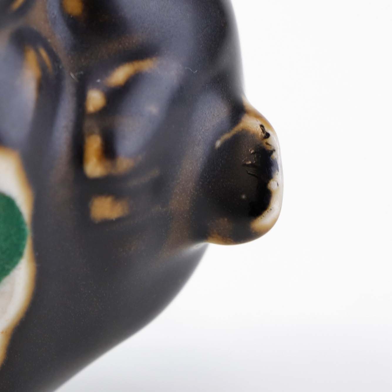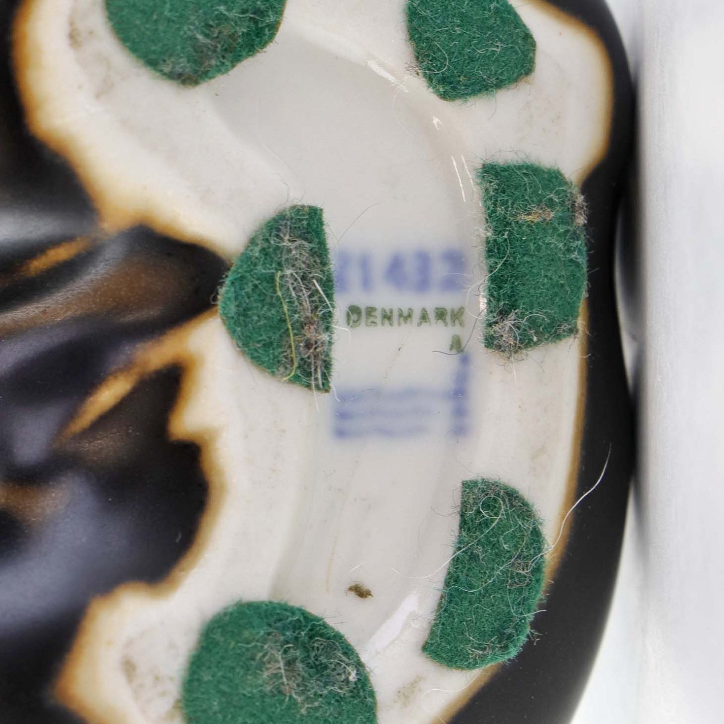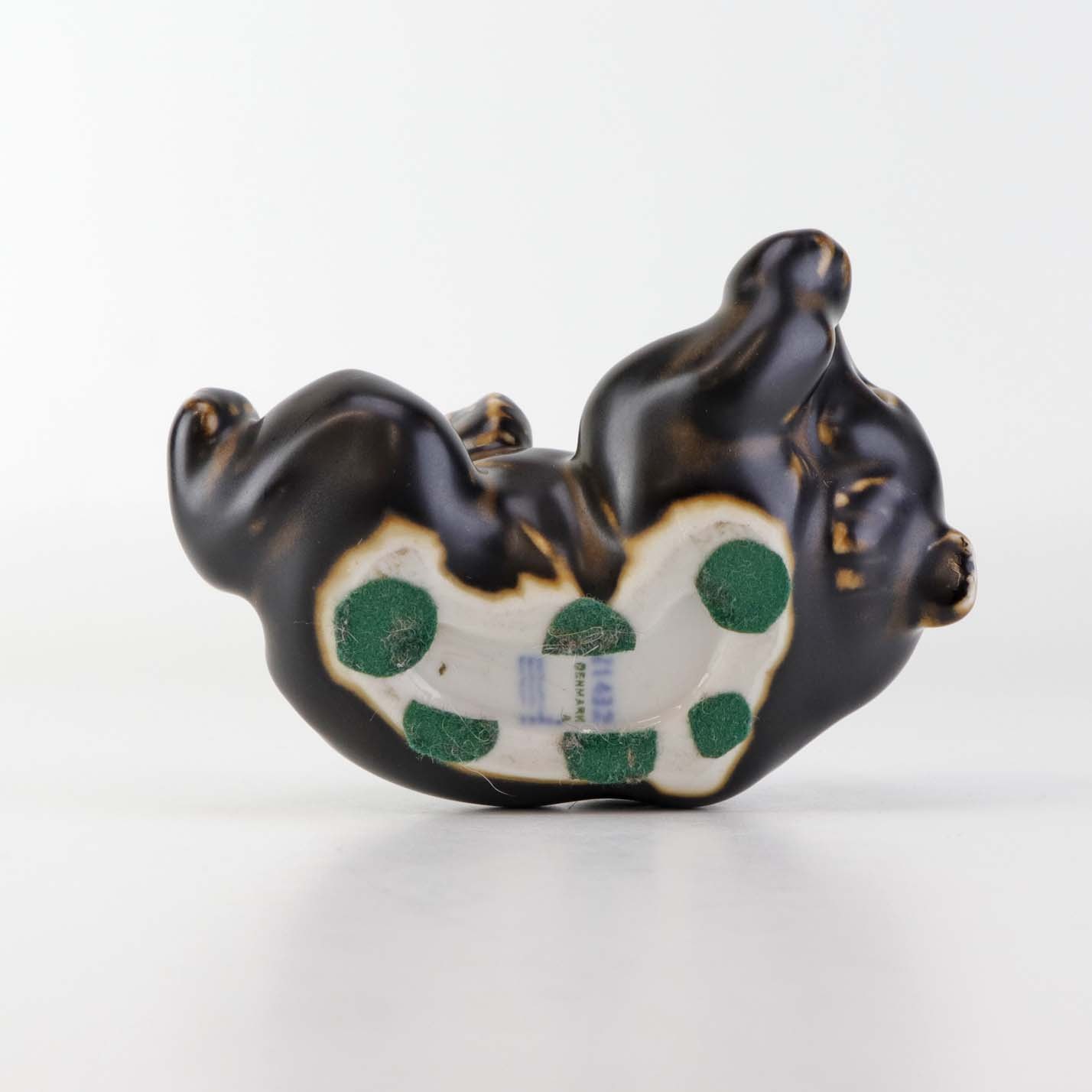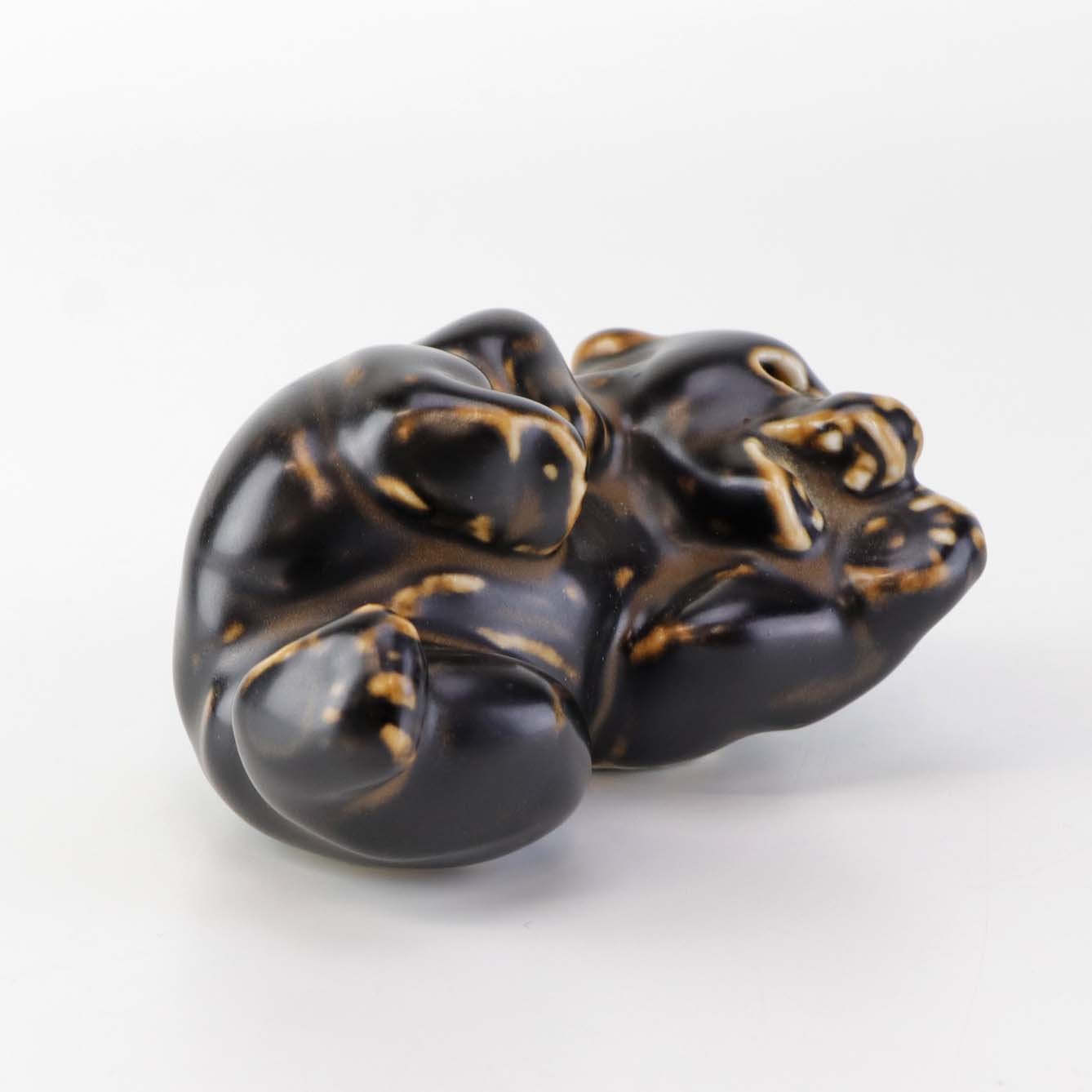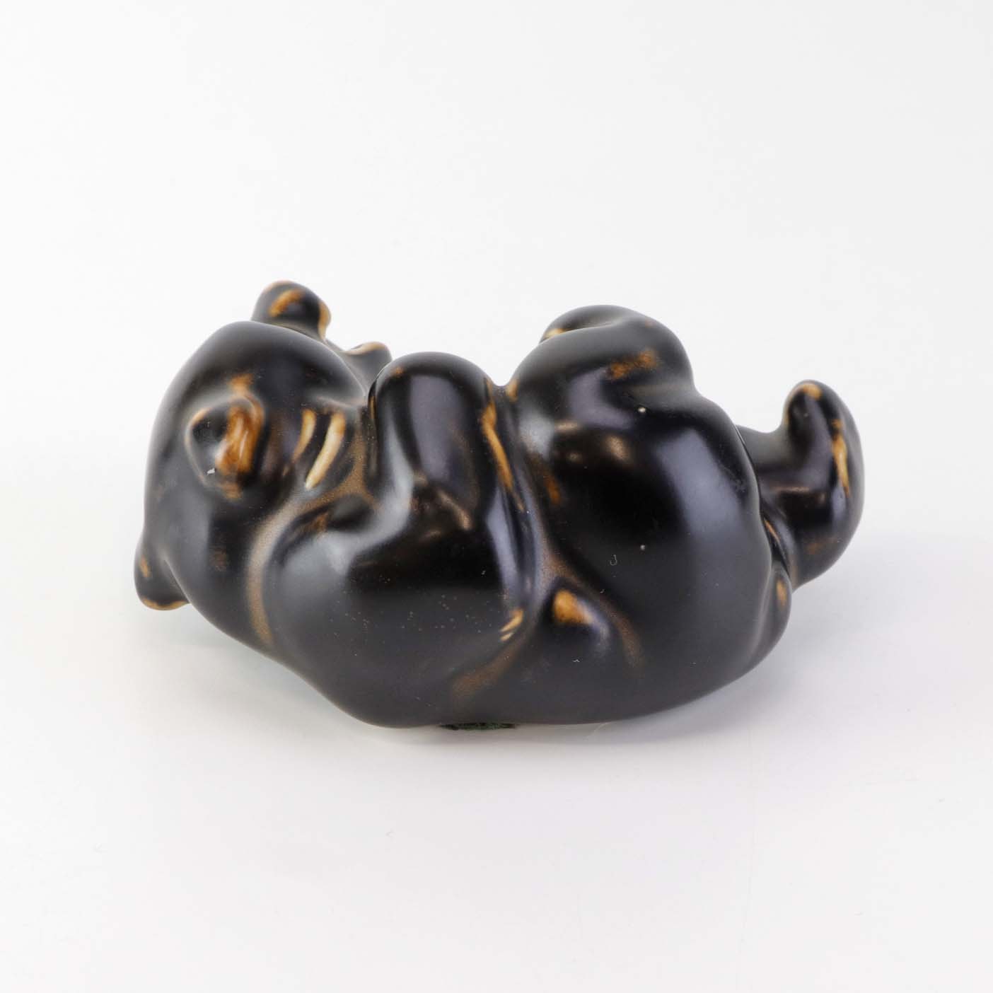 Figur i brunglaseret stentøj med motiv af liggende og legende bjørneunge. Nr. 21432Formgiver Knud Kyhn (1880-1969)