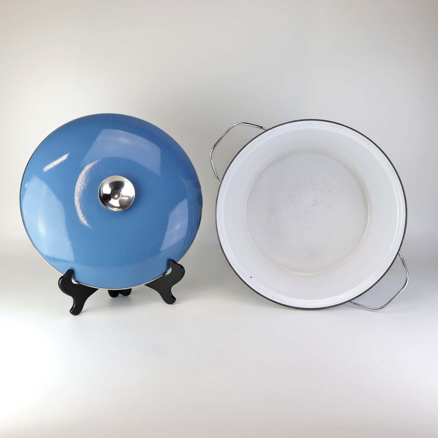Stor emalje gryde med låg og med blå Lotus motiv. Gryden er fra 1960'erne.Formgiver Grete Prytz Kittelsen
