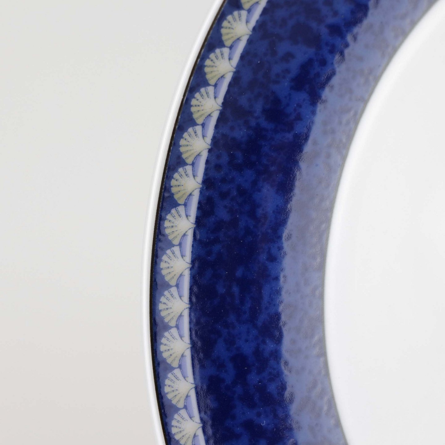 Service i glat hvid porcelæn med blåt bånd og dekoration af gule vifteformede strandskaller. Stellet kan gå i opvaskemaskinen.