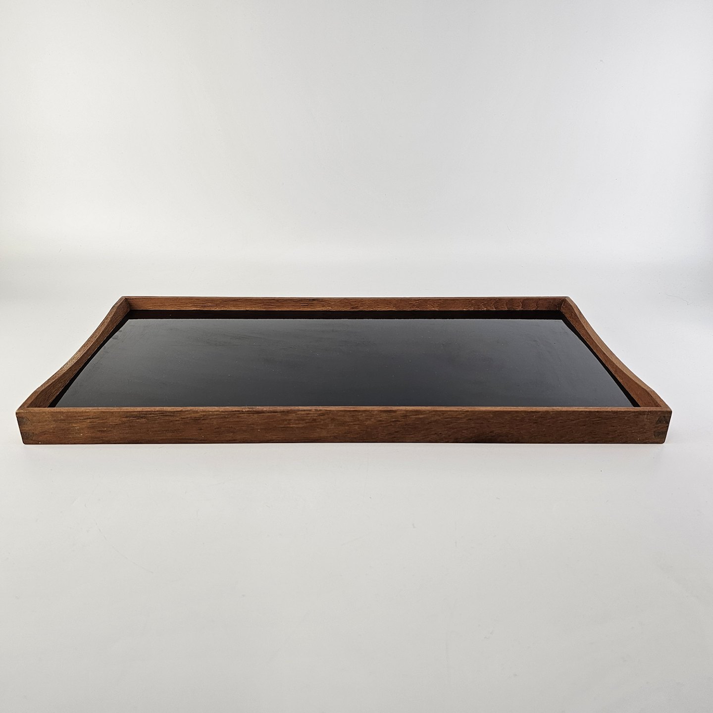 Vendbar bakke i teak tre og højglans laminat, sort på den ene side og hvid på den andenFormgiver Finn Juhl