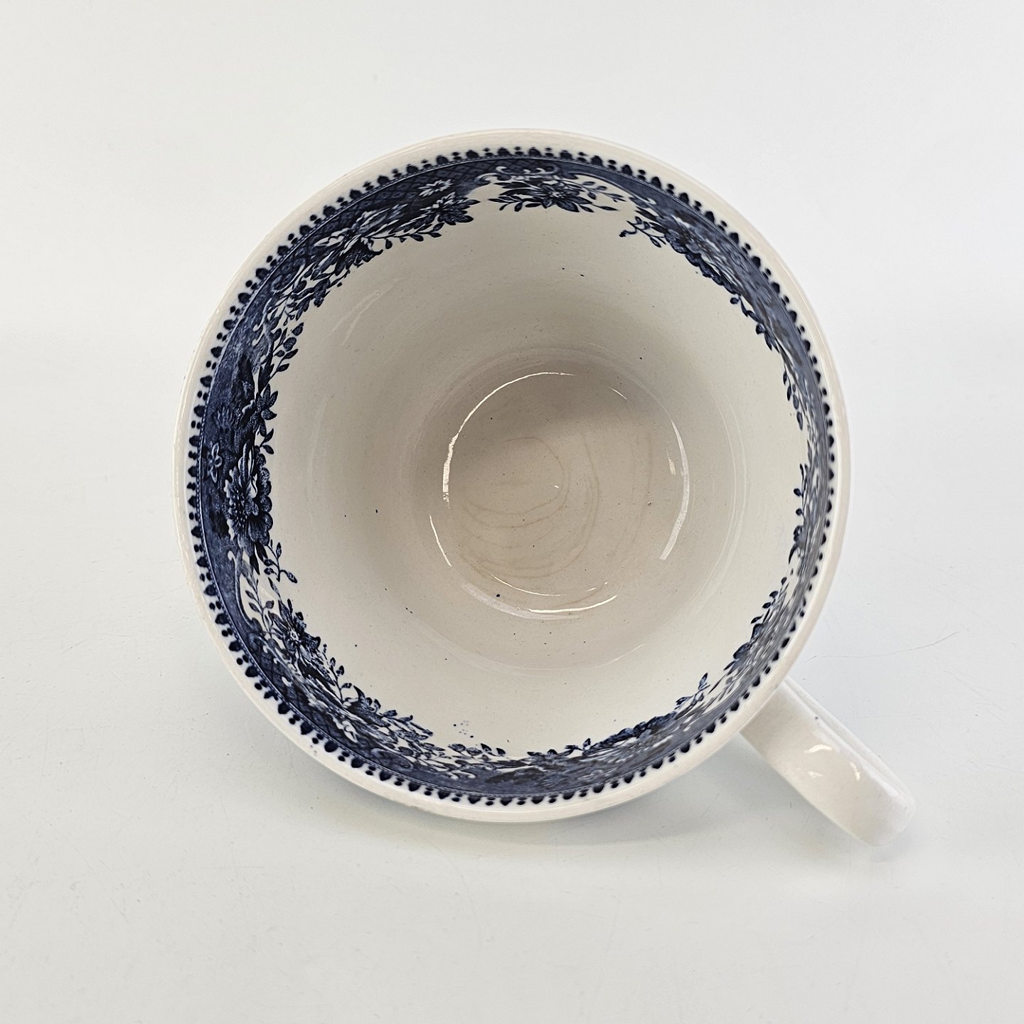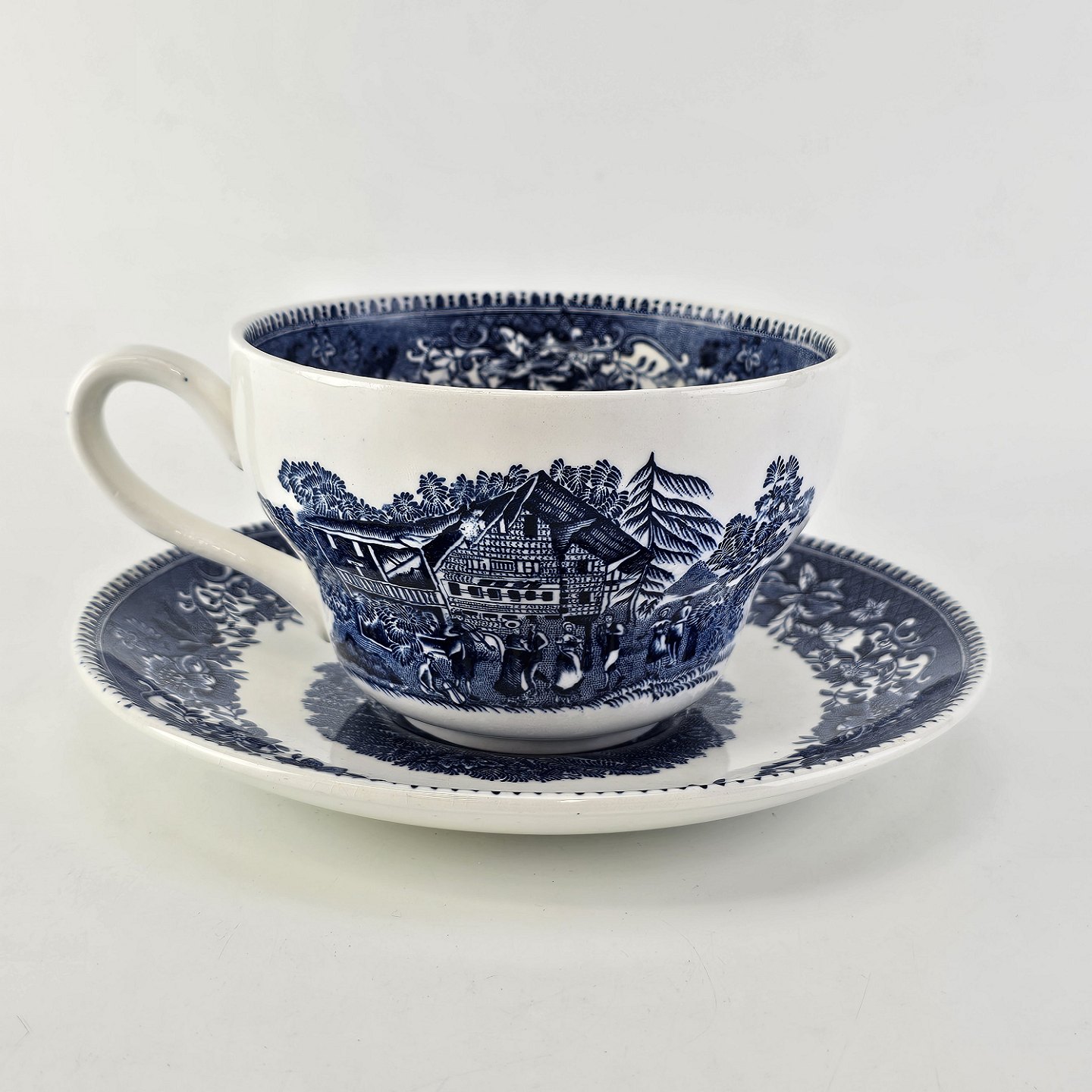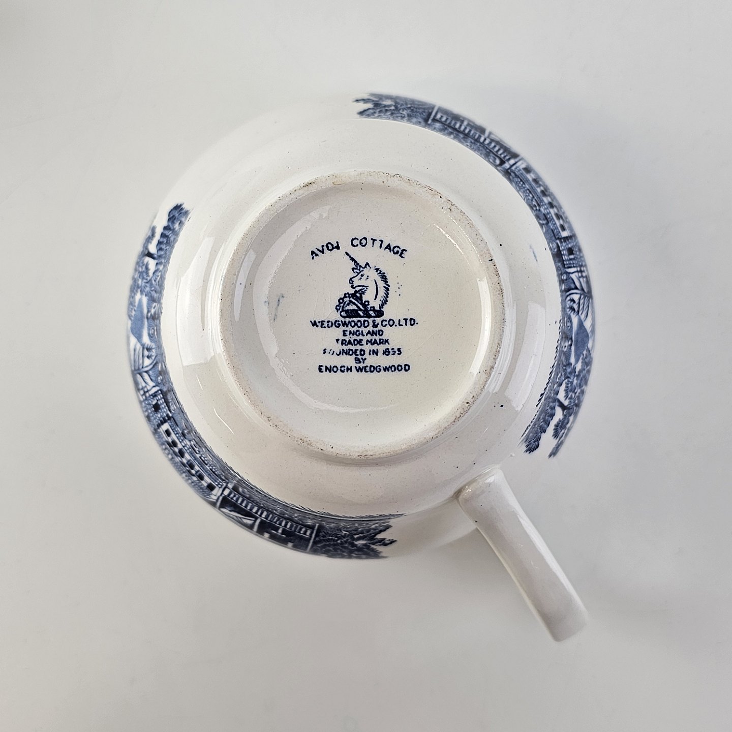 Blå kop og underkop i engelsk fajance fra stellet Avon CottageProduceret af Wedgwood & Co. LTD, England