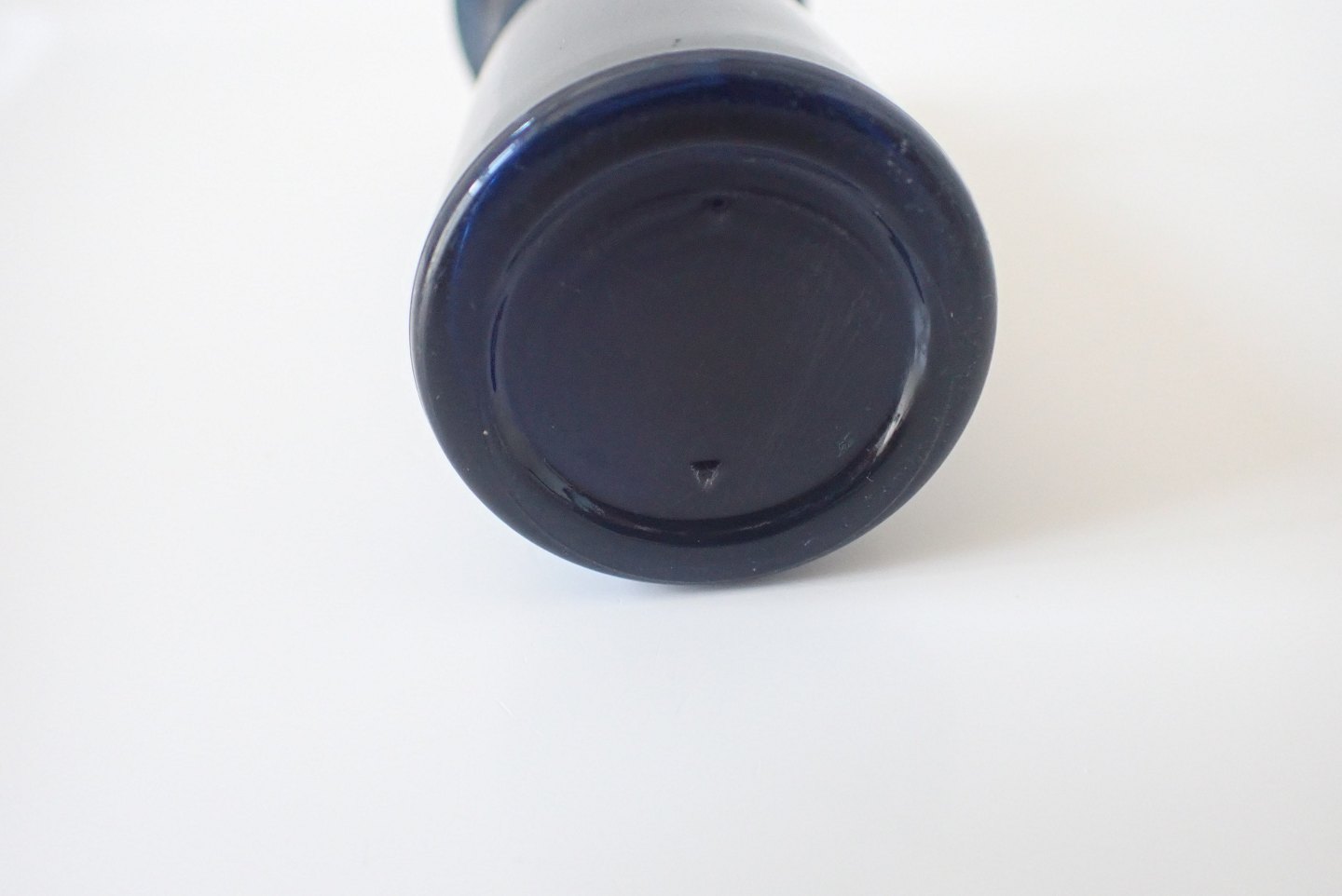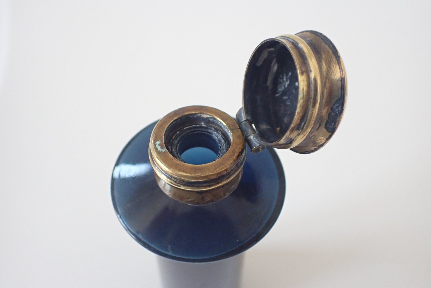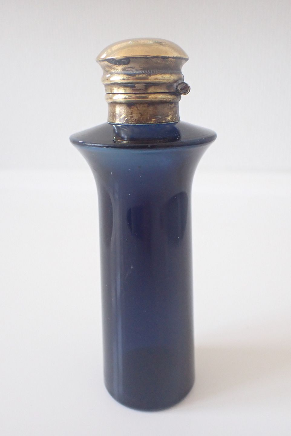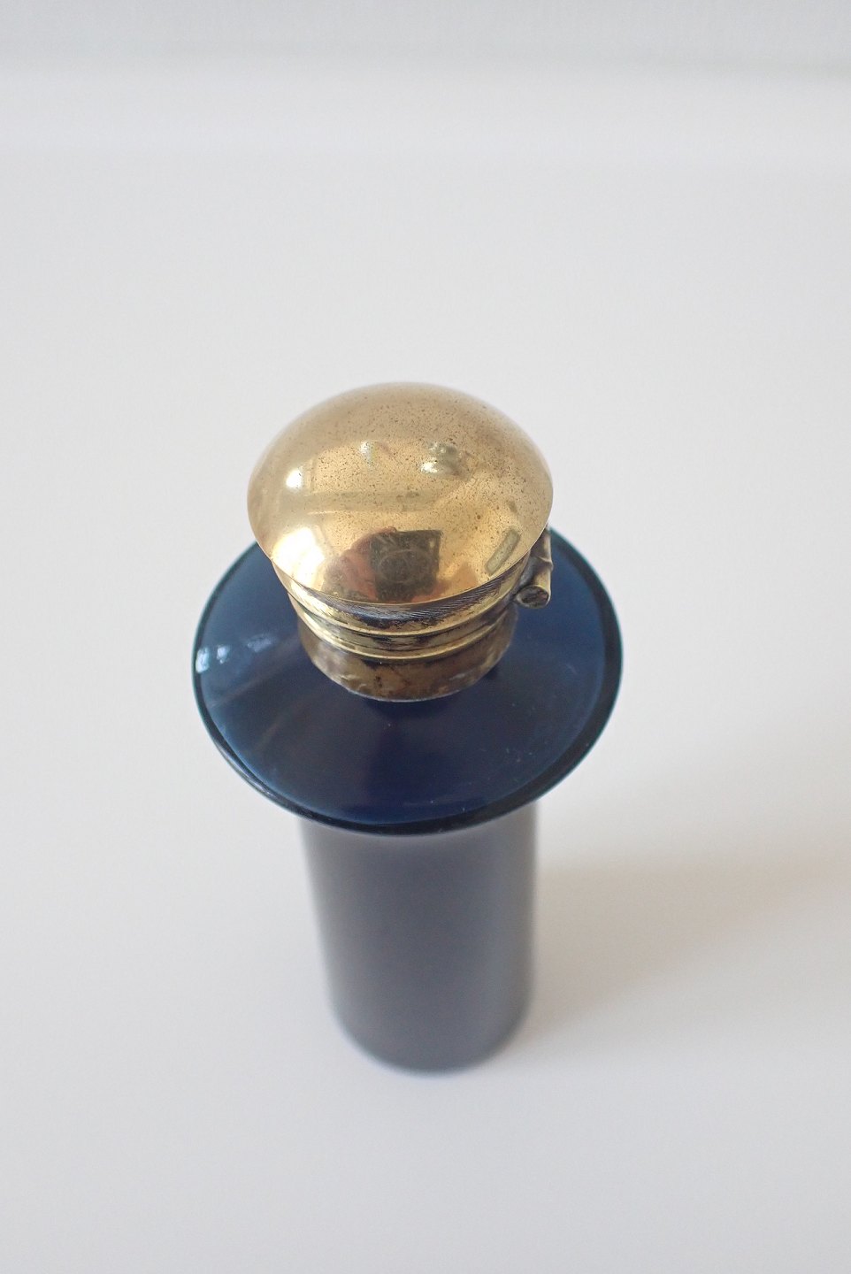 Parfumeflaske i blåt glas med messinglåg, engelsk ca. 1900. Højde:11,5 cm. I fin stand men mangler indre glasprop. Udstiller