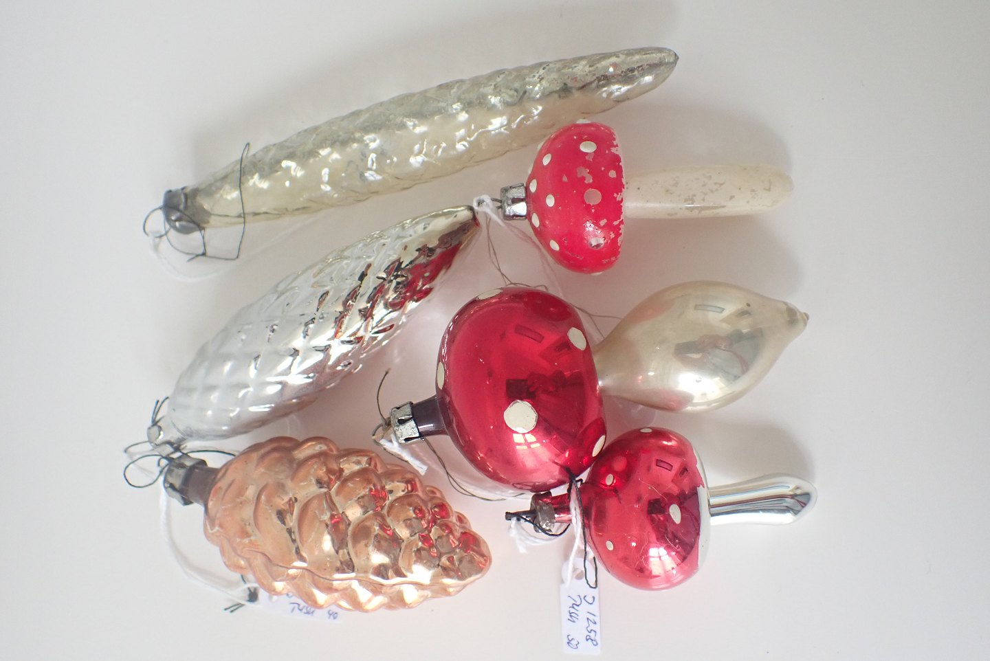 3 stk. kogler. Med ophæng: 2 lange sølvfarvede russiske - 9,2 - 13 cm. og en bronzefarvet tysk, 8,2 cm. Omkring 1940. Priser fra 85 -200 kr.3 paddehatte med rød, hvid og sølv bemaling. i forskellige størrelser. Priser fra. 85 - 200 kr.