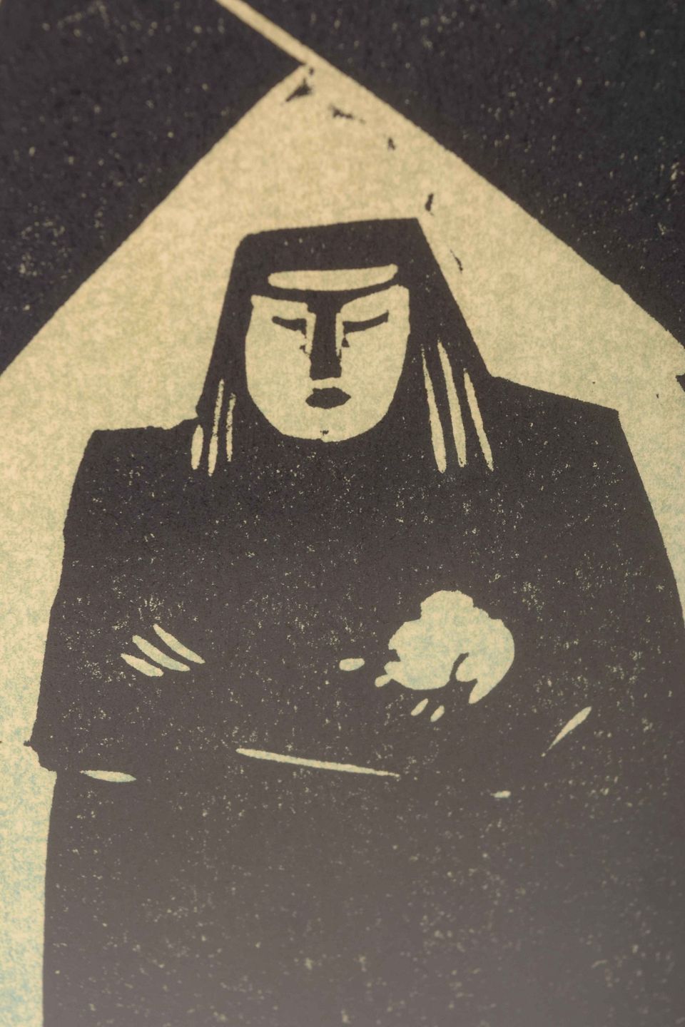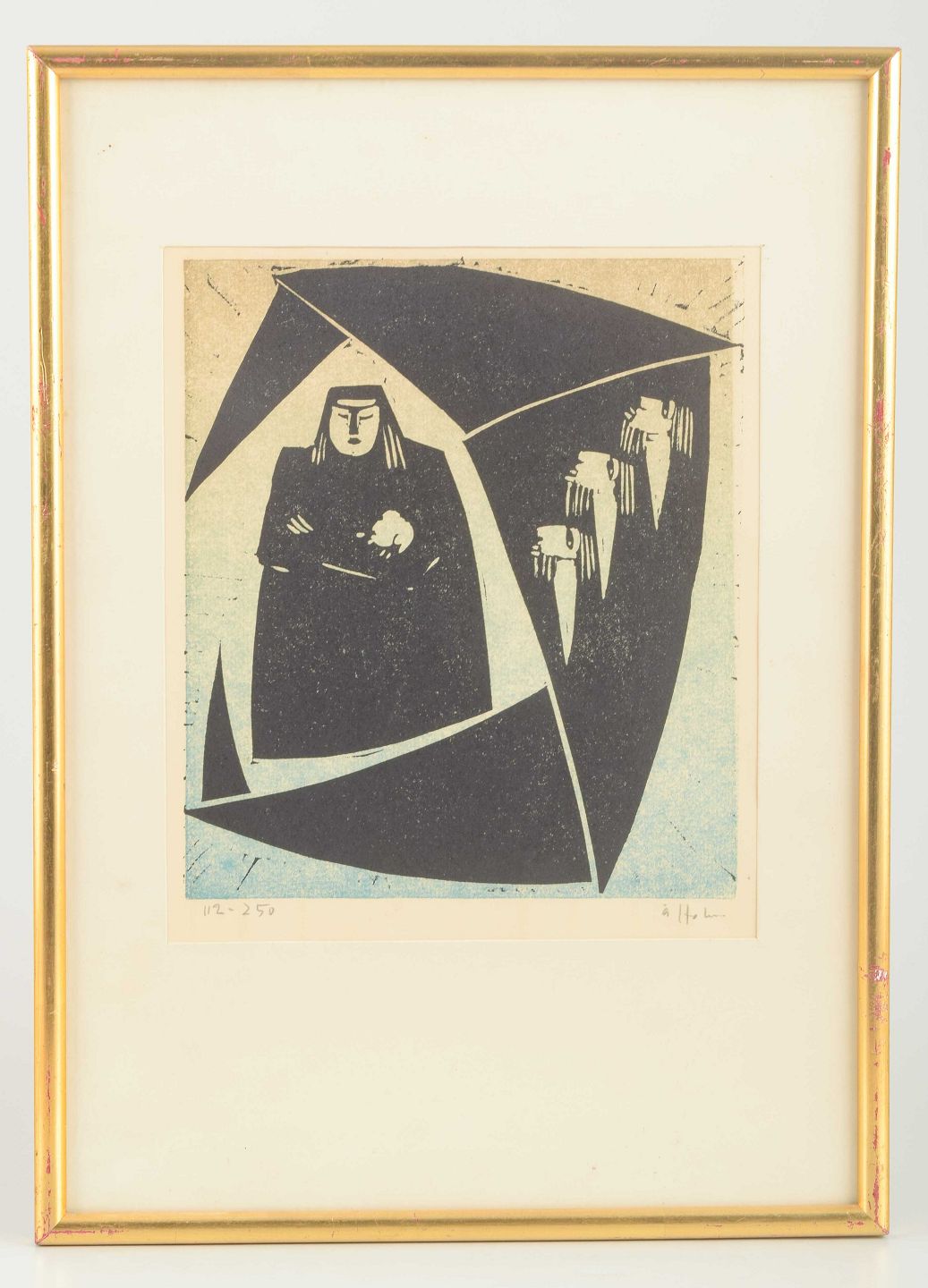 A characteristic woodcut by the Swedish ceramicist and visual artist Åke Holm, executed in his distinctive expressive style with a biblical motif.