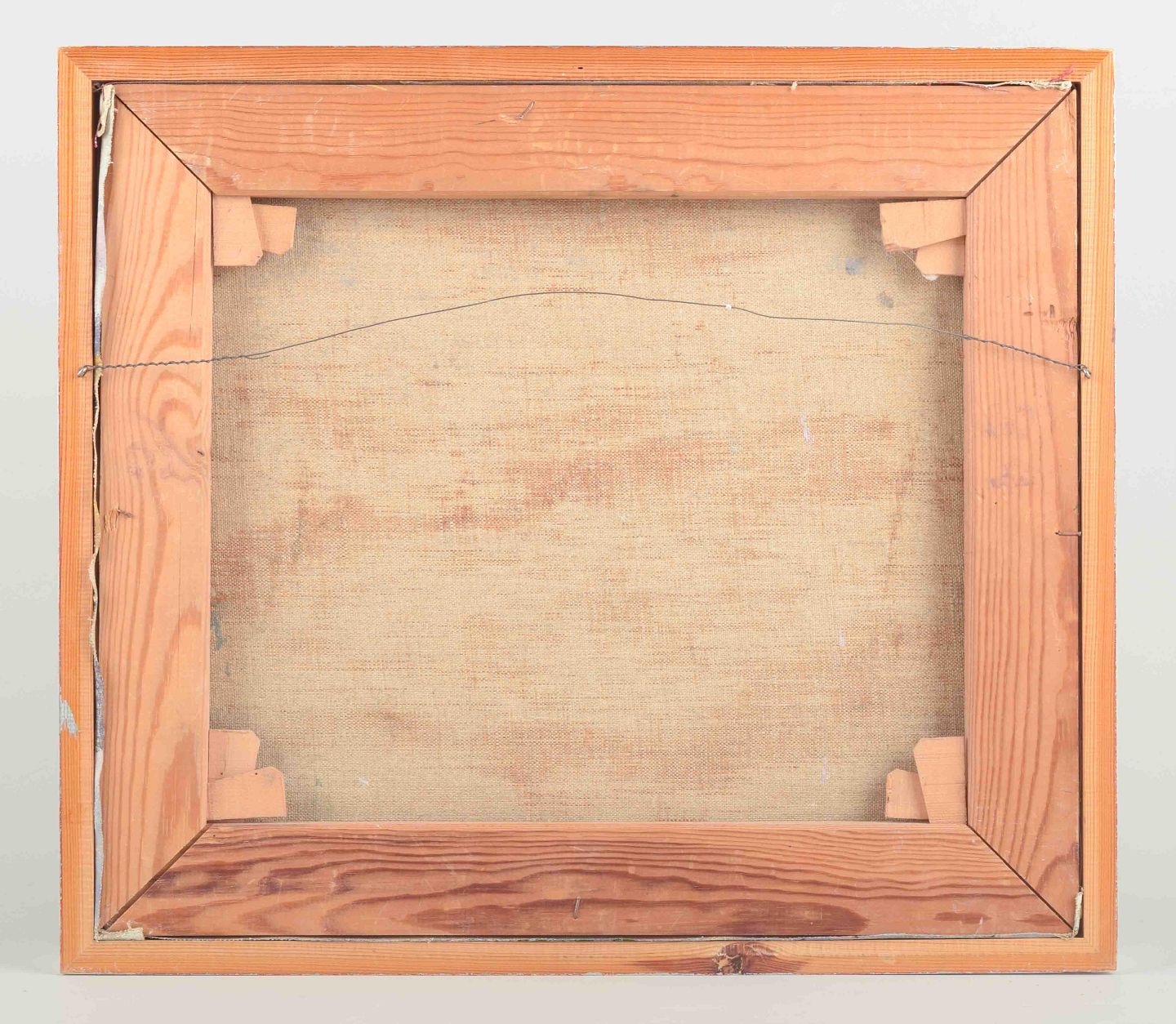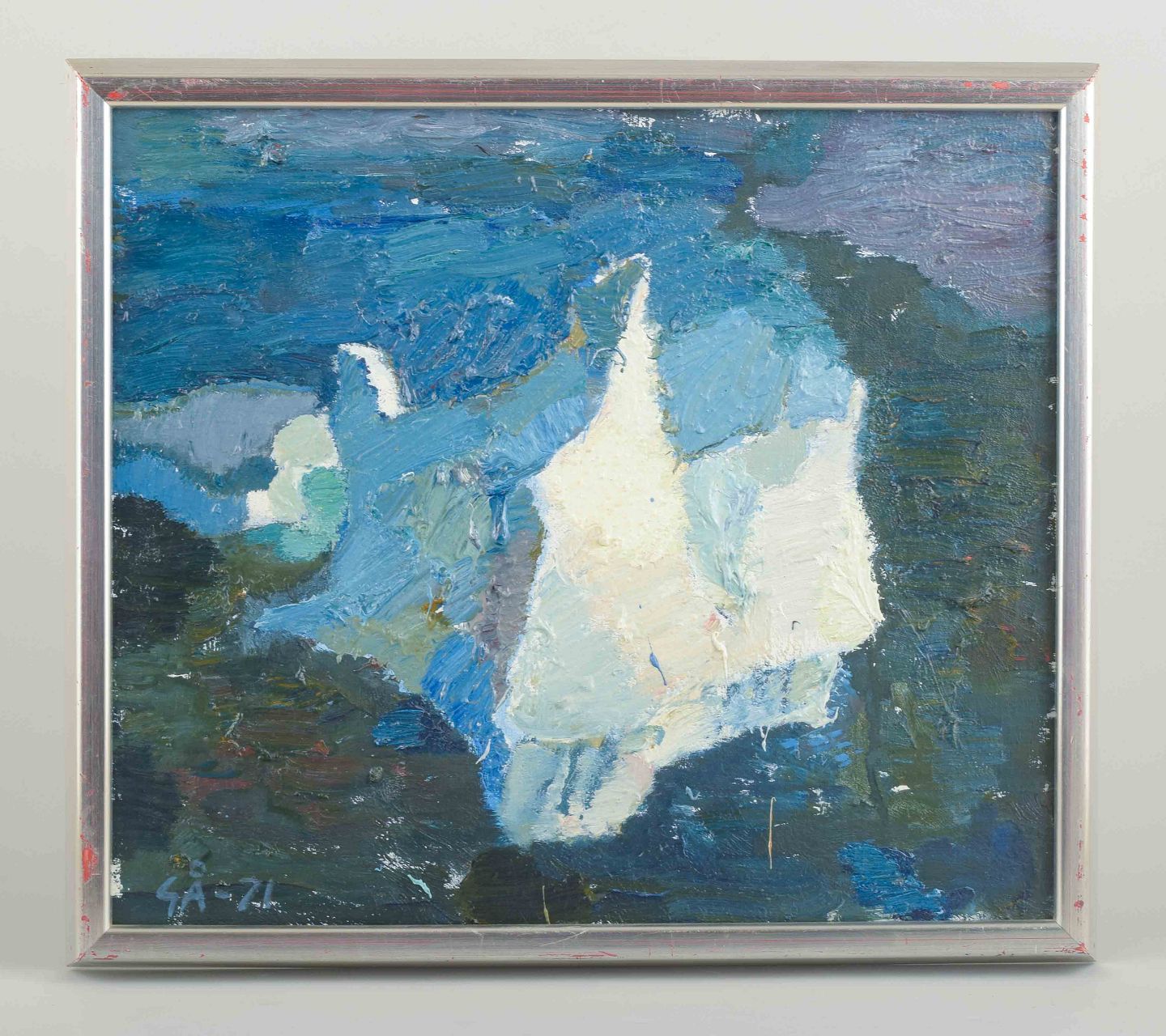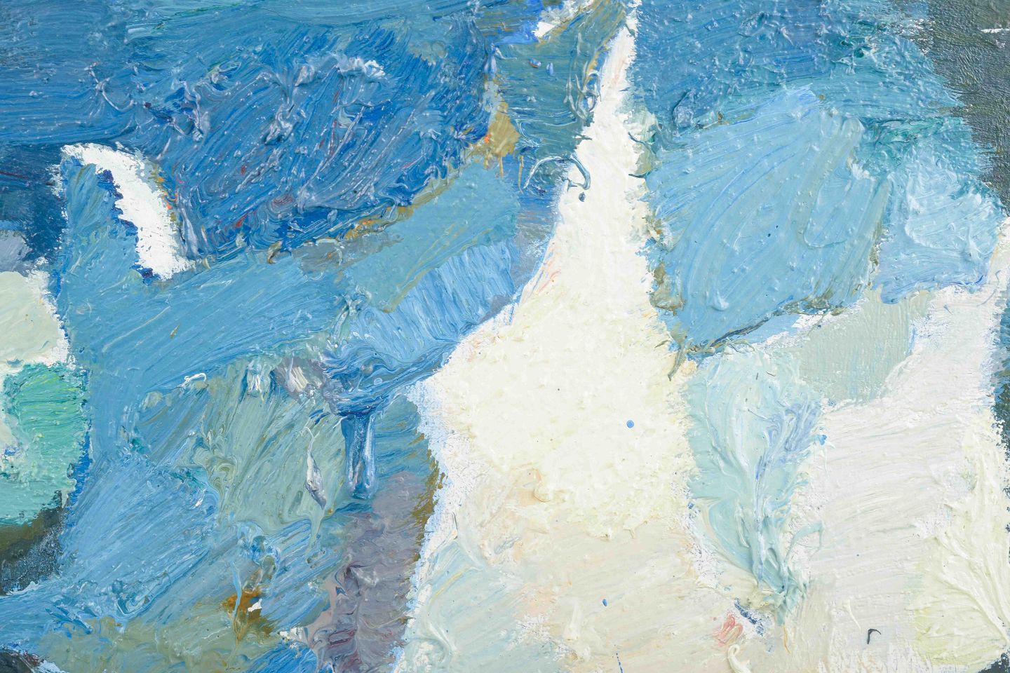 An expressive work by a Scandinavian artist, executed with bold brushstrokes in deep blue and white tones. The painting reflects a distinctly modernist approach, emphasizing the materiality of paint and evoking almost landscape-like associations.