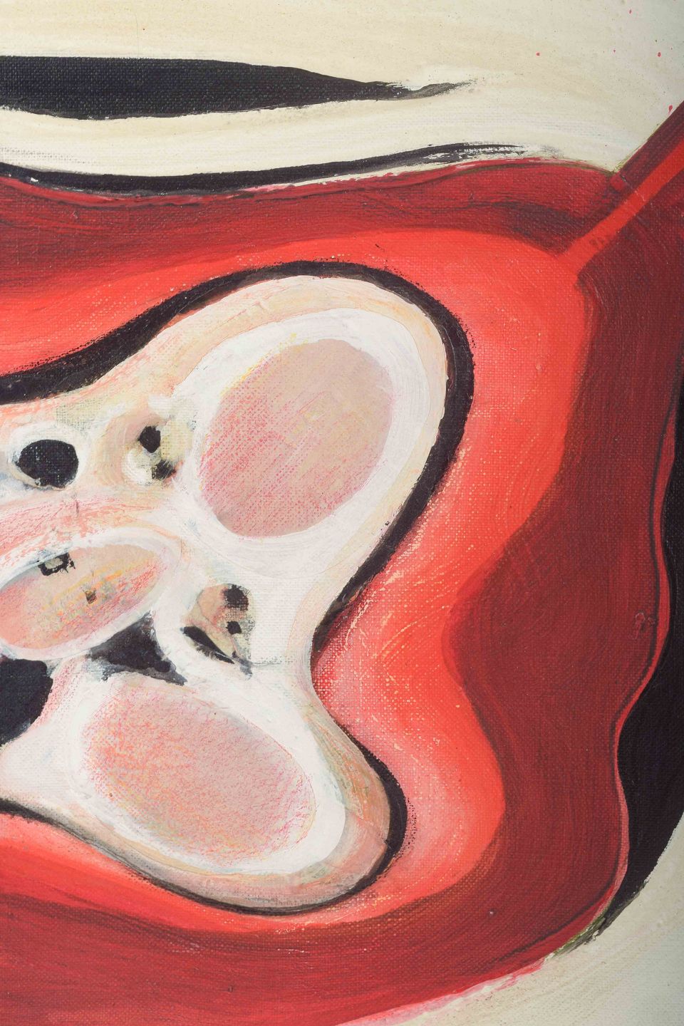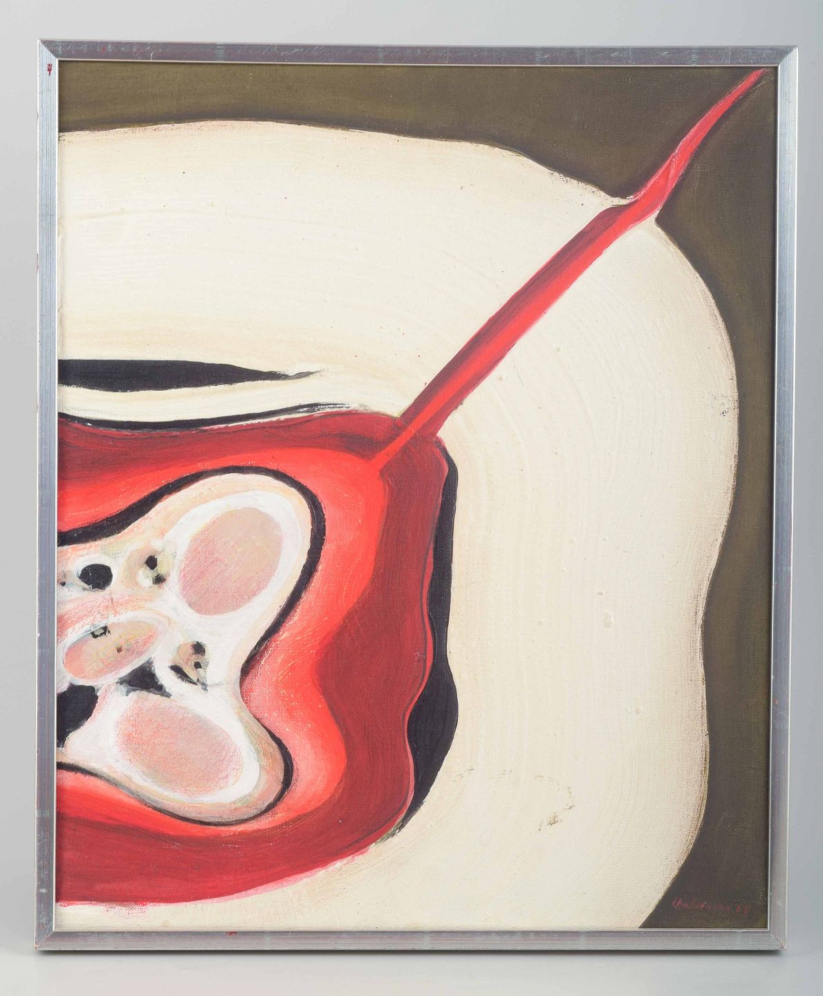 A modernist work by the Swedish artist Uno Svensson, signed and dated 1967. The painting features a strong coloristic composition with red and white organic forms set against a neutral background, reflecting the artist’s characteristic sense of movement and contrast.