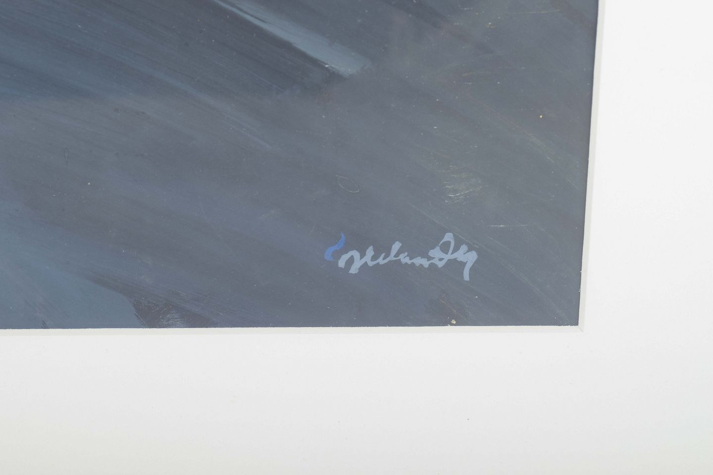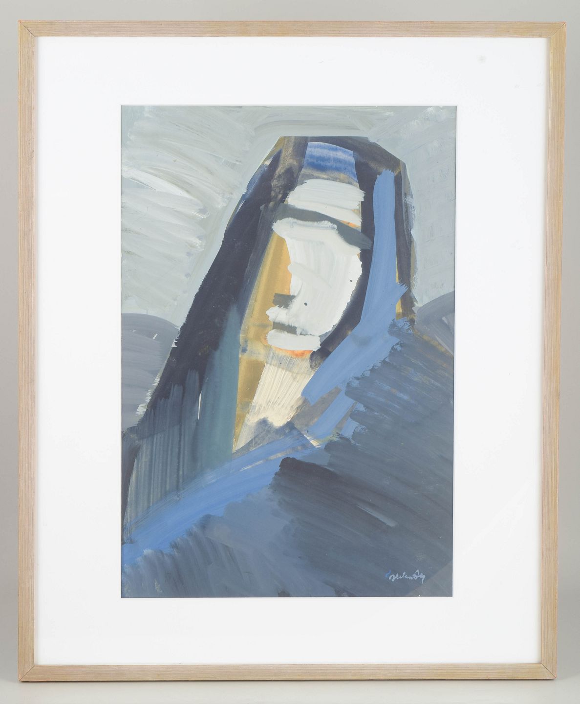 An early work by Jerker Helander from 1966, executed in gouache with broad, expressive brushstrokes in blue, grey and white tones. The composition appears as an abstracted figure, where the contrast between the cool hues and warm golden areas creates an intense, almost iconic presence.
