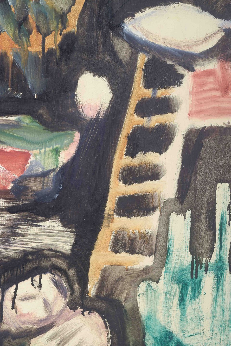 This expressive work emerges as a striking manifestation of the post-war Scandinavian modernist idiom, in which spontaneous brushstrokes, fluid contours, and contrasting chromatic fields generate a visual dynamism that simultaneously suggests an inner psychological intensity and a conscious emancipation from naturalistic tradition. The dripping black lines accentuate the dramatic tenor of the composition, underscoring its dual character as both improvisational gesture and carefully considered artistic statement.