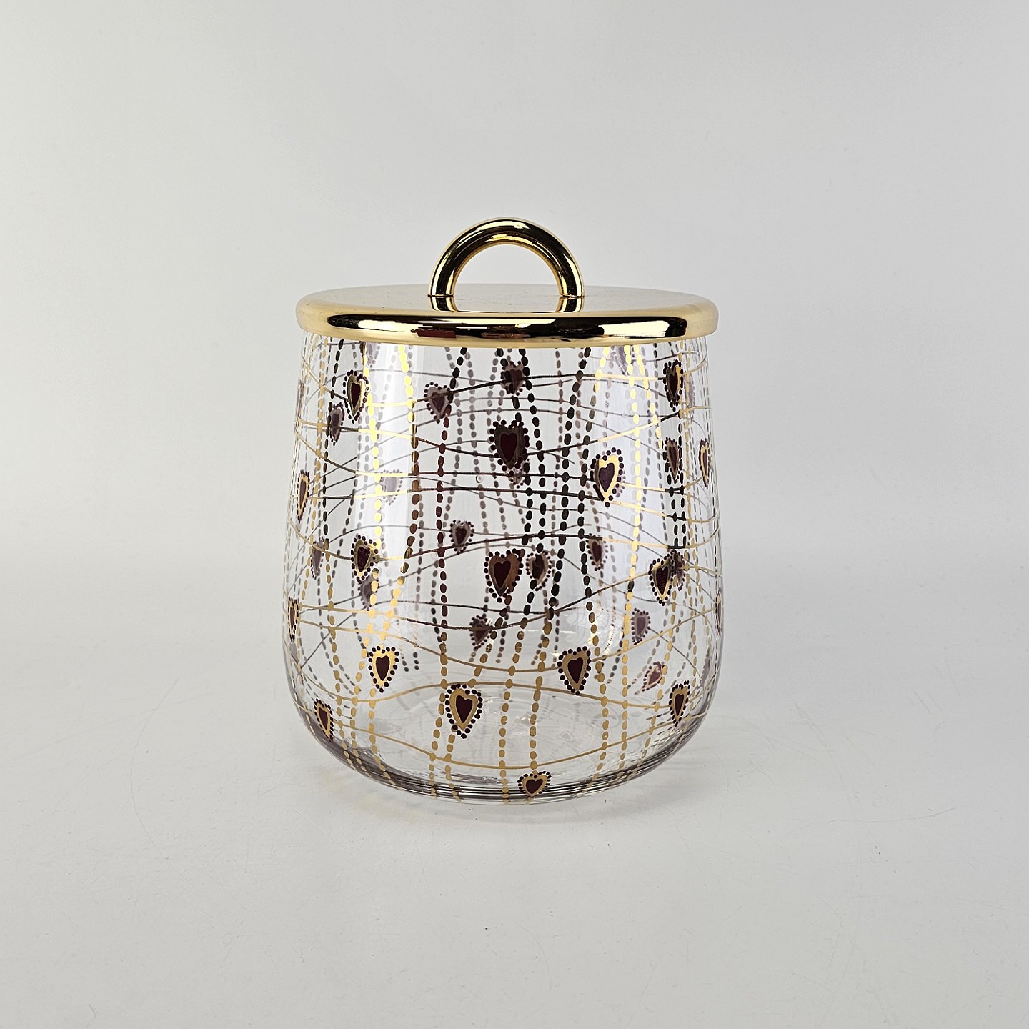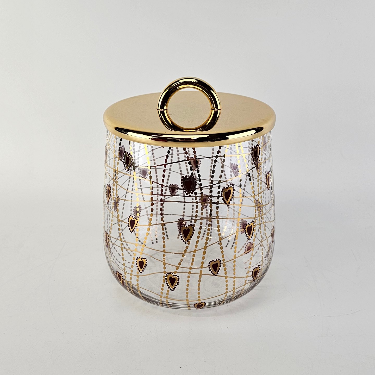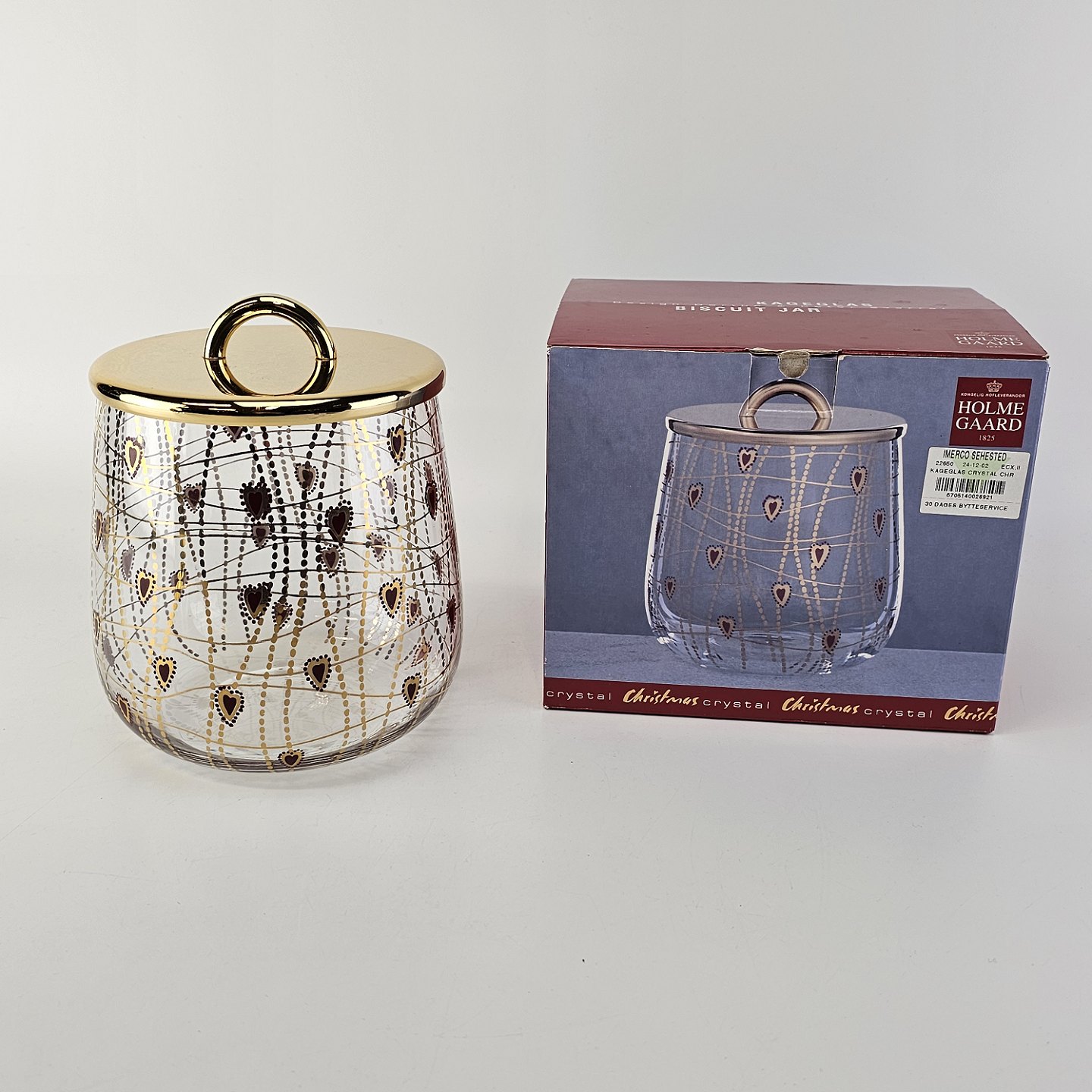 Kagedåse af glas med mønster af røde hjerter og guldstreger, og gyldent lågMed original kasse fra serien Christmas Crystal