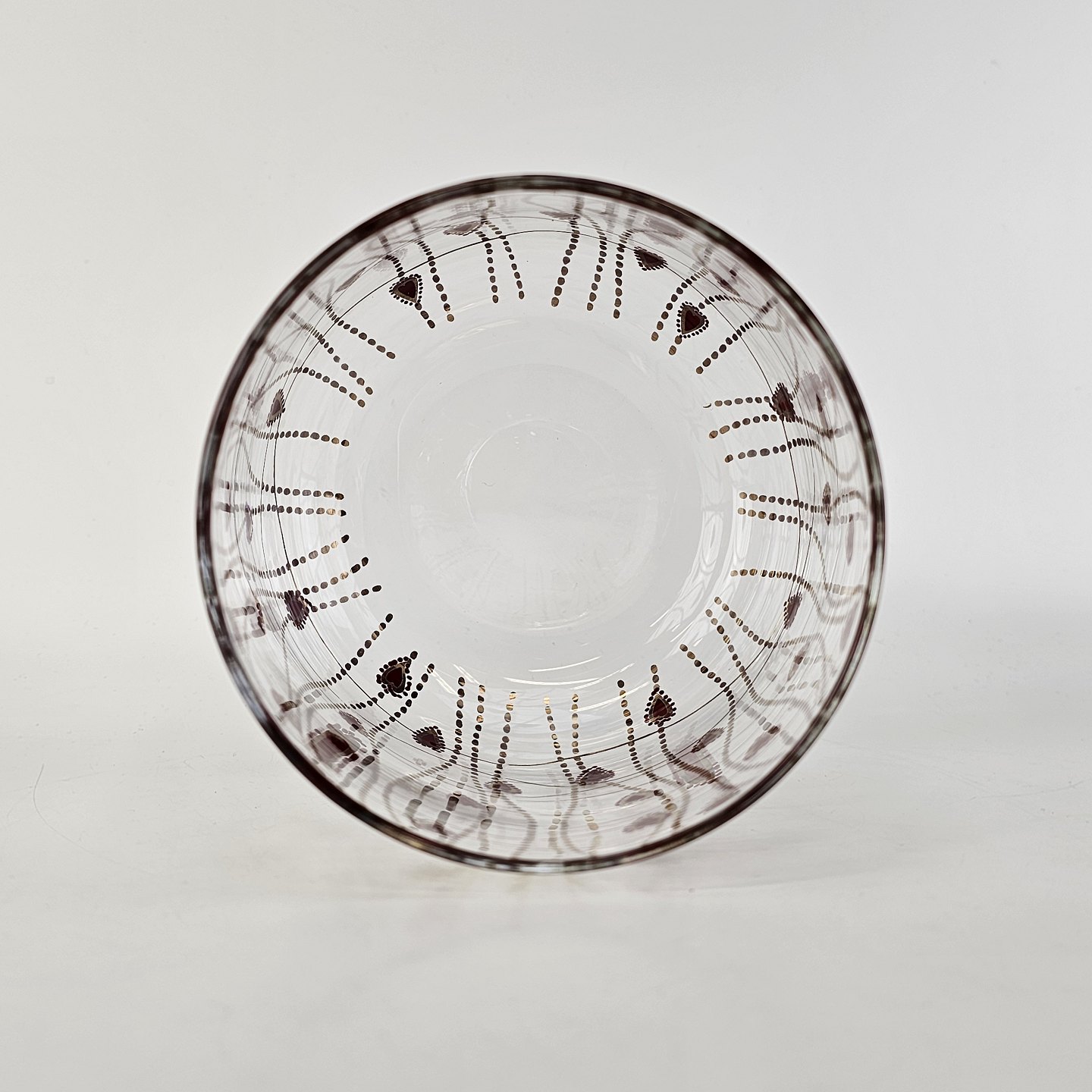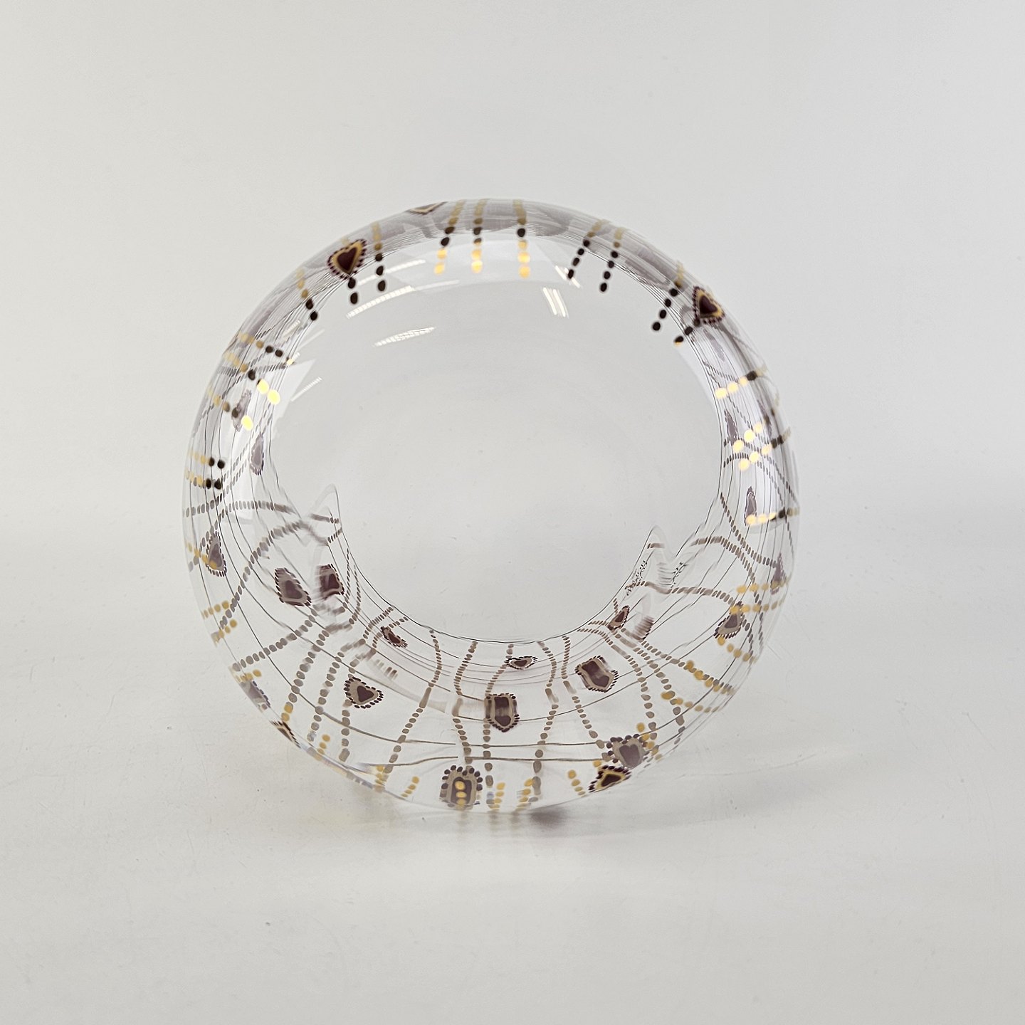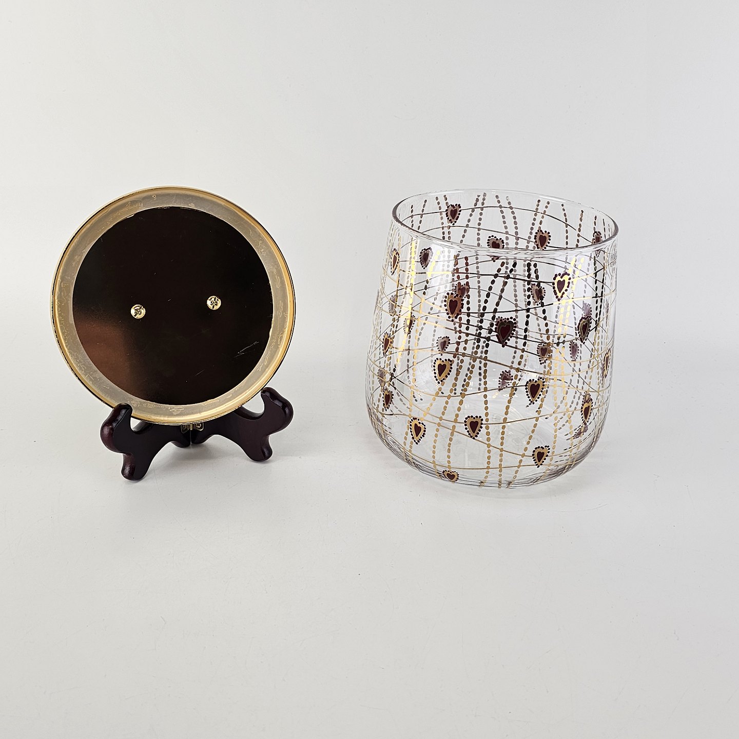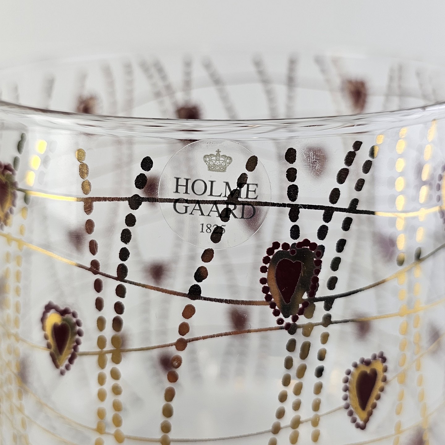 Kagedåse af glas med mønster af røde hjerter og guldstreger, og gyldent lågMed original kasse fra serien Christmas Crystal
