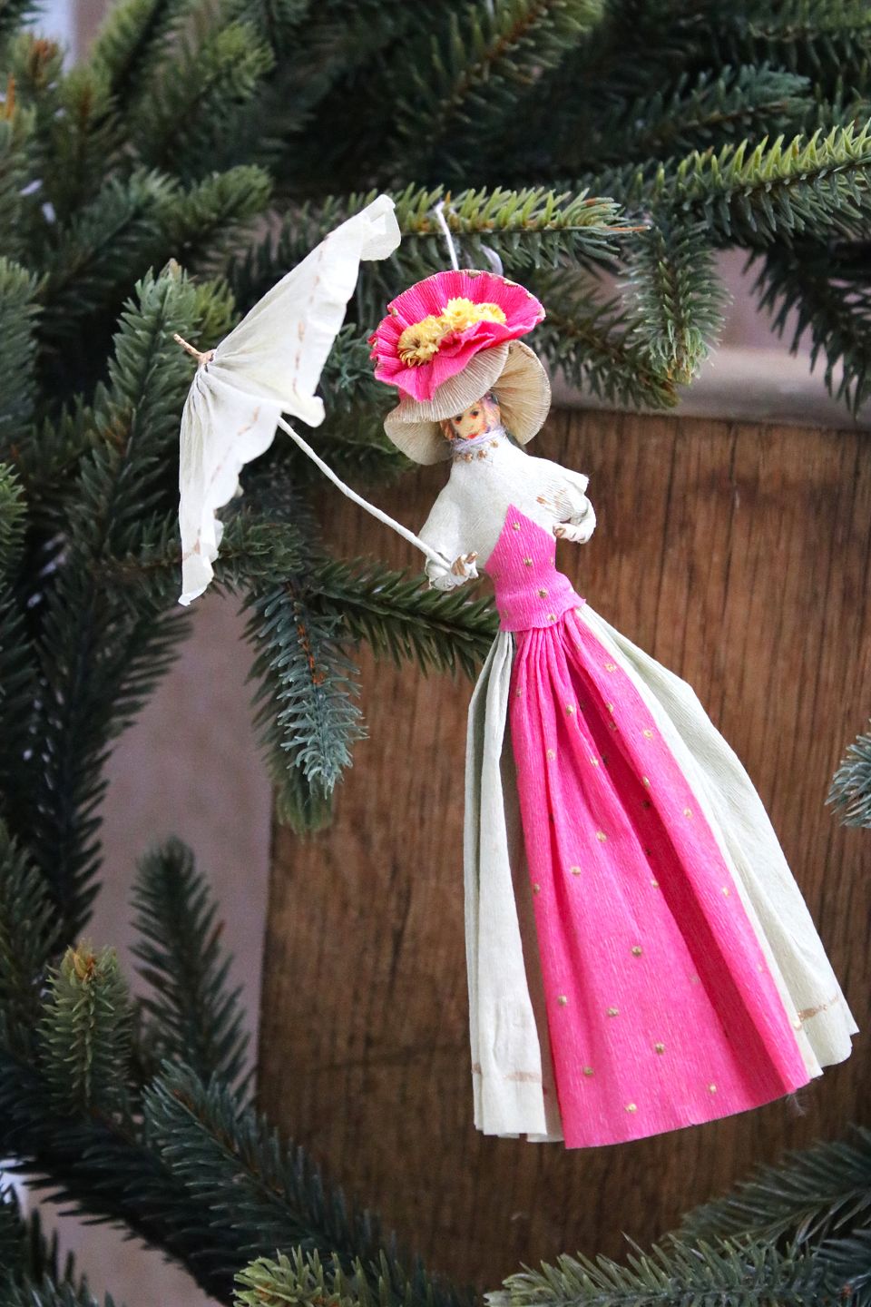 Old Christmas tree ornament, nice lady with umbrella made of colored crepe paper. H: 15cm.Item number: Jul nr. 646