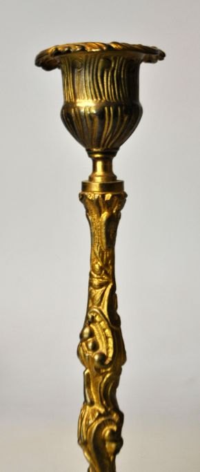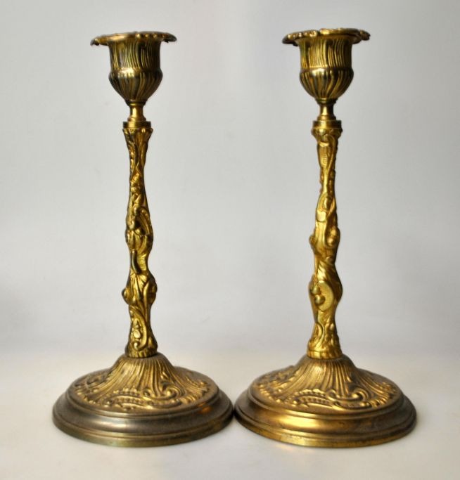 Pair of French candlesticks, 19th century. With decorations of flowers and twists. On a round base. H: 20 cm. Dia: 9.5 cm.Item number: 28255