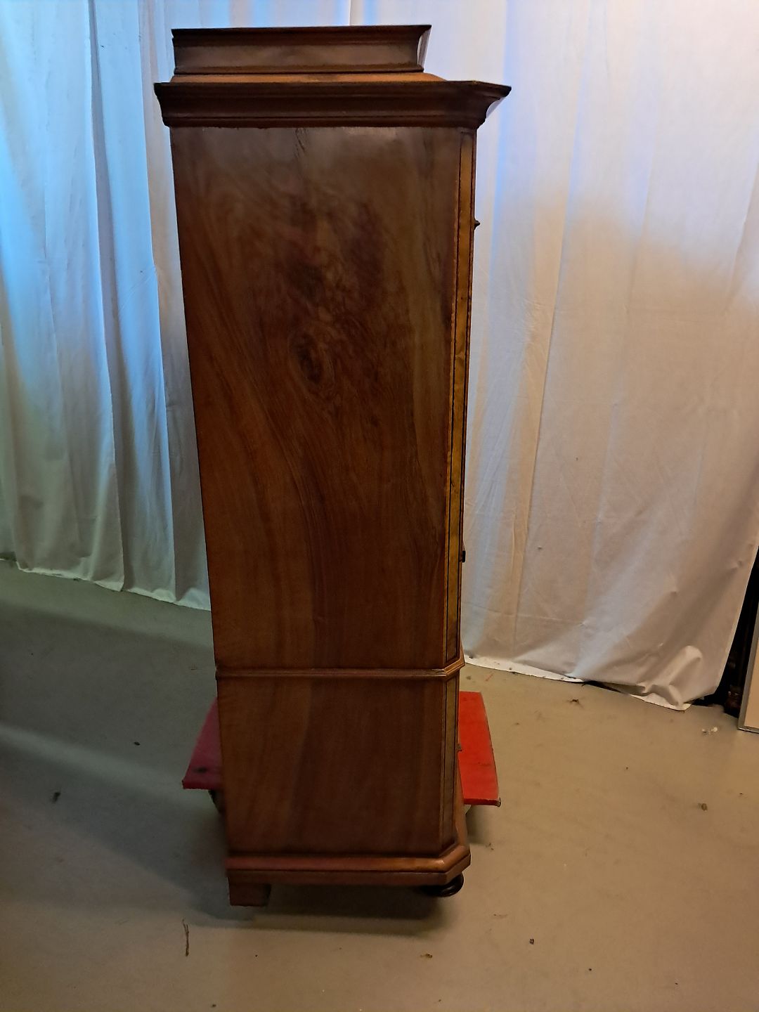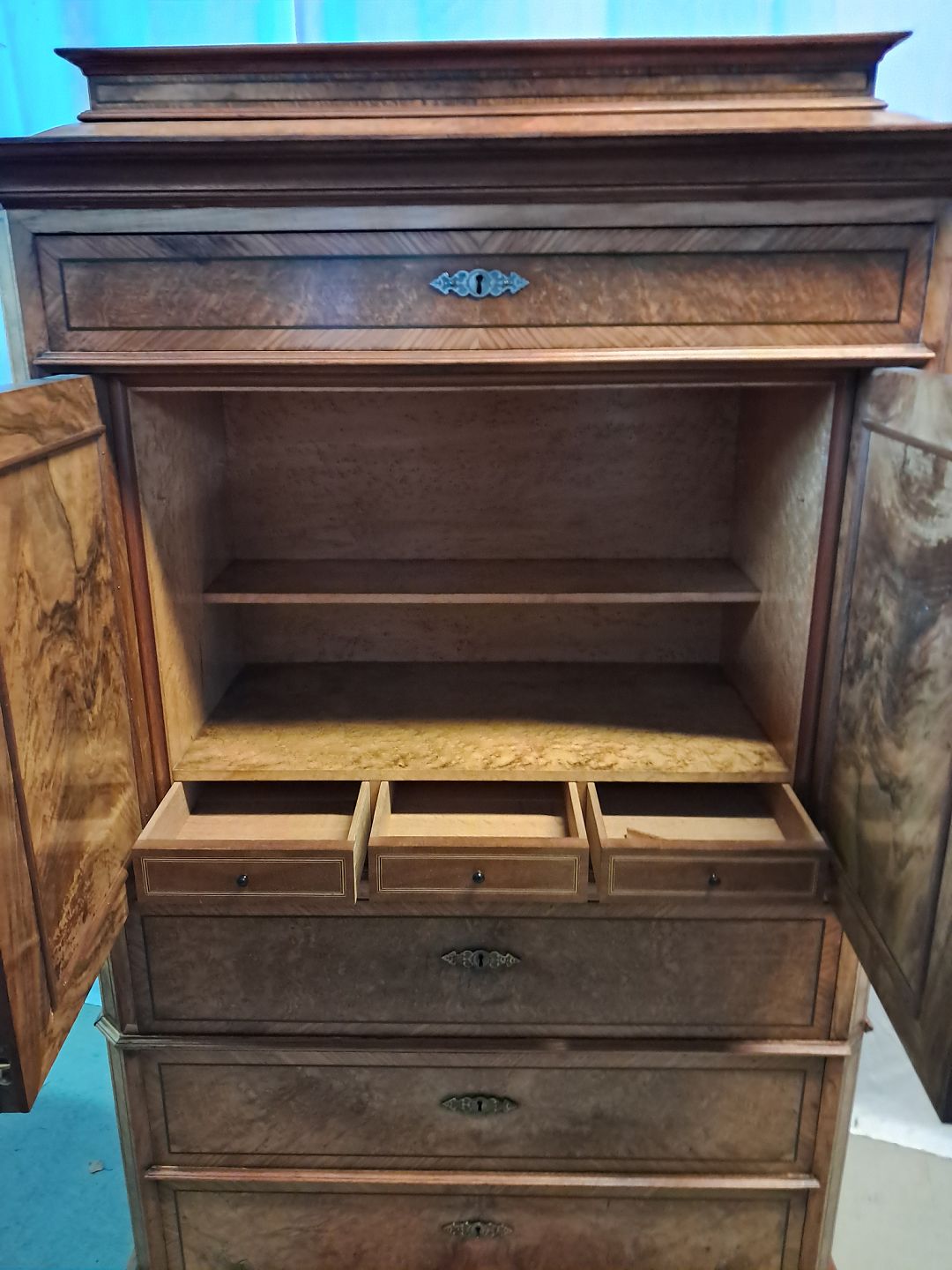 Sølvtøjsskab i fineret nødetræ og mahogni, fra 1900erne.Det har brugsspor.