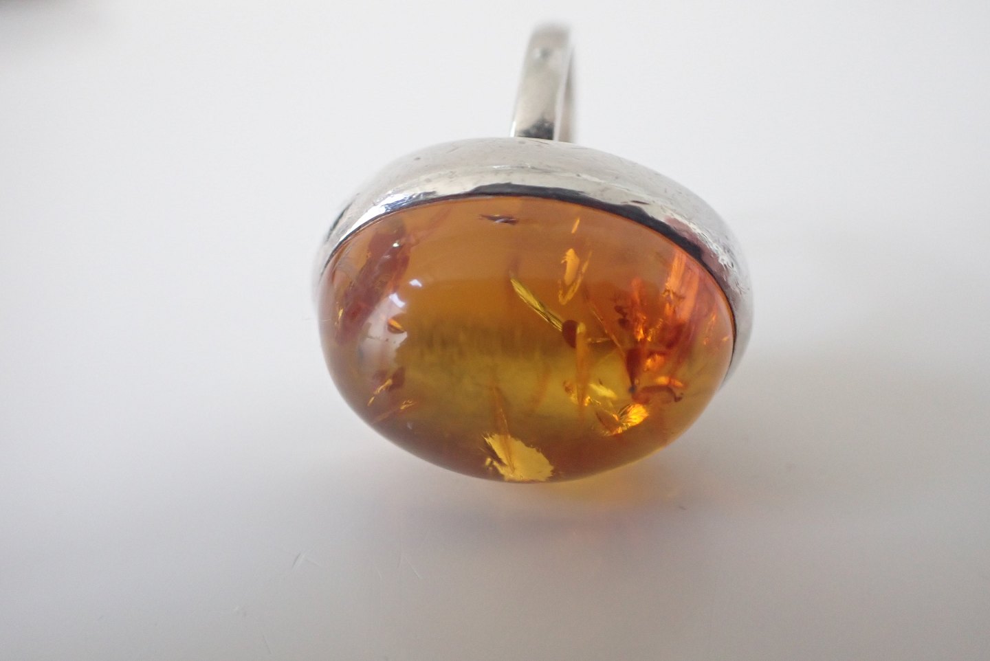 Sterling sølvring med cabochonslebet klart rav med indlejrede smådyr.