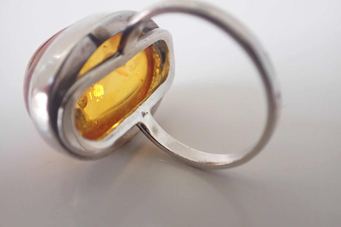 Sterling sølvring med cabochonsleben klart gult rav med indlejrede instekt/smådyr. Ravhuset. 1990.Utydeligt stempel. Str.: 56. Bredde på rav: 1,8 cm. Længde: 2,9 cm. Bredde ringskinne: 0,3 cm. Dealer