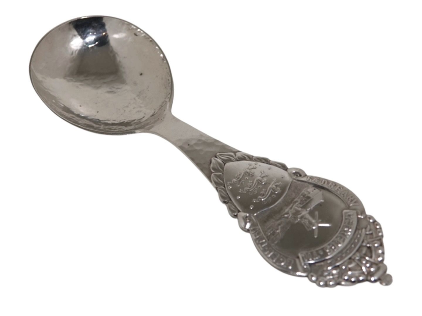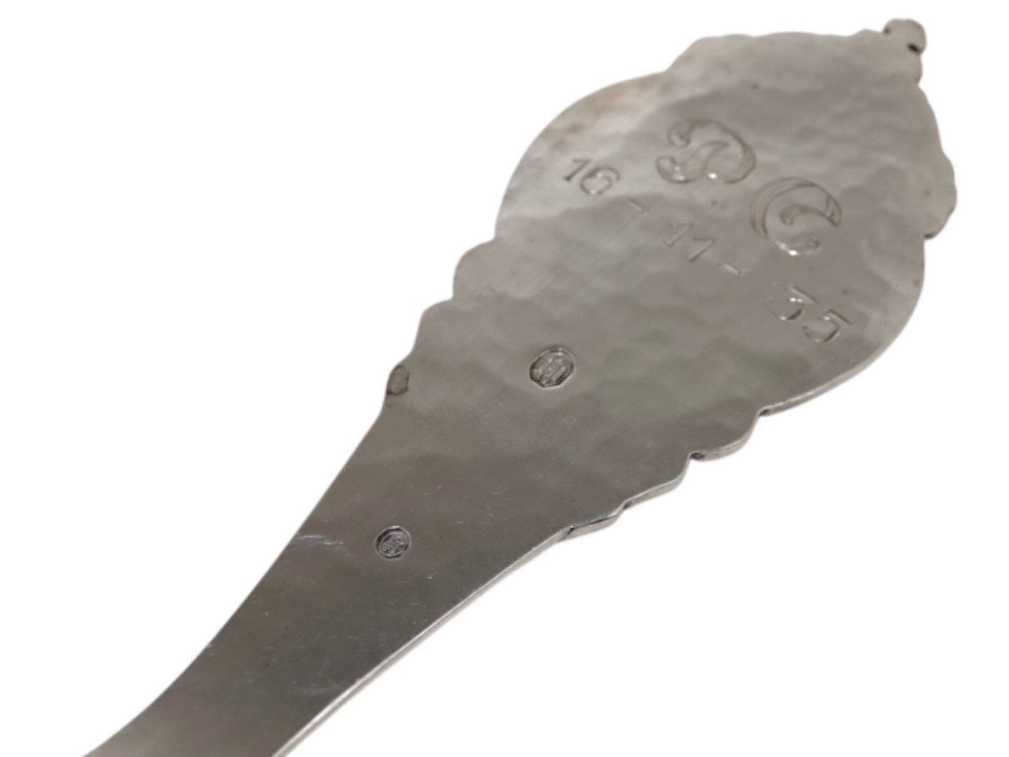 Large silver memorial spoon from 1919 with the text "Fædrearv værnedes til egn tarv".Length 18.5 cm.