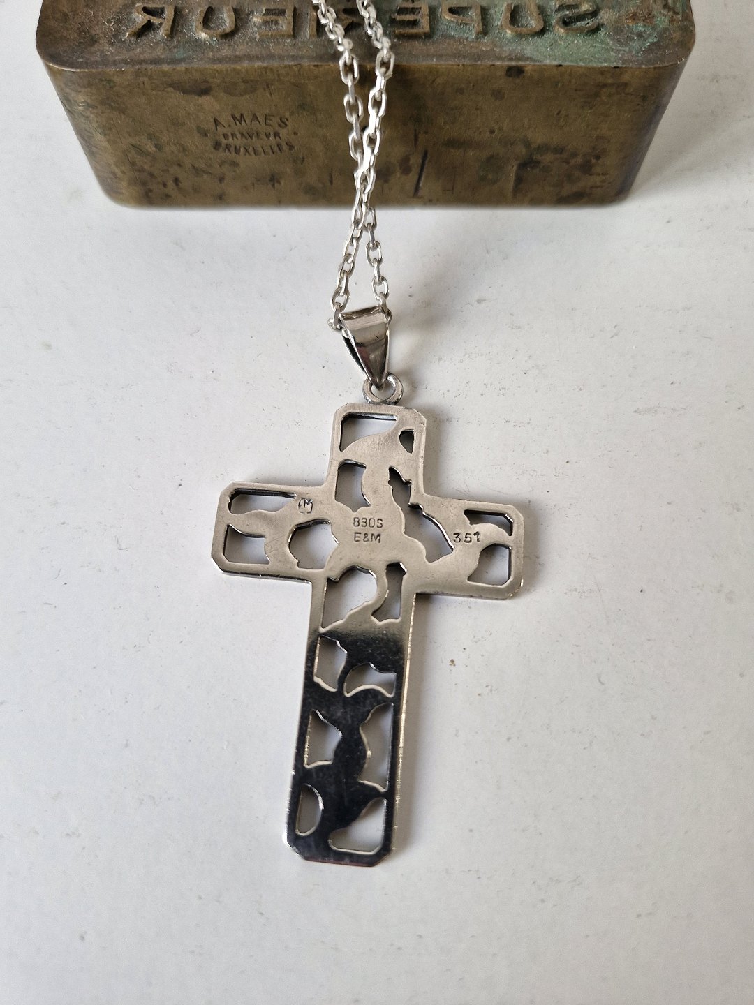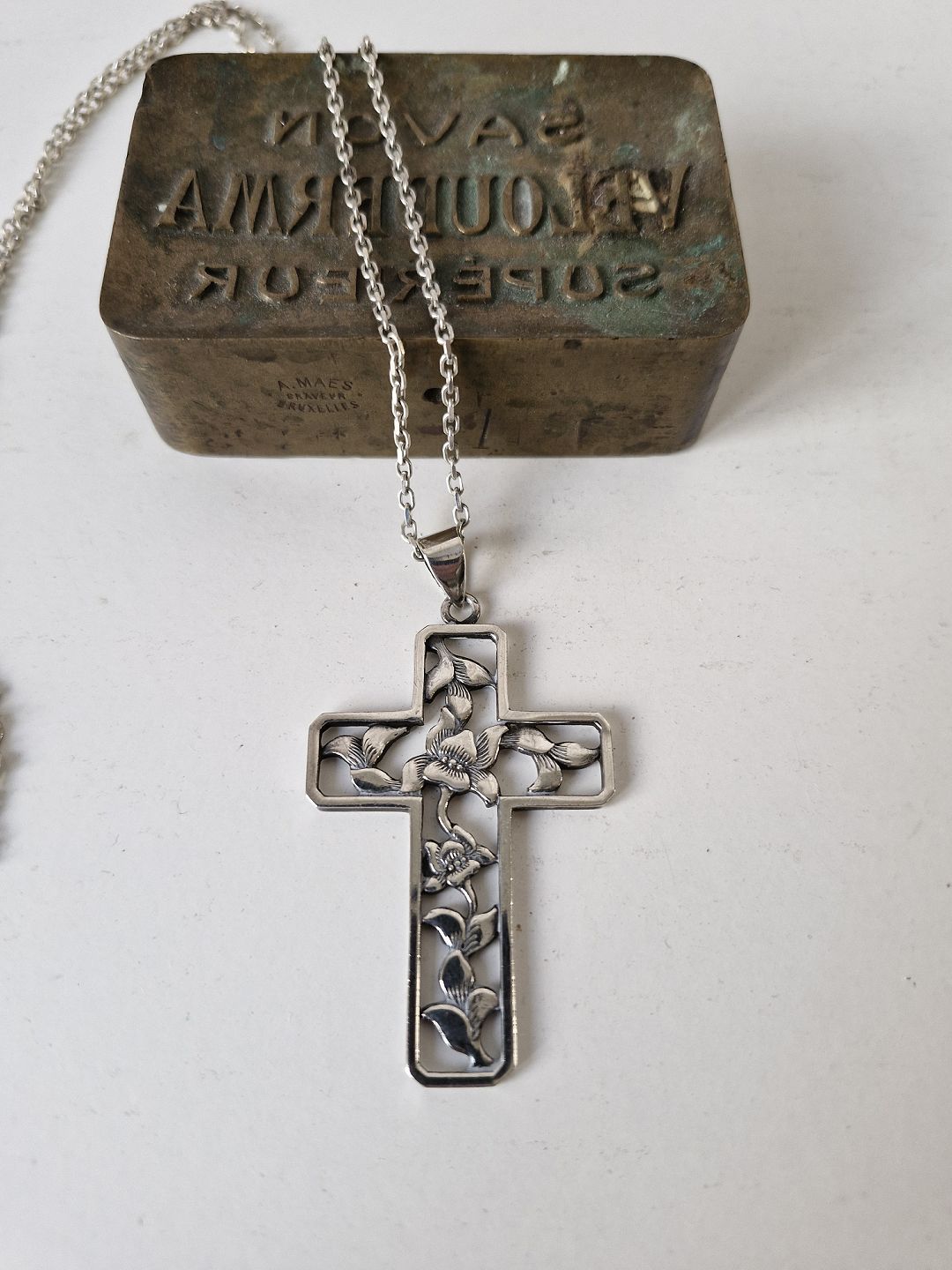 Silver necklace with large silver cross. The cross is decorated with flowers and designed by Eiler & Marløe.Stamp: 830s - E&M - 351.
