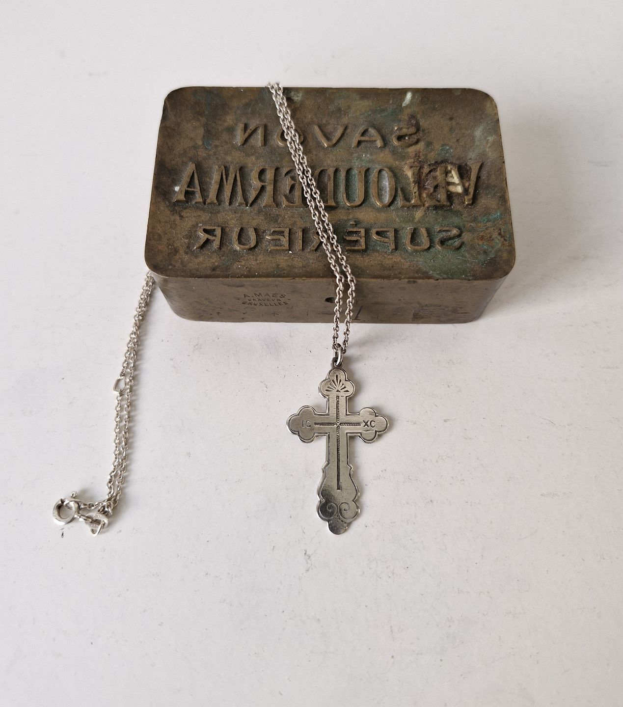 Beautiful old silver cross on a silver chain.The cross itself is stamped 813L. The chain is stamped 830s. Measurements of the cross 2.3 x 4 cm.