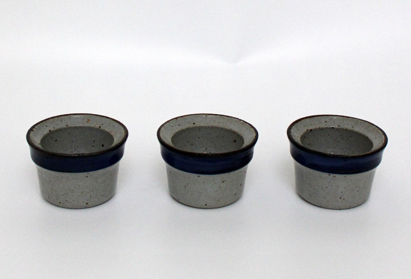 Knabstrup, Christine stentøjsstel grå glasur med blå kant. Designet af den tyske kunstner Christine Konschak, som var tilknyttet Knabstrup i perioden 1967-1970.Æggebæger. Højde 4 cm. Diameter 6 cm. Pris: 60 kr. stk. Lager: 3