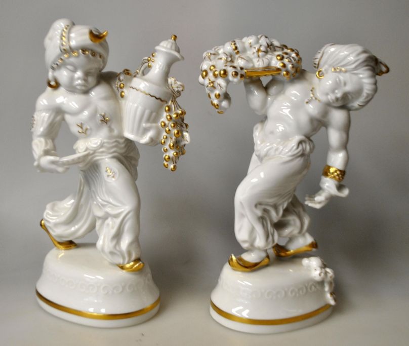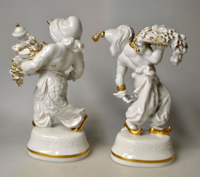 Tutter, Karl (1883 - 1969) Germany: Two figures of blanc de chine with gold decorations in the form of male figures carrying a fruit platter and a wine jug respectively. Inscribed K. Tutter. Hutschenreuther, Selb-Bavaria, Abteilung für Kunst. H. 21 and 22.Item number: 28275