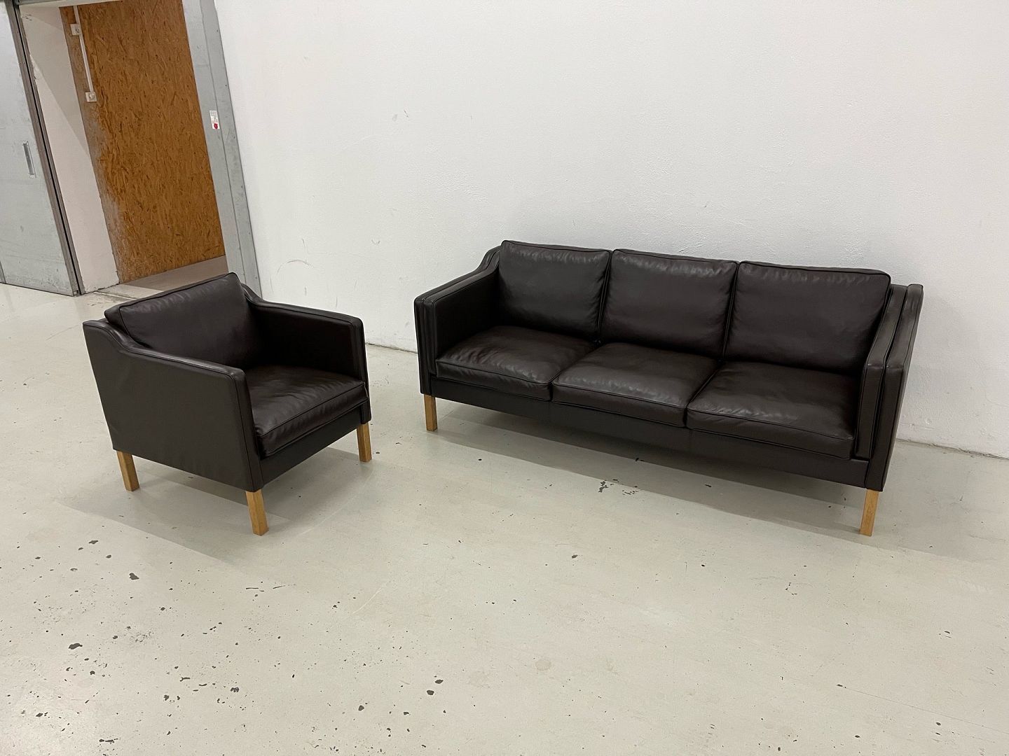 Ilva DC3600 sofa set consisting of 3 people. Sofa and chair in Dark Brown leather and with oak legs. New price 28,999,- Sofa and chair can be sold separately if desired, sofa 13,000,- chair 5,000,- The set is like new and virtually unused, just cleaned and leather-treated. Seats: cold foam w/Duntop cushion. Back cushions: down granules. Sofa measurements. Length 200 cm. Width 82 cm. Height 75 cm. Seat depth 52 cm. Seat height 44 cm Our concept. Purchase of newer/used furniture. Thorough cleaning and treatment. Viewing by appointment. Free delivery throughout Denmark to the curb for purchases over 10,000,- and worldwide at reasonable prices. Dealer