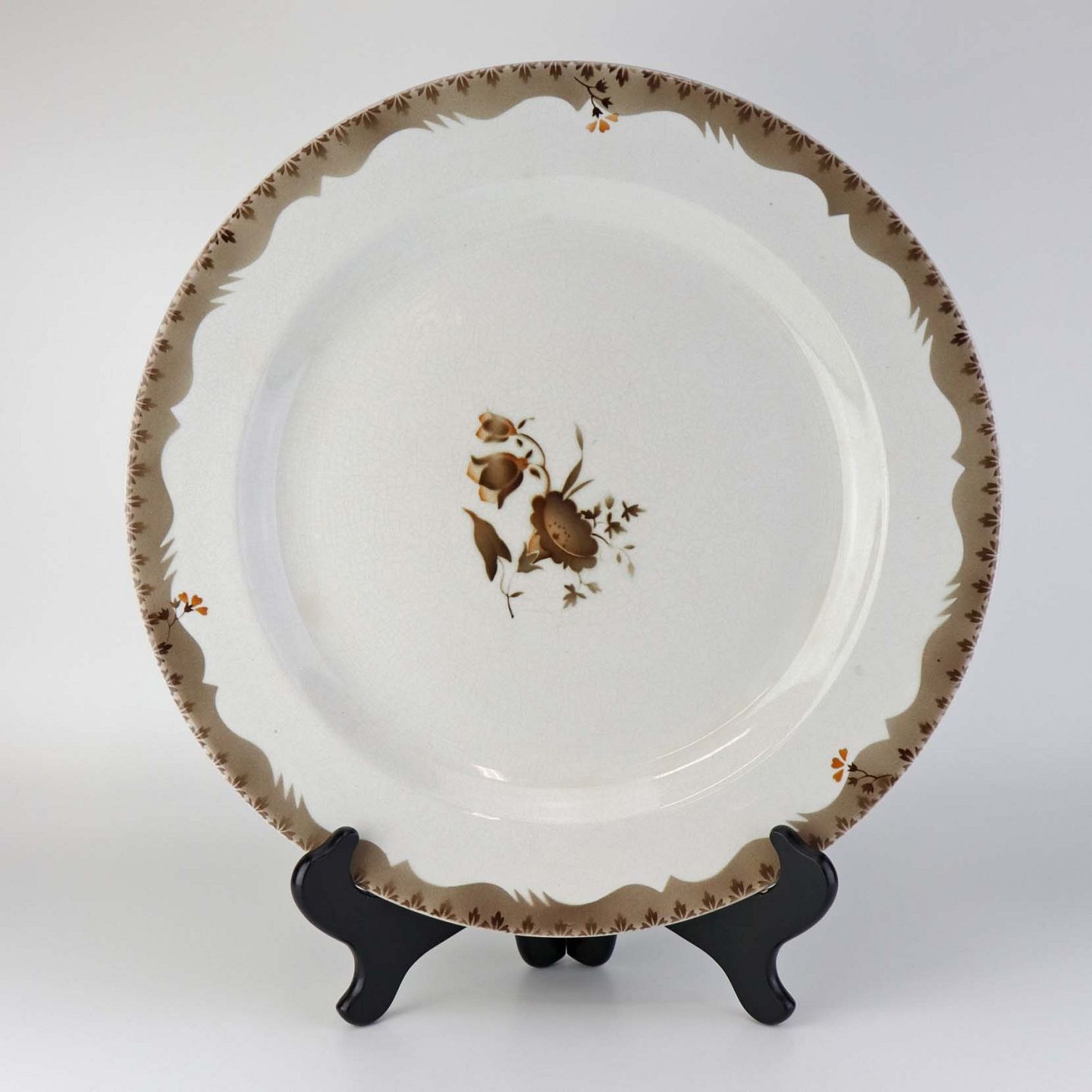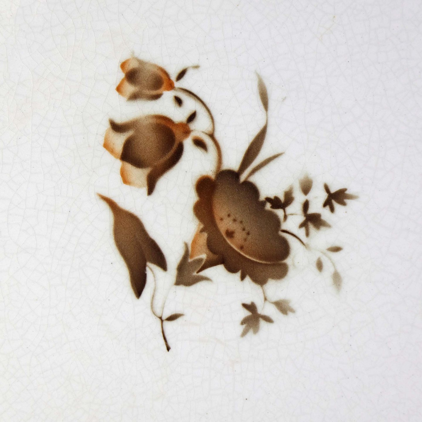 Stel i glat hvid fajance i stelform C med dekoration af brune snerleblomster og lysebrun kant med bladmotiv. Stellet blev produceret i perioden år 1930-1941