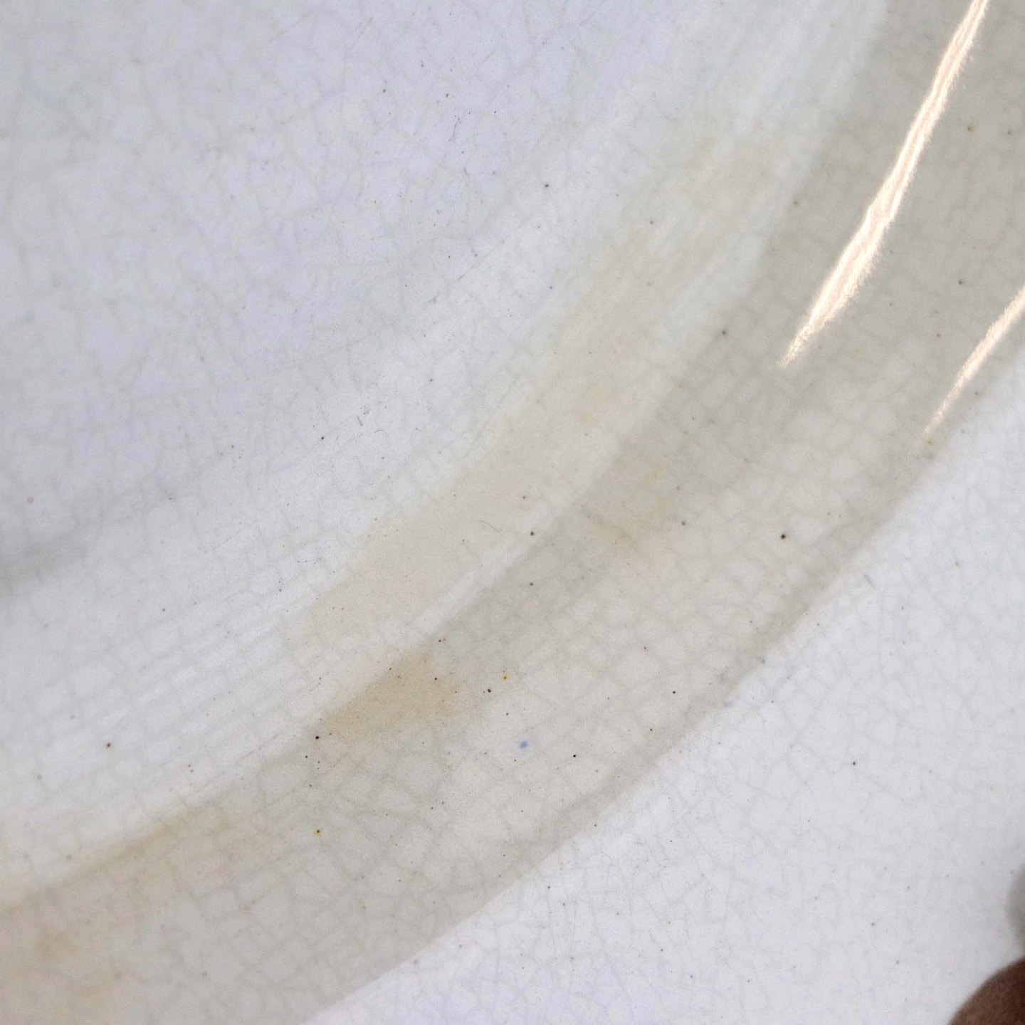 Fremstår med krakkeleringer i glasuren og mørkninger under glasuren samt på fadets kant på undersiden.