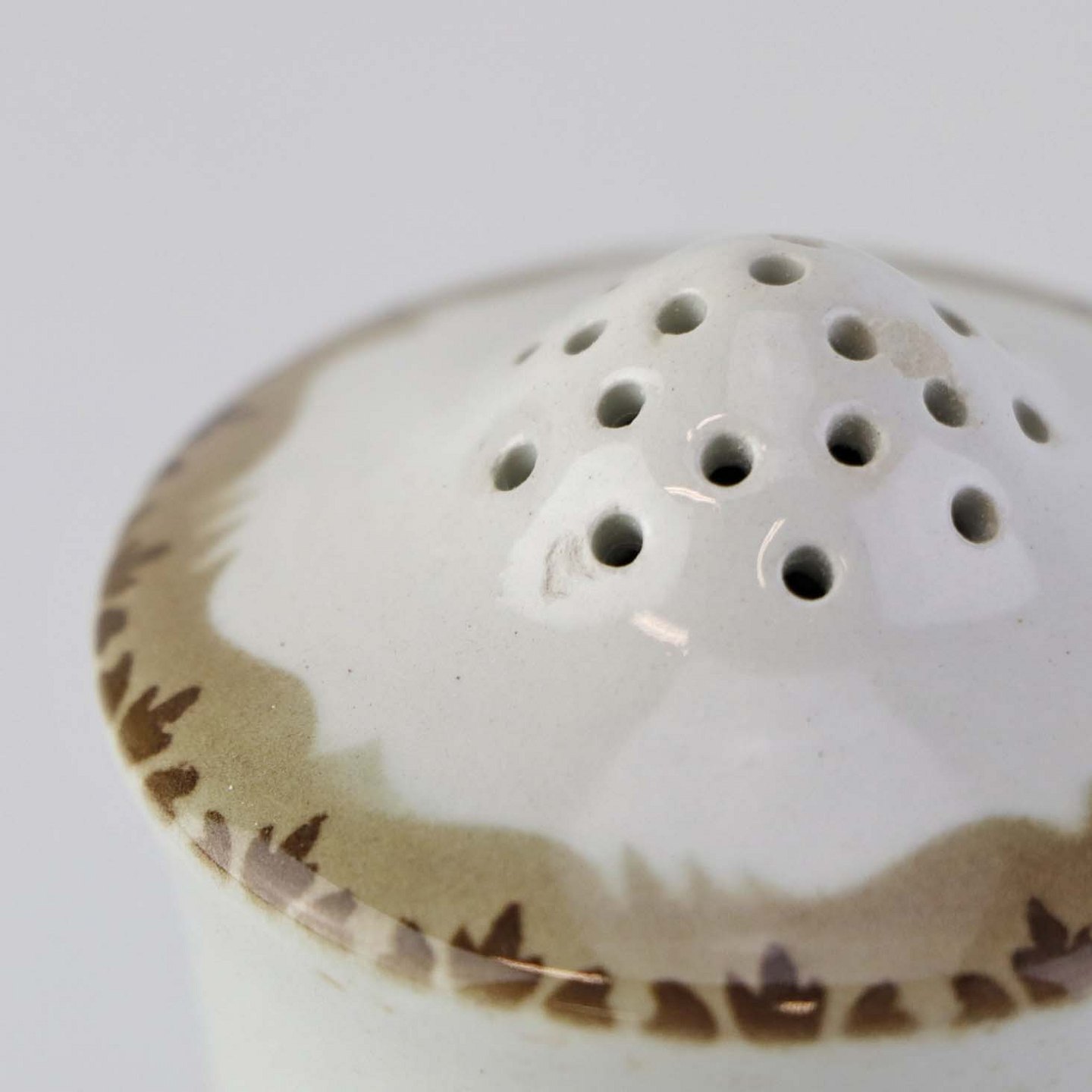 Fremstår med mørkninger under glasuren samt et mindre nøk på toppen af saltbøssen.