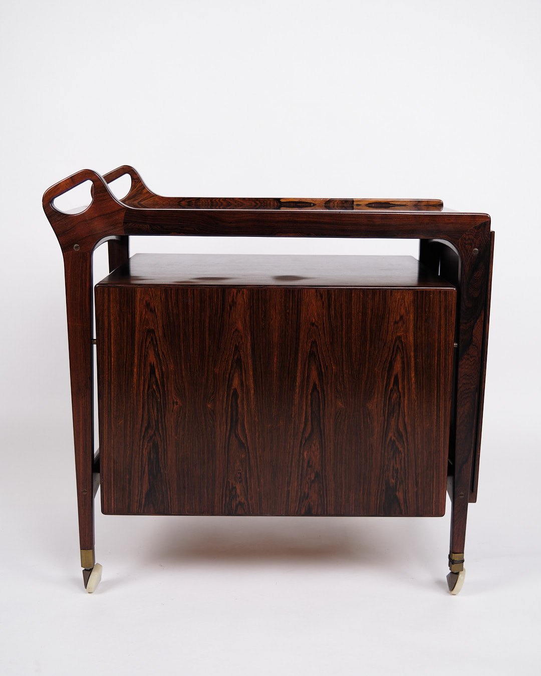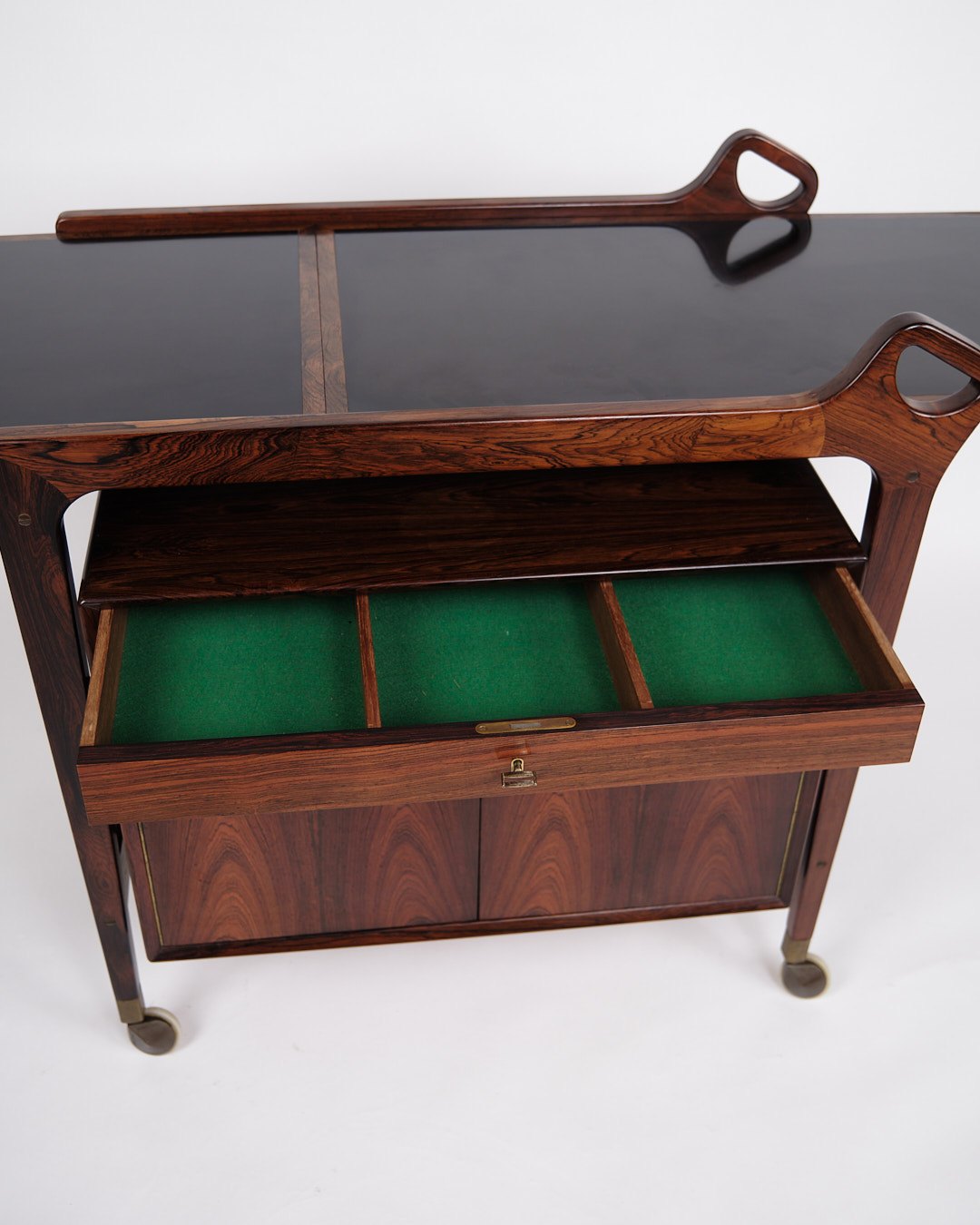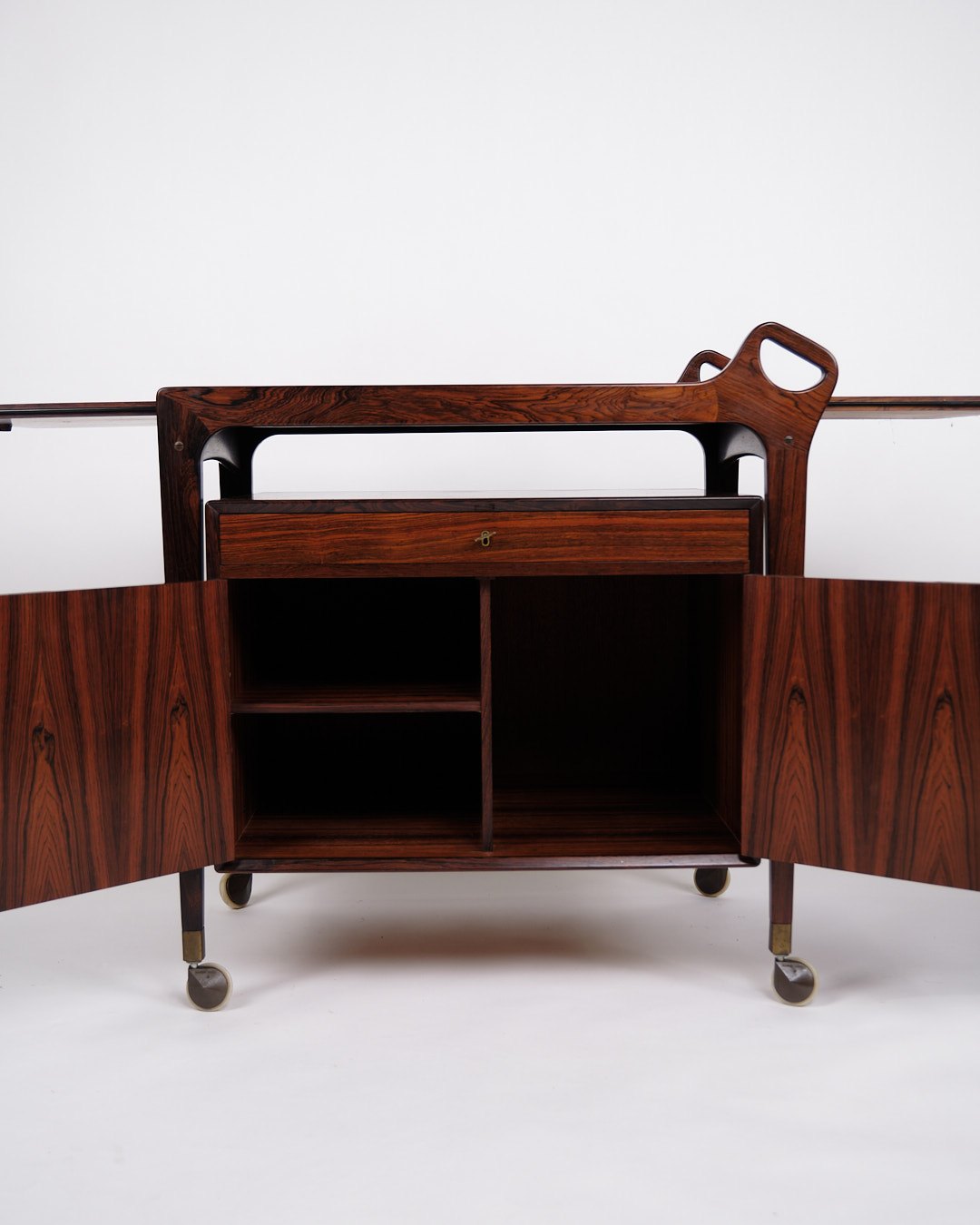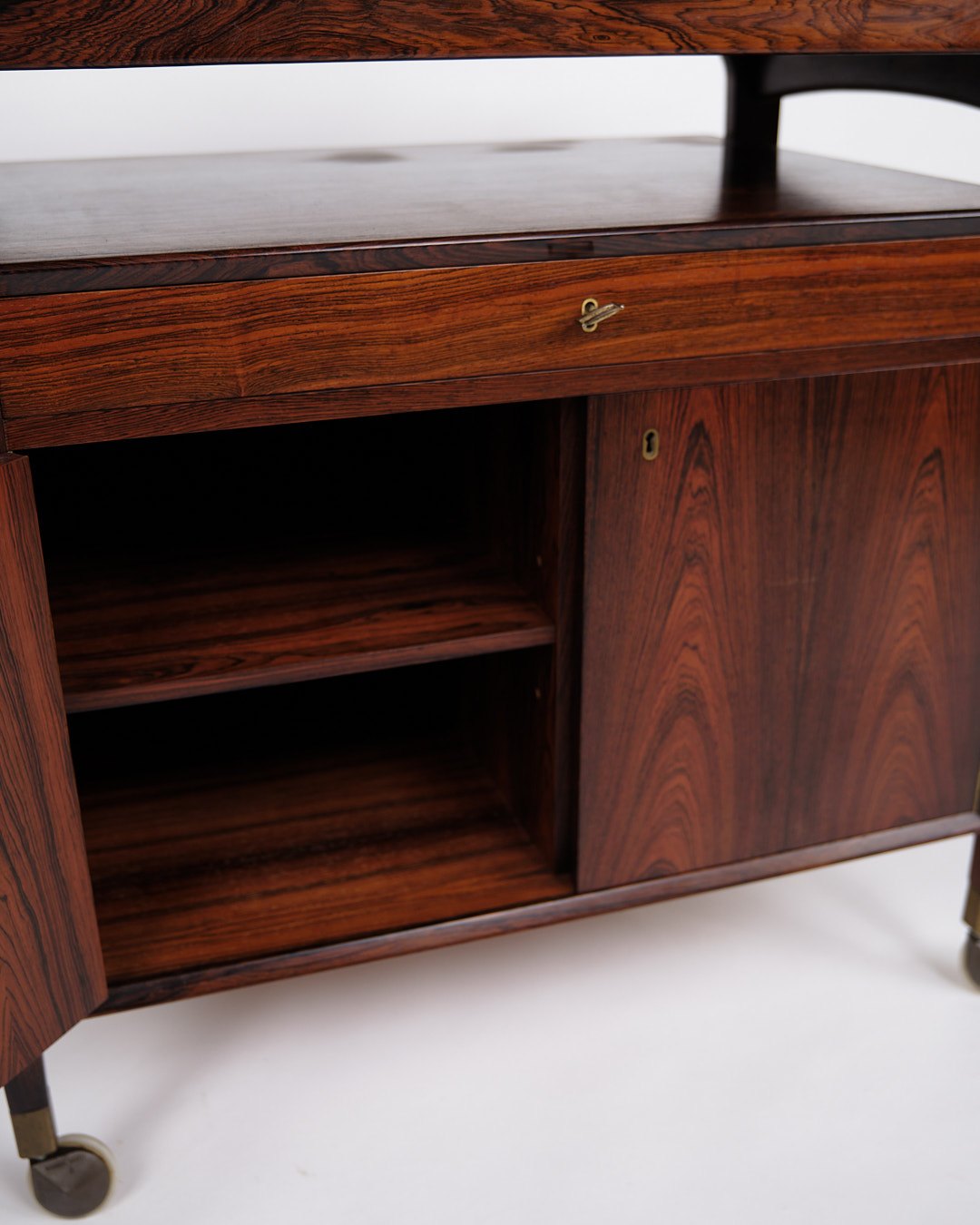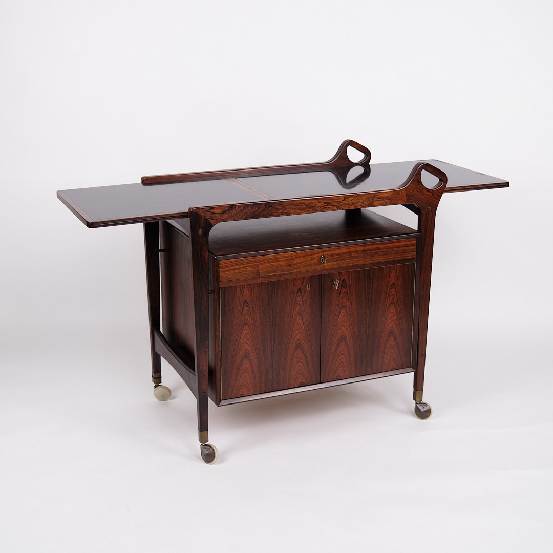 bar cabinet from Dyrlund, made of rosewood with black formica and handles in solid rosewood. The cabinet is mounted on wheels for easy mobility and has a foldable top that can expand the width from 86 cm to 142 cm. The combination of exclusive materials and functional design makes this bar cabinet a classic example of Danish furniture craftsmanship from the 1960s.— Origin: Denmark