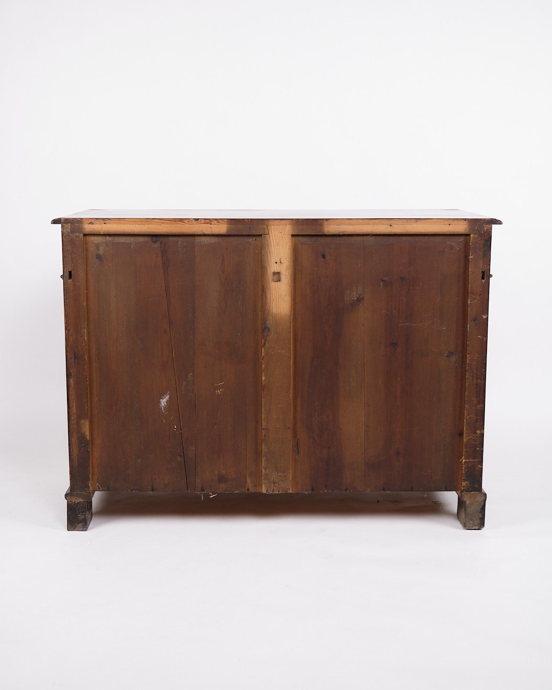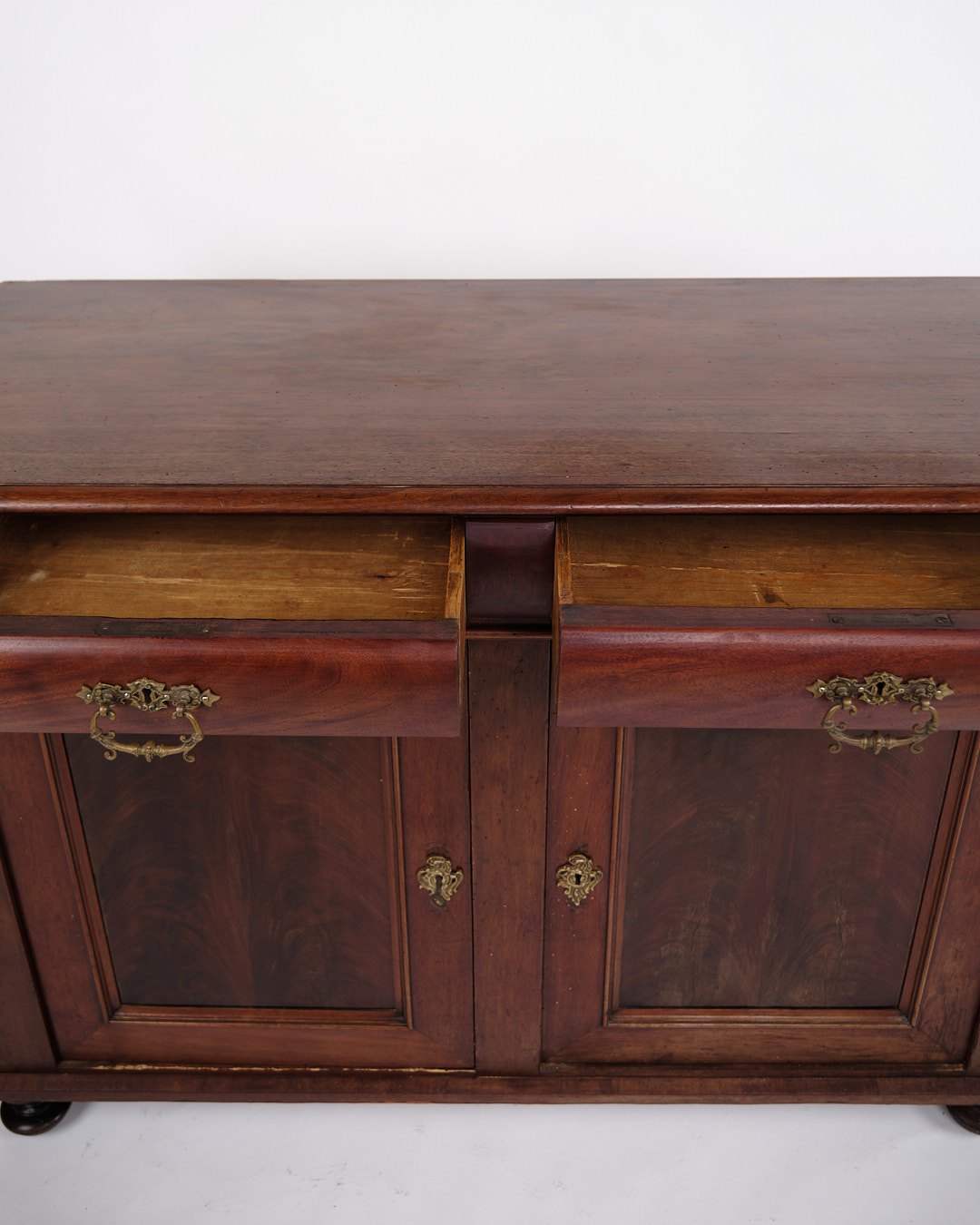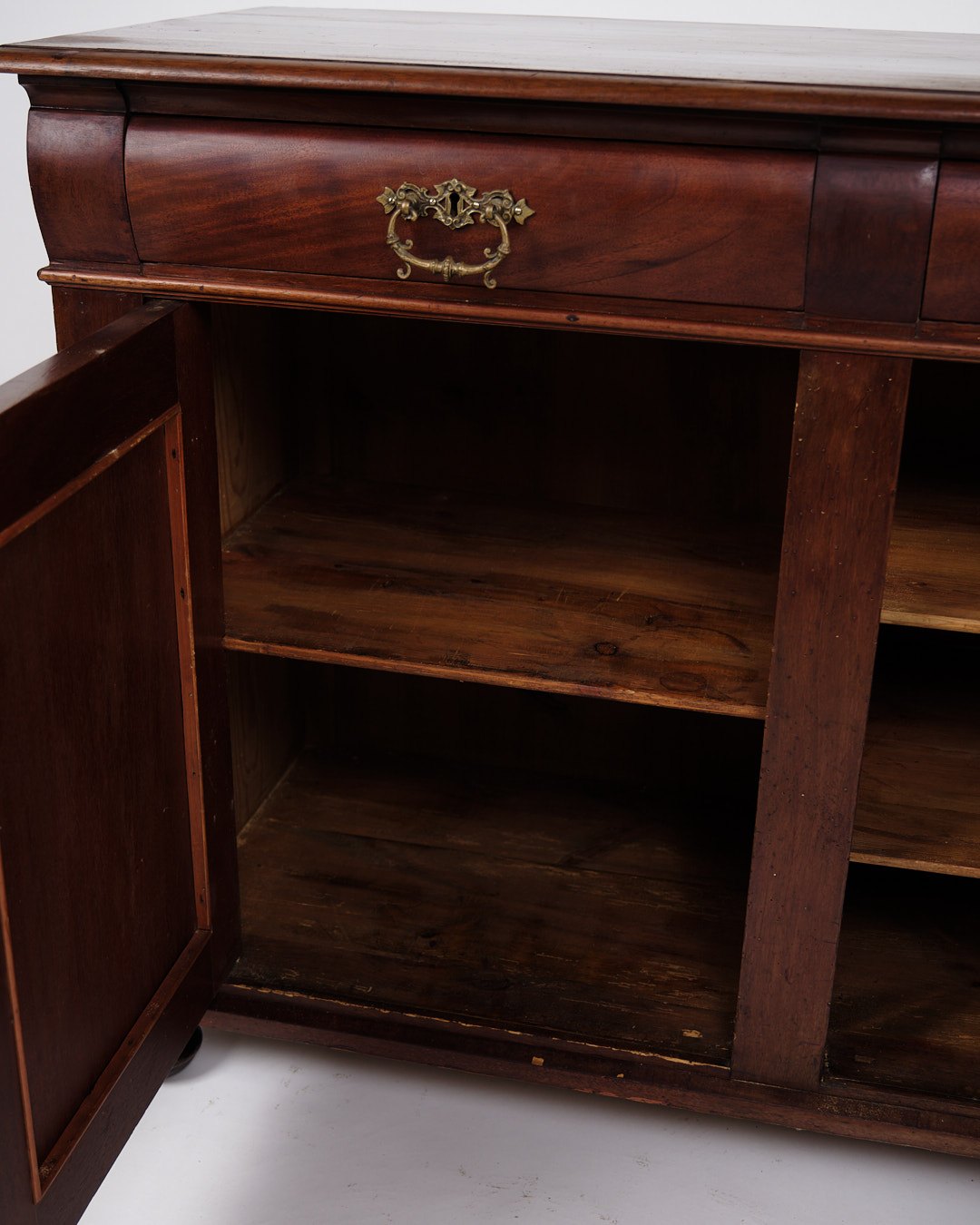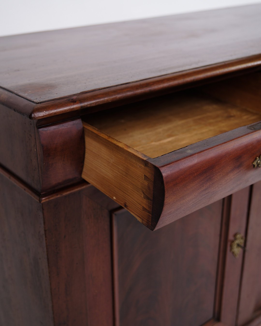 low antique sideboard from the 1880s, made of hand-polished mahogany. The sideboard is furnished with fixed shelves and features period details that testify to the solid joinery craftsmanship of the 19th century.— Origin: Denmark