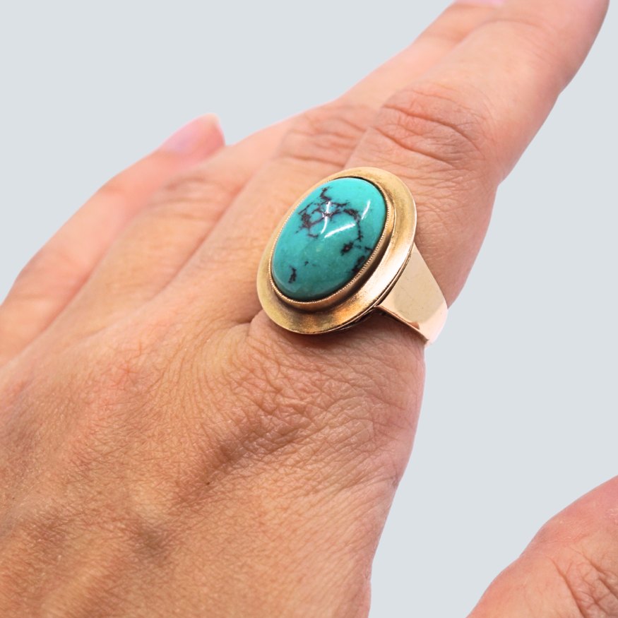 Ring of 14k gold, set with a large turquoise. From around 1970.Front of the ring L. 2,5 cm.