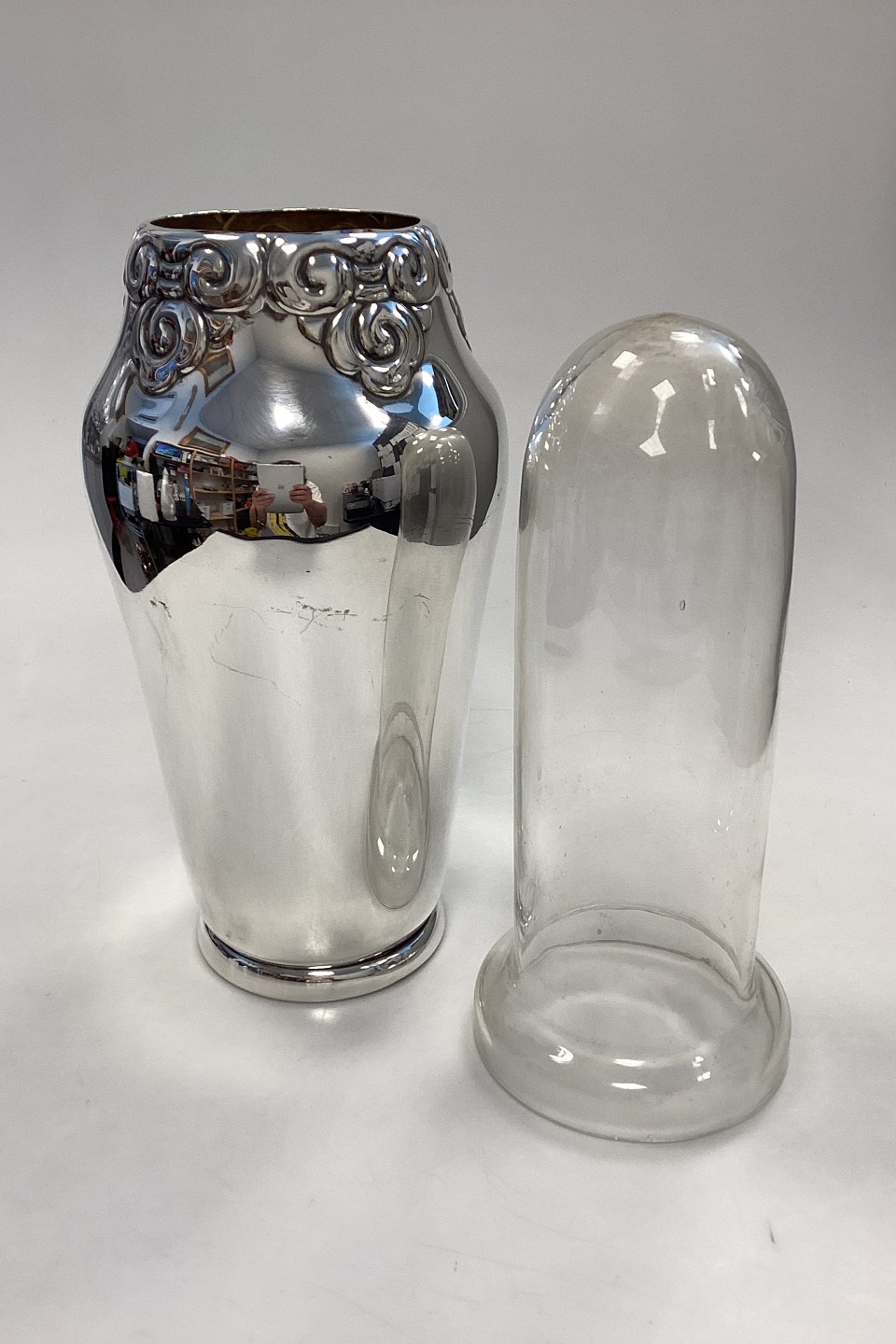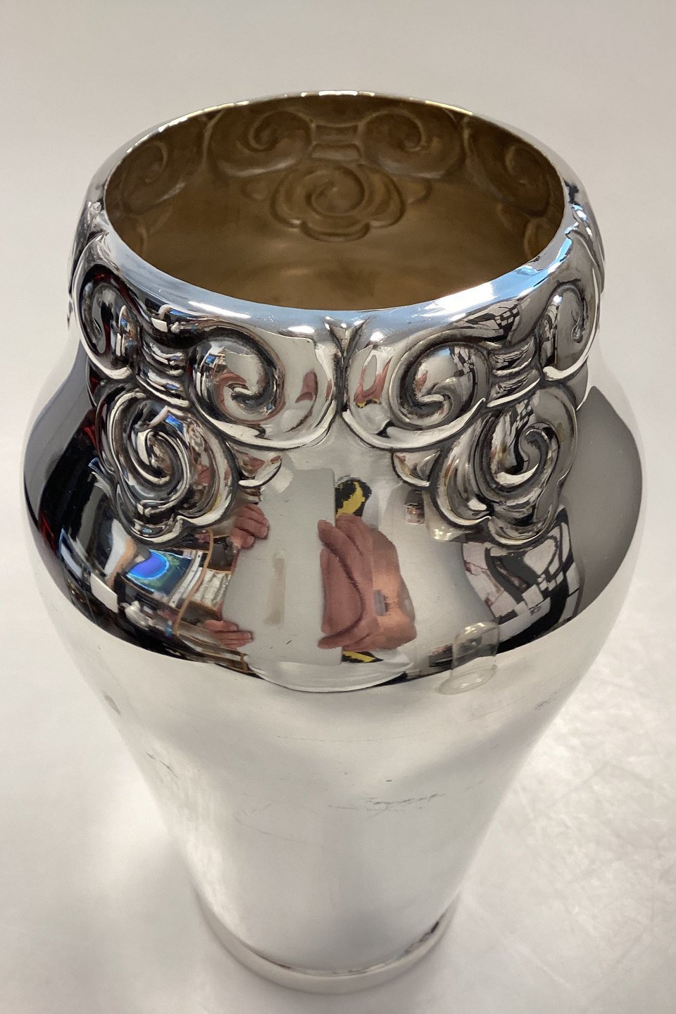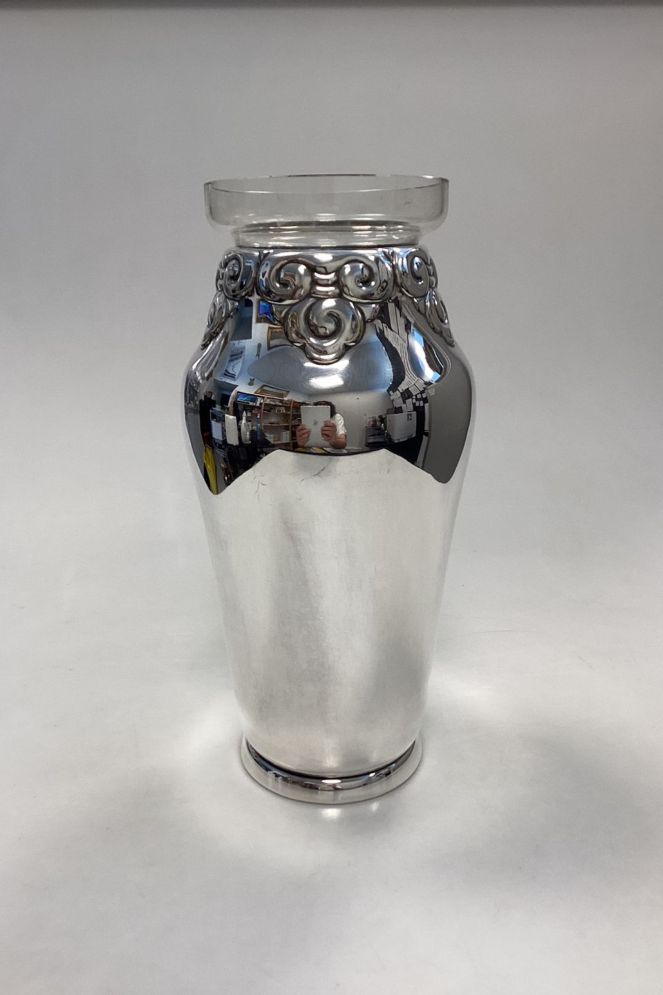Art Nouveau / Deco Silver Plated Vase with glass insert. Danish produced brand Eneret Astral. Clear signs of wear on one side, see photos.Measures 28 cm / 11.02 in. and with insert 31 cm / 12.20 in.