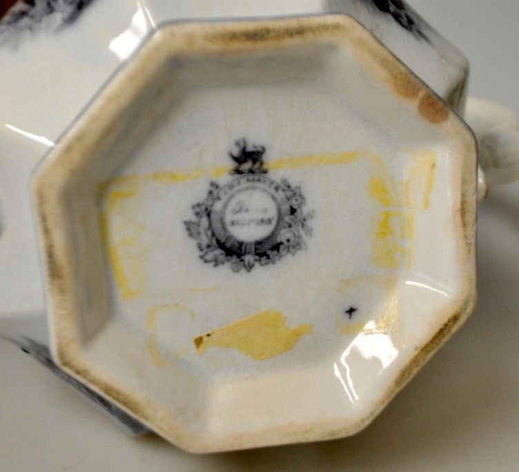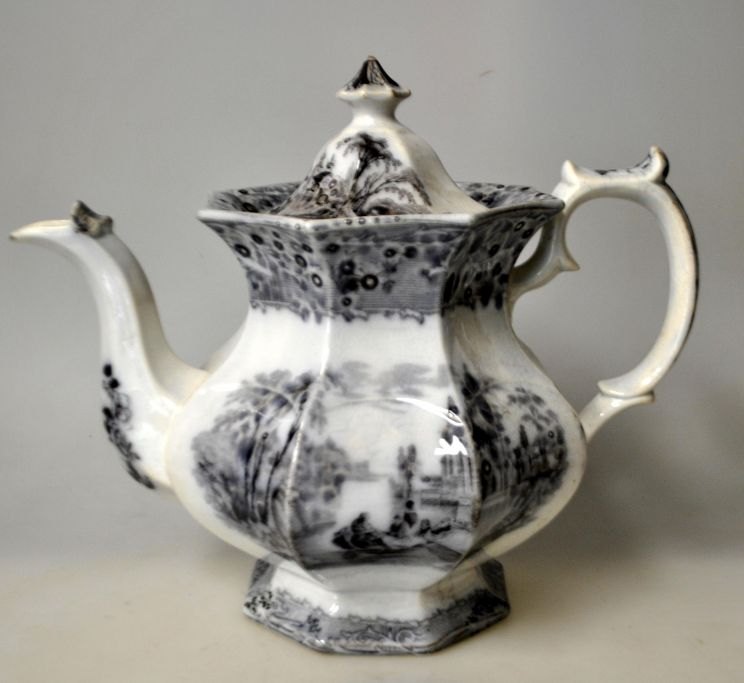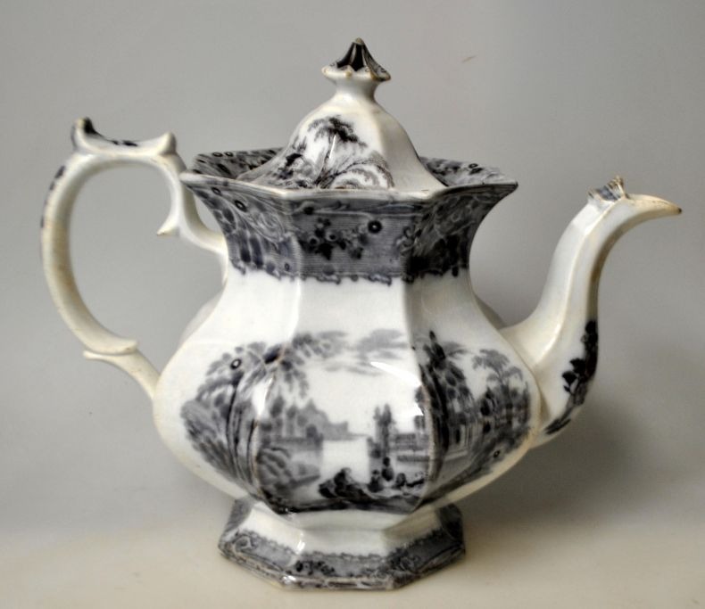 English earthenware coffee pot, circa 1850. Blue transferware. Mayer Staffordshire. 8-sided body with lid, handle and spout. Decorated with classical scenery with people in a boat on a lake. Stamped. H.: 22 cm. L.: 27 cm.Perfect condition - except for a small edge nick on the lid.