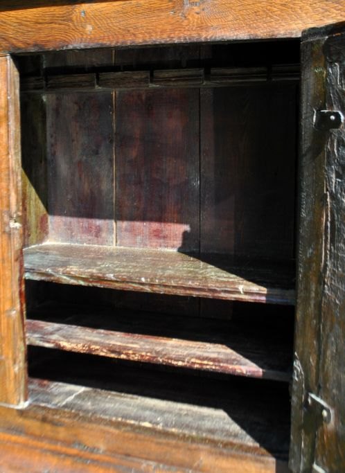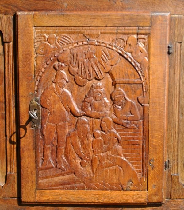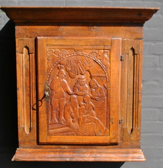 Antique Danish baroque hanging cabinet in oak, mid-18th century. With antique lock and key. Front door with carving of the Holy Three Kings. Inside with two shelves and a spoon shelf at the top. H.: 70 cm., W.: 61 cm. D: 26 cm.Item number: 28031