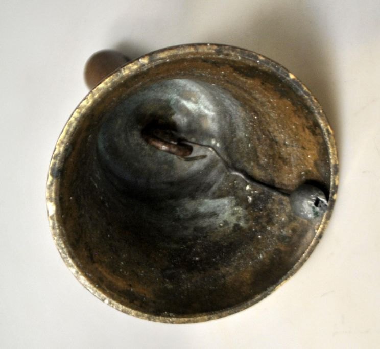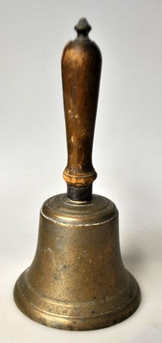 Antique 18th century baroque table bell made of ore. With a handle made of turned wood. H.: 22 cm.NB: The handle is split.