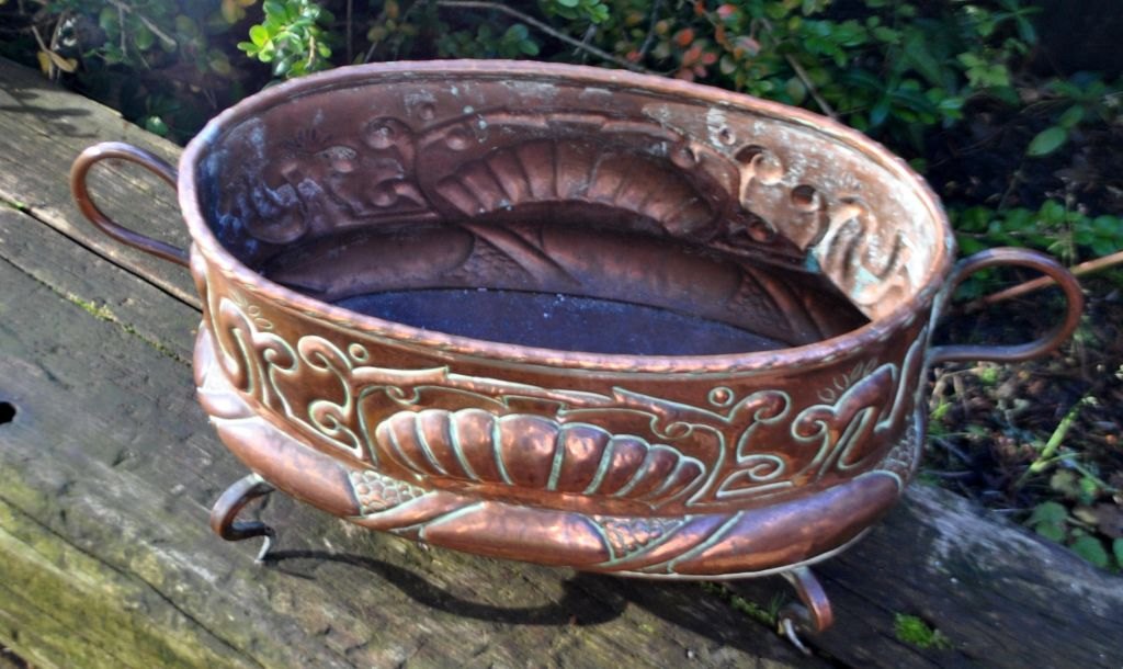 Haraldkjær flower bowl in copper, 19th century. Denmark. With beaten out rococo decorations. Oval. With two handles and 4 baroque legs. H.: 20 cm. L: 42 cm.Perfect condition!