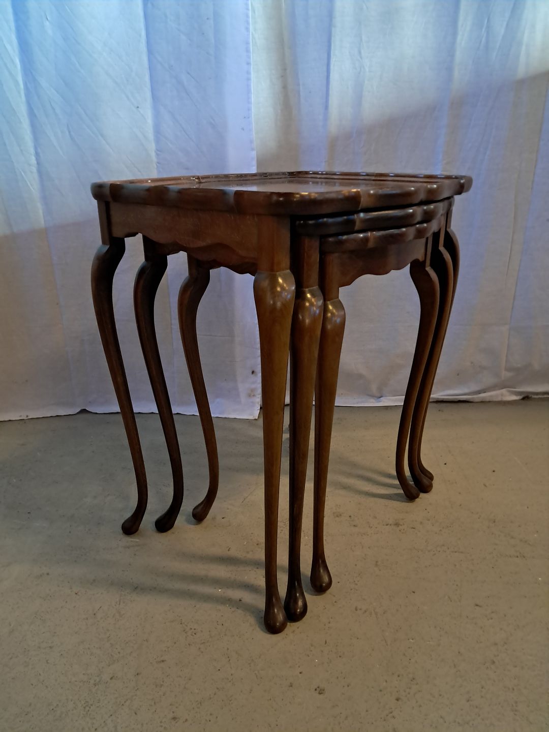 3 Indskudsborde i massivt bøgetræ og fineret nøde og rosentræ, fra 1980erne.De har brugsspor.