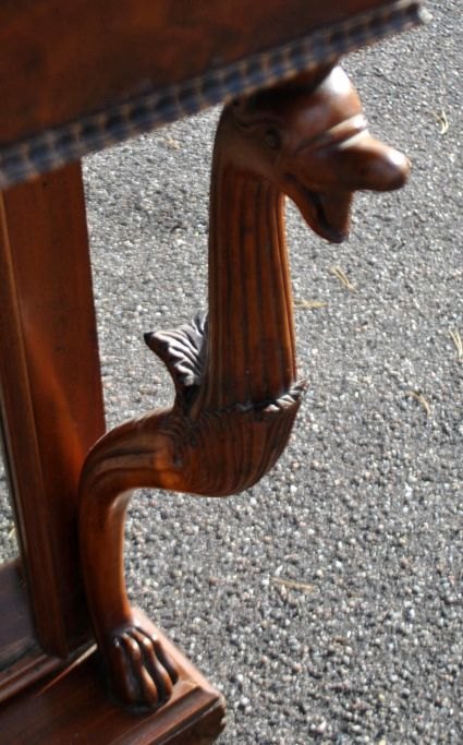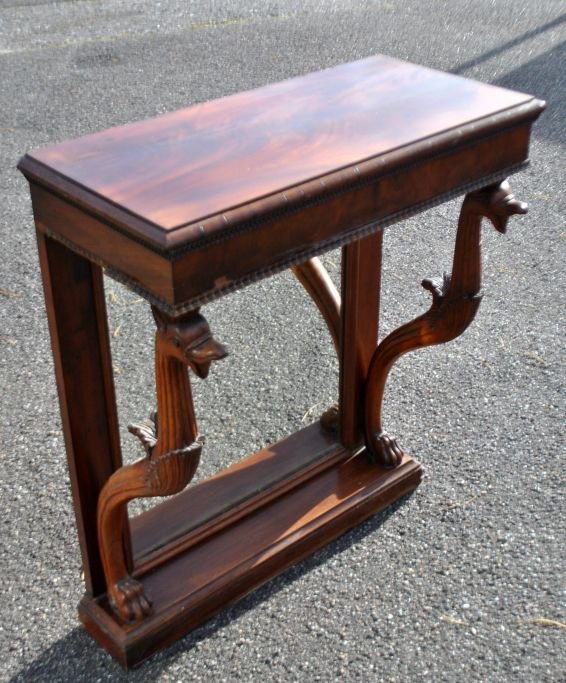 Console in mahogany, late empire, ca. 1840. Denmark. With columns in the form of griffins with lion's feet. back with mirror. H.: 87 cm. W: 71 cm. D.: 36 cm.Item number: 28293