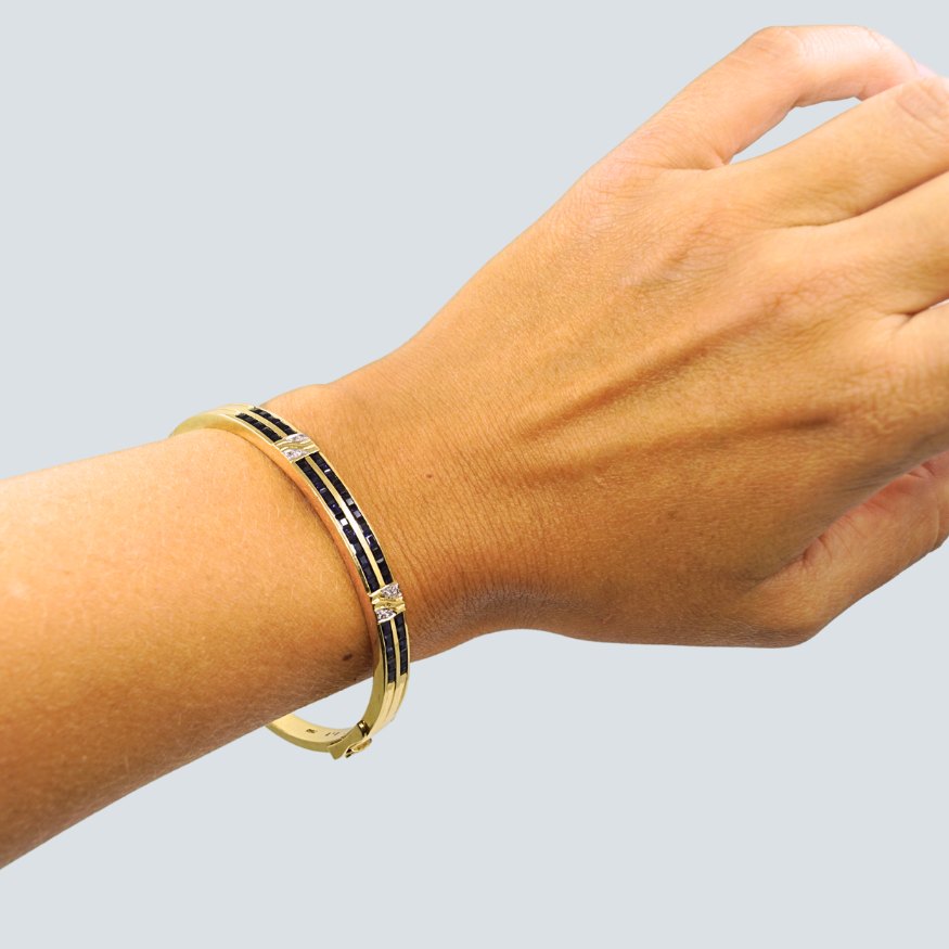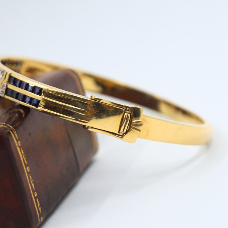 A bangle made of 18k gold, set with diamonds and several sapphires. The bangle can be opened. With clasp and safety clasp.Wide 6 mm. Inner measures 5,7 x 6,1 cm.
