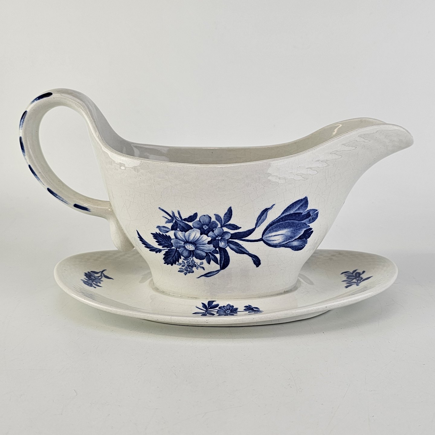 Stel i glat hvid fajance med dekoration af blå blomster og flettet kant