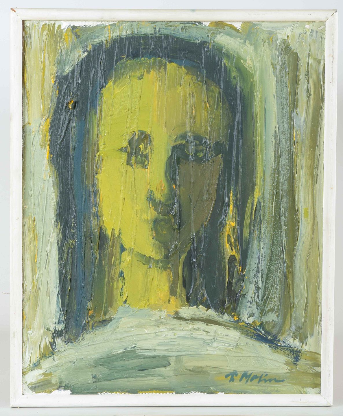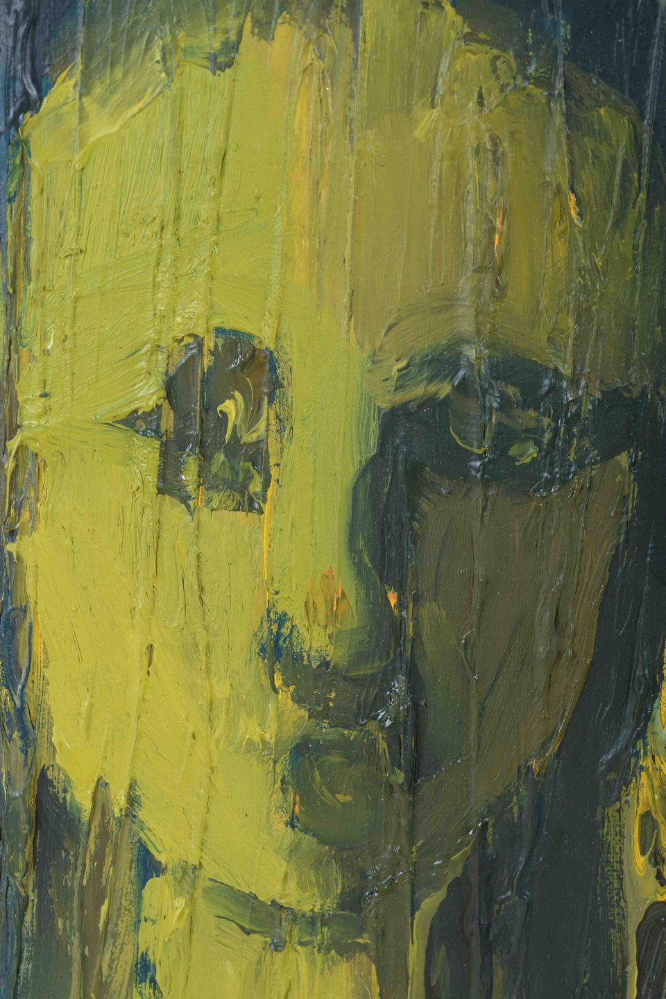 An expressive portrait executed with a heavy impasto technique, where green, yellow, and blue tones dominate. The figure appears both stylized and raw, with a dreamlike quality emphasized by the strong contrasts and textured surface.