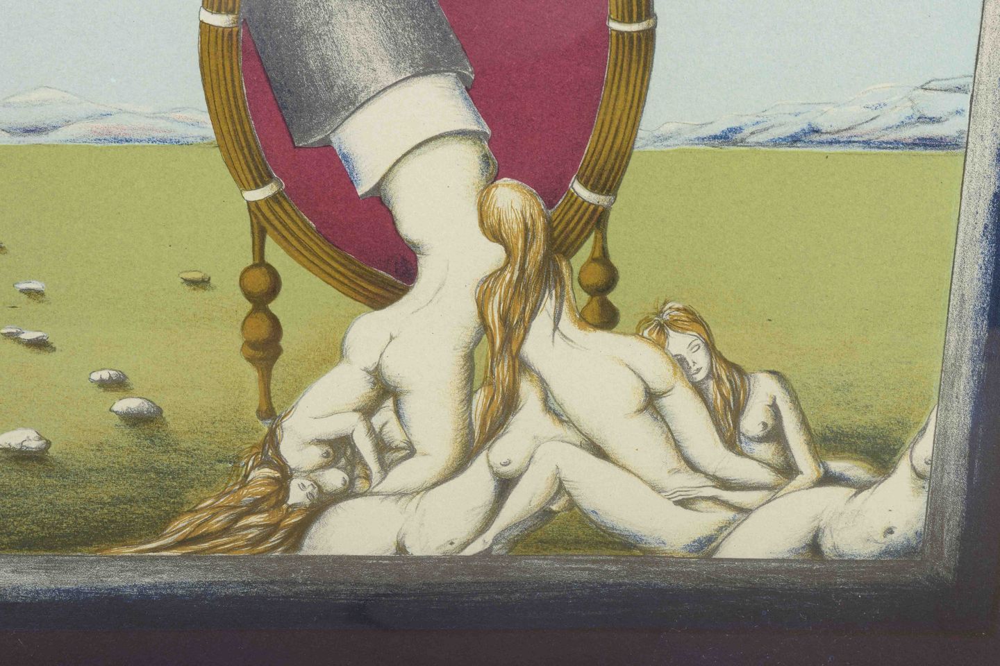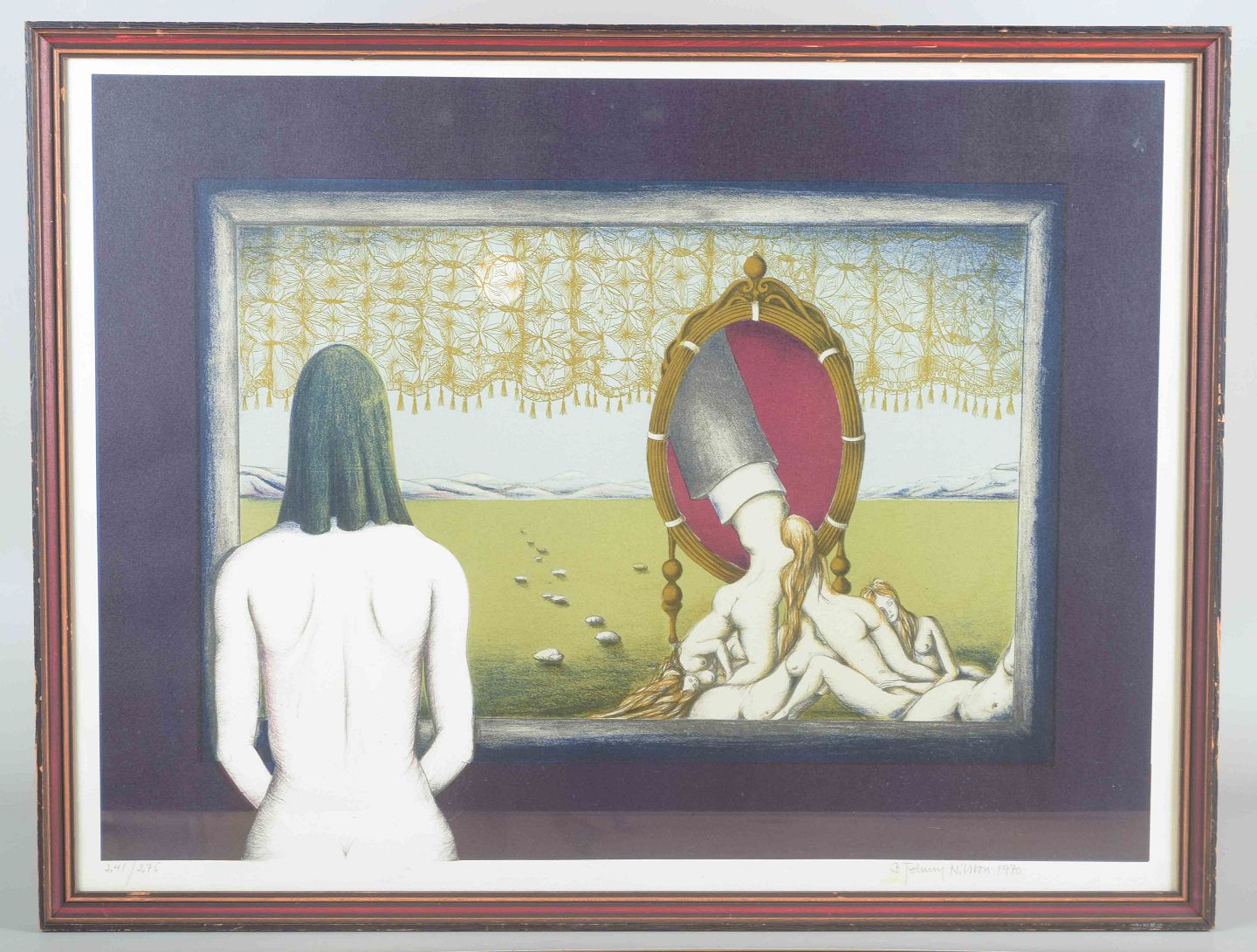 A surrealist lithograph by Swedish artist Bert Johnny Nilsson, signed and dated 1970, numbered 241/275. The composition depicts a nude figure seen from behind, facing a window with a surreal scene of a mirror, female figures, and a landscape.