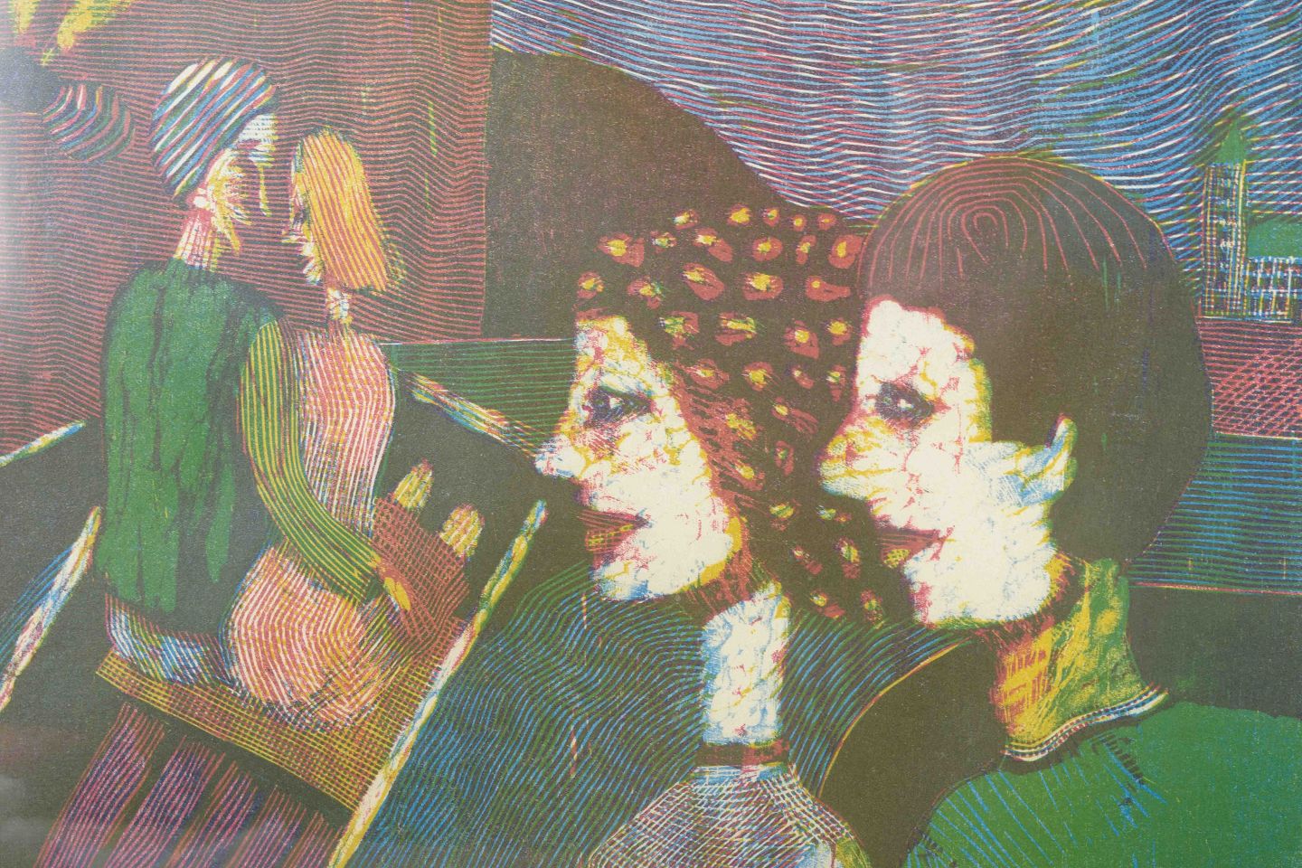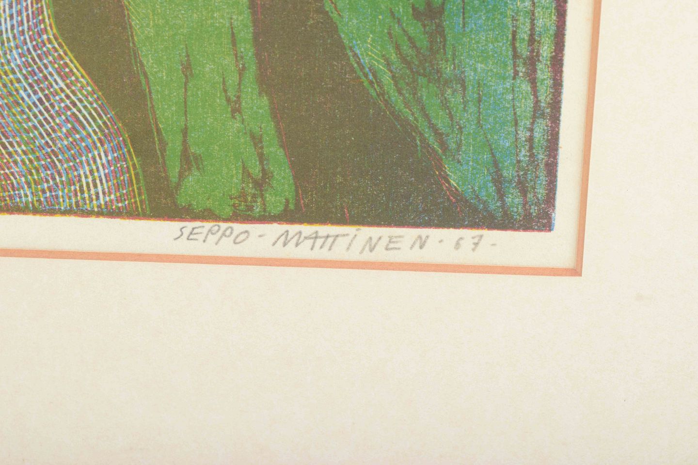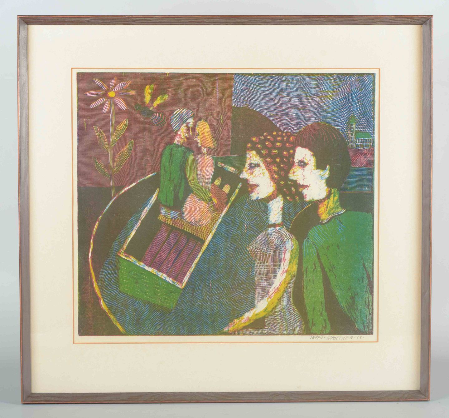 A colorful and expressive lithograph by Seppo Mattinen, depicting stylized figures in a narrative, imaginative scene, characteristic of the artist’s visual language from the 1960s.