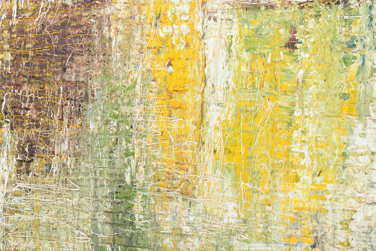 An expressive, coloristic painting with vigorous brushstrokes in yellow, green, brown, and blue tones, forming a structured, almost rhythmic abstract surface.
