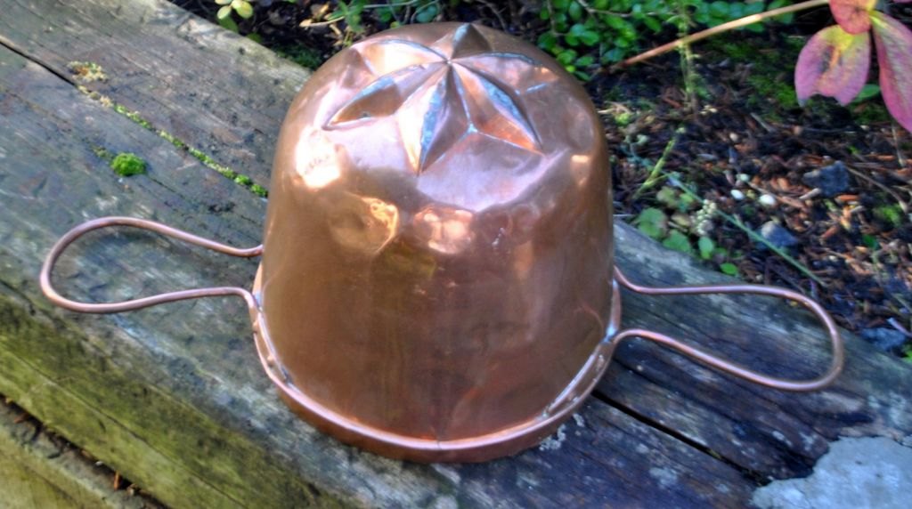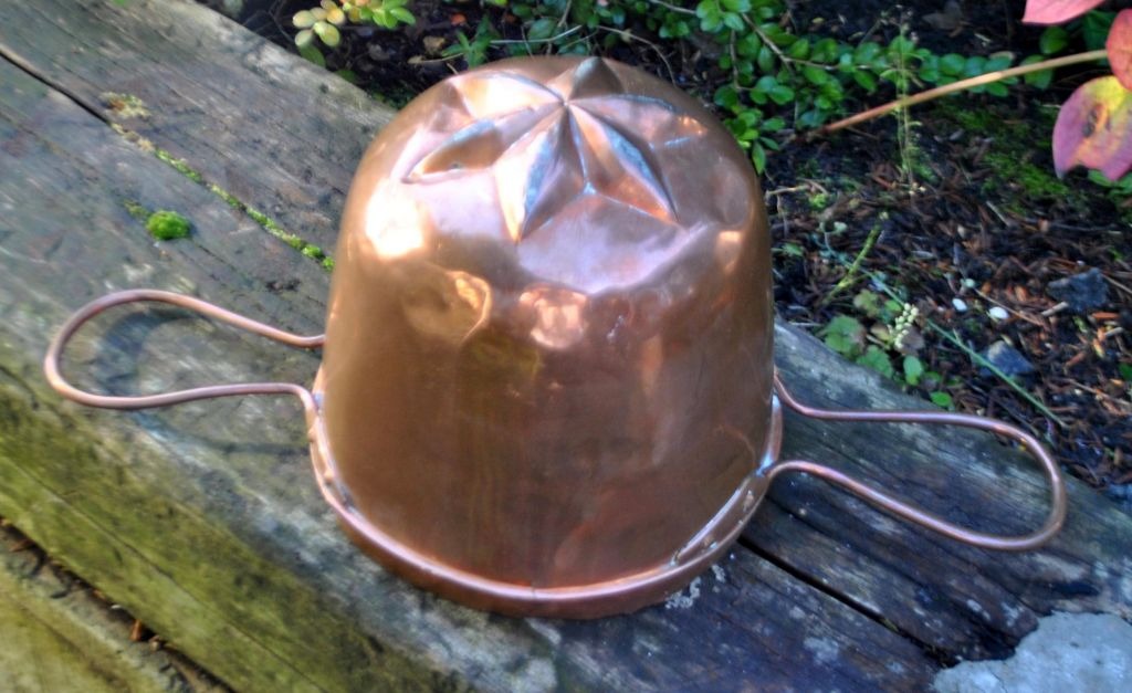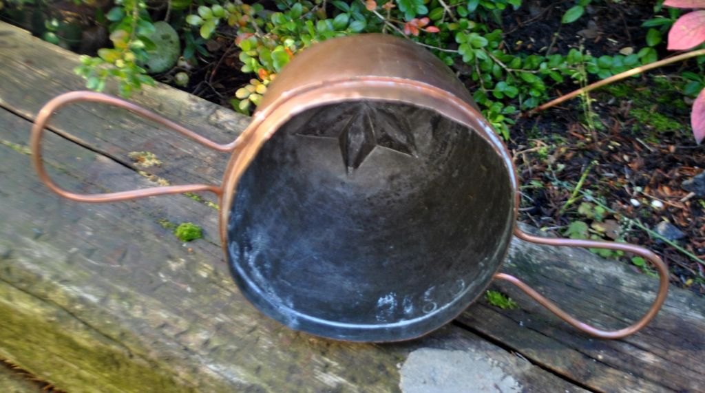 Pâté or meat dish, copper, 19th century. Denmark. With two handles and decoration in the shape of a star. Dia: 21.5 cm. Dia. incl. handle: 46 cm. H: 19 cm. No visible stamps.Item number: 28309