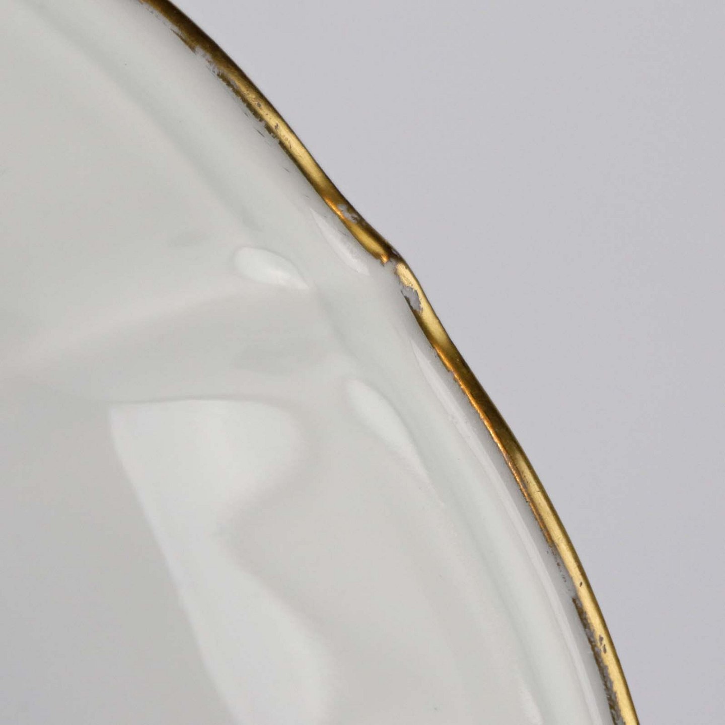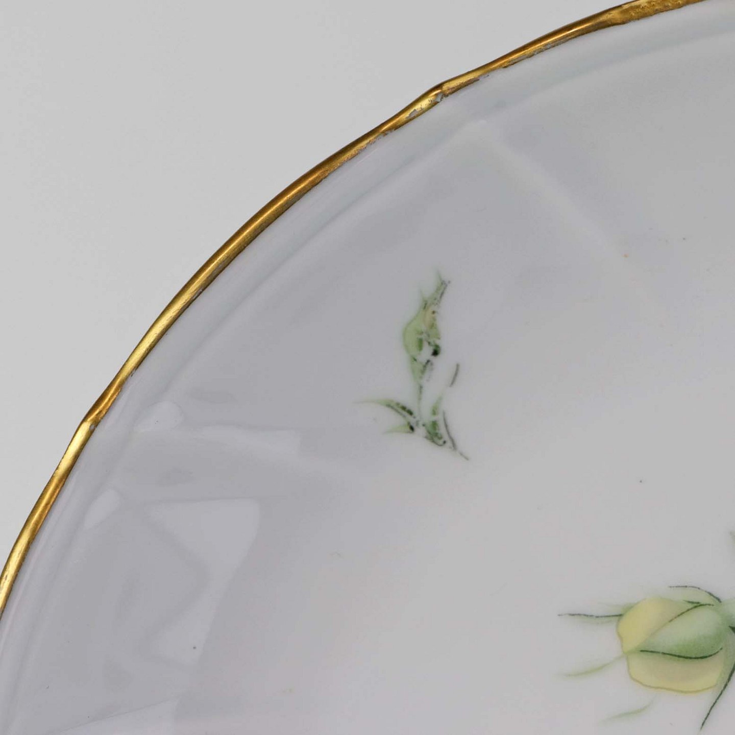 Service i glat hvidt porcelæn med lige knækkede kanter dekoreret med gule blomster og gylden kant